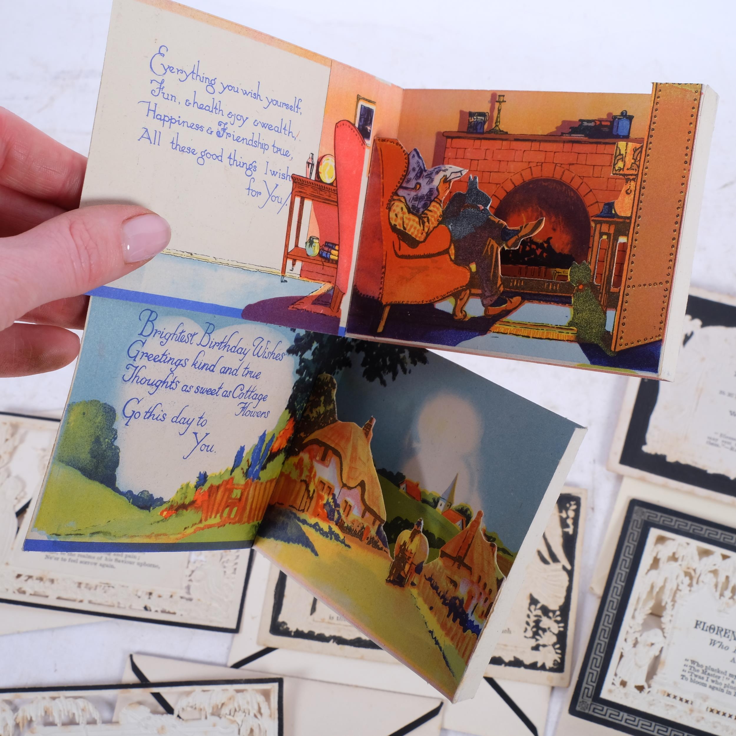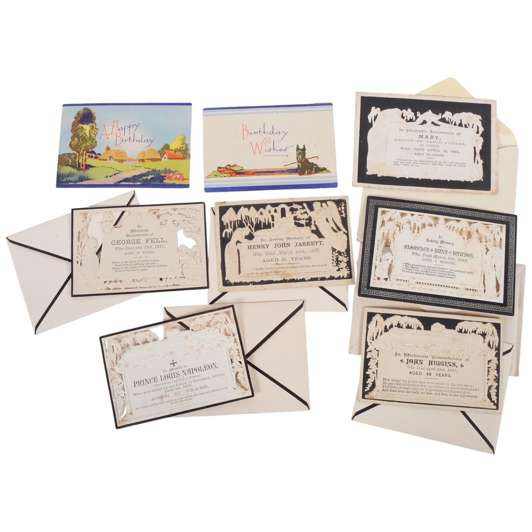 A collection of Victorian mourning cards, including George Fell 1887, Henry John Jarrett 1888, Mary, Relict of David Judges Of Borden 1883, 6 in total, together with 2 Vintage folding birthday cards with 3-dimentional view