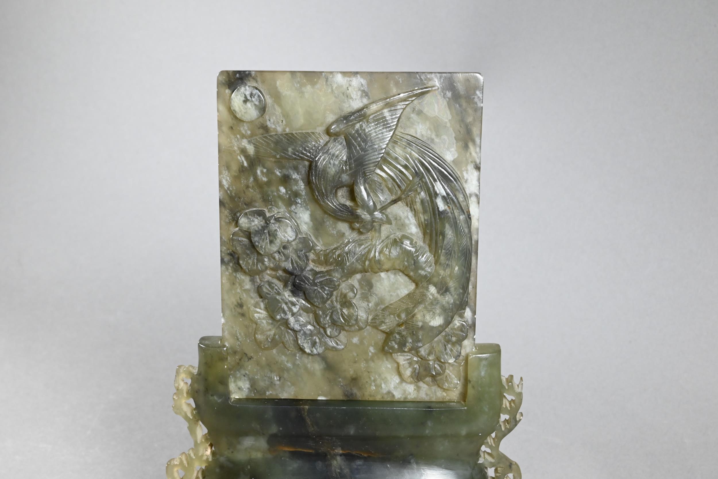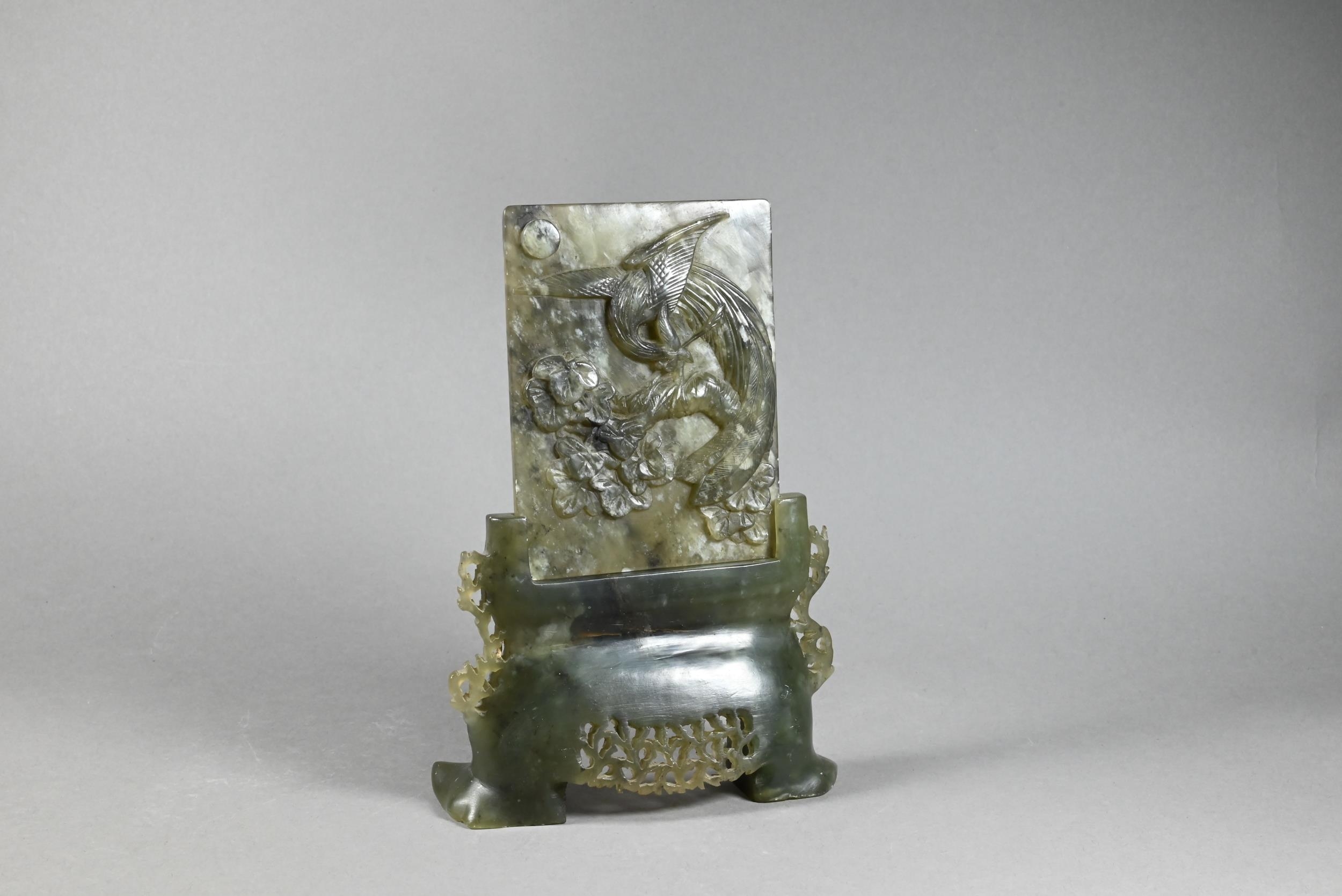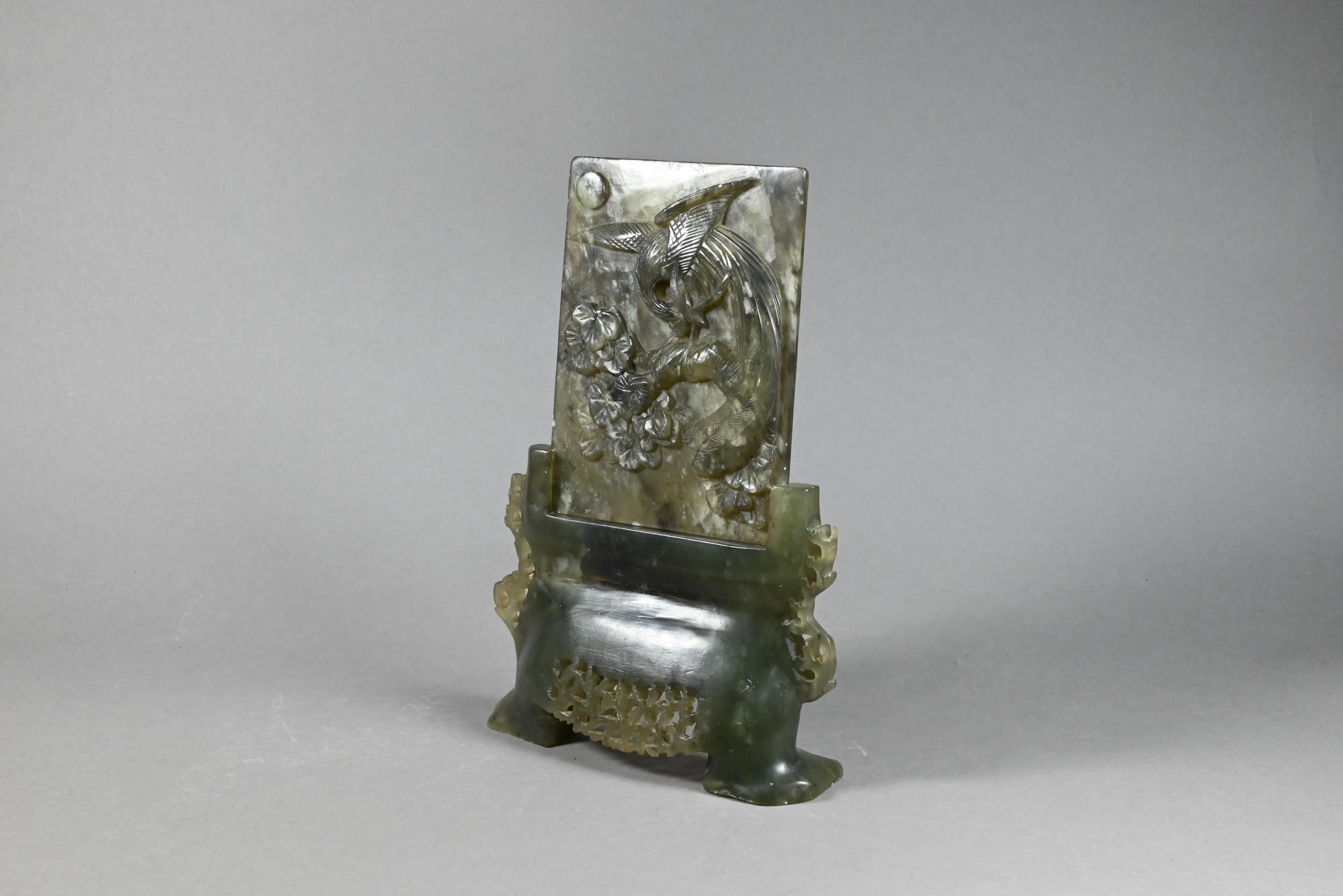 A 20th century Chinese carved 'spinach' soapstone table screen, the mottled green rectangular panels front carved in high relief with a phoenix perching on a leafy tree-branch with plain reverse side, sliding into a naturalistic reticulated stand, post Qing dynasty, 22 cm high x 15 cm w o/a