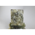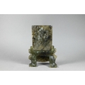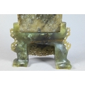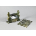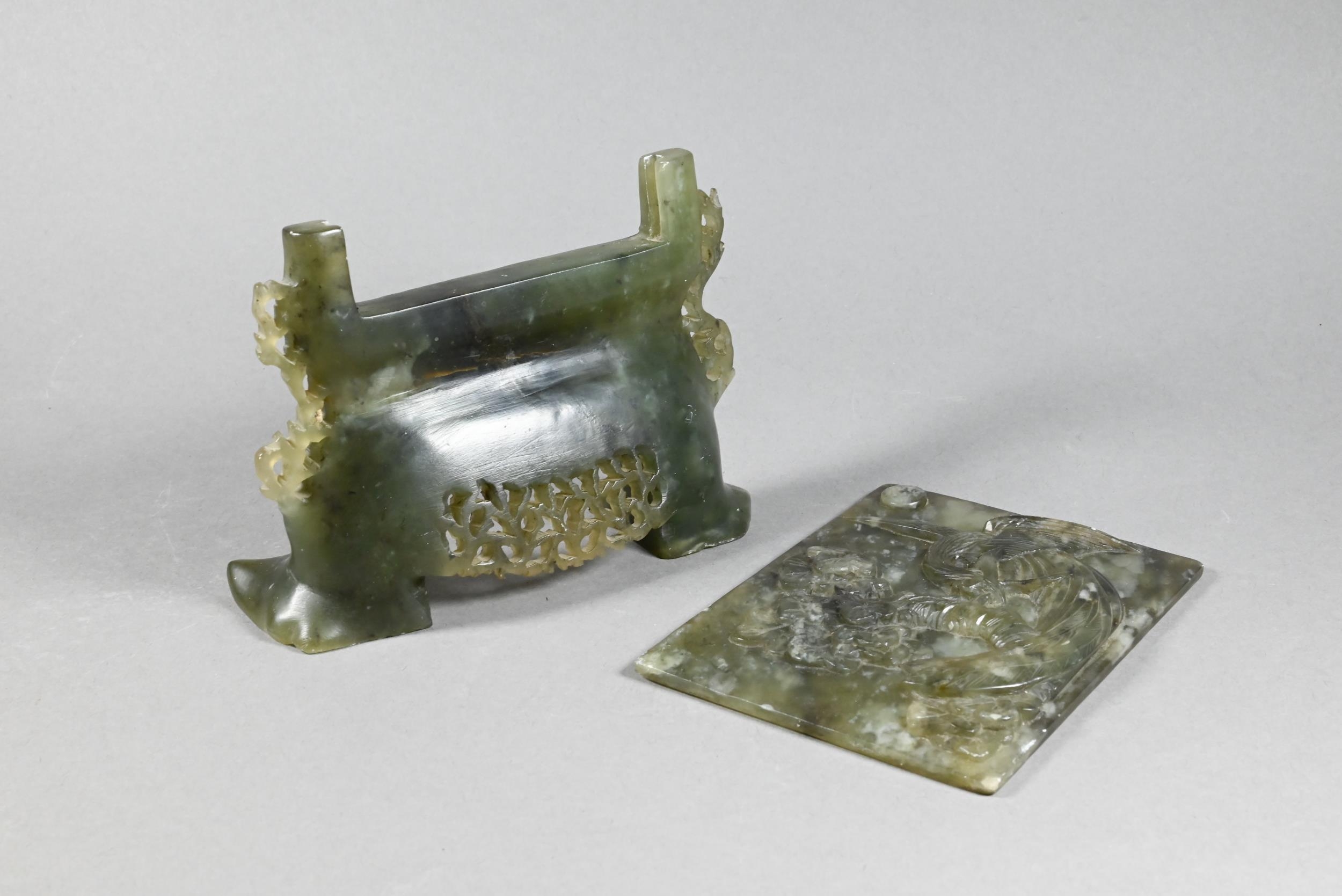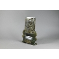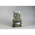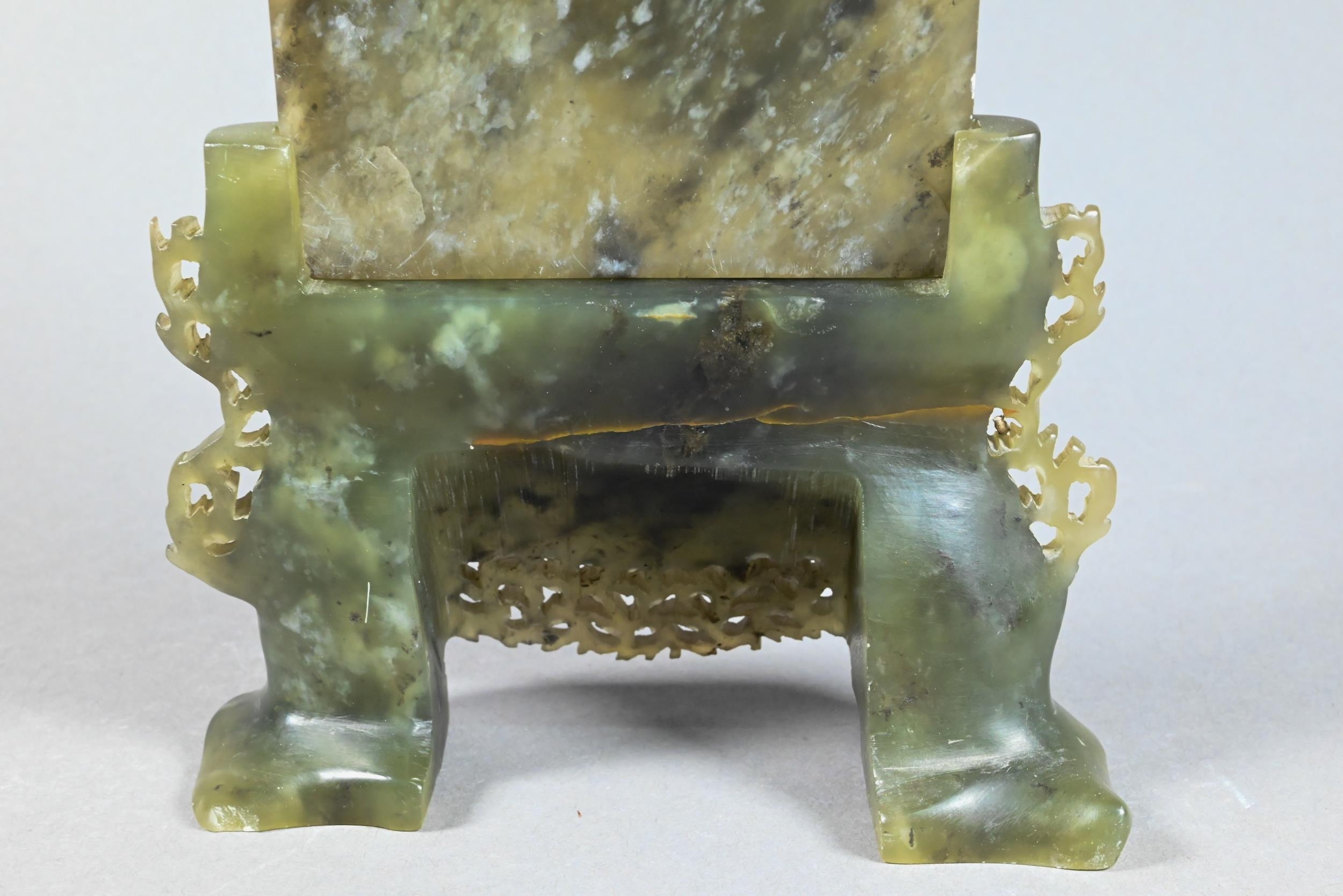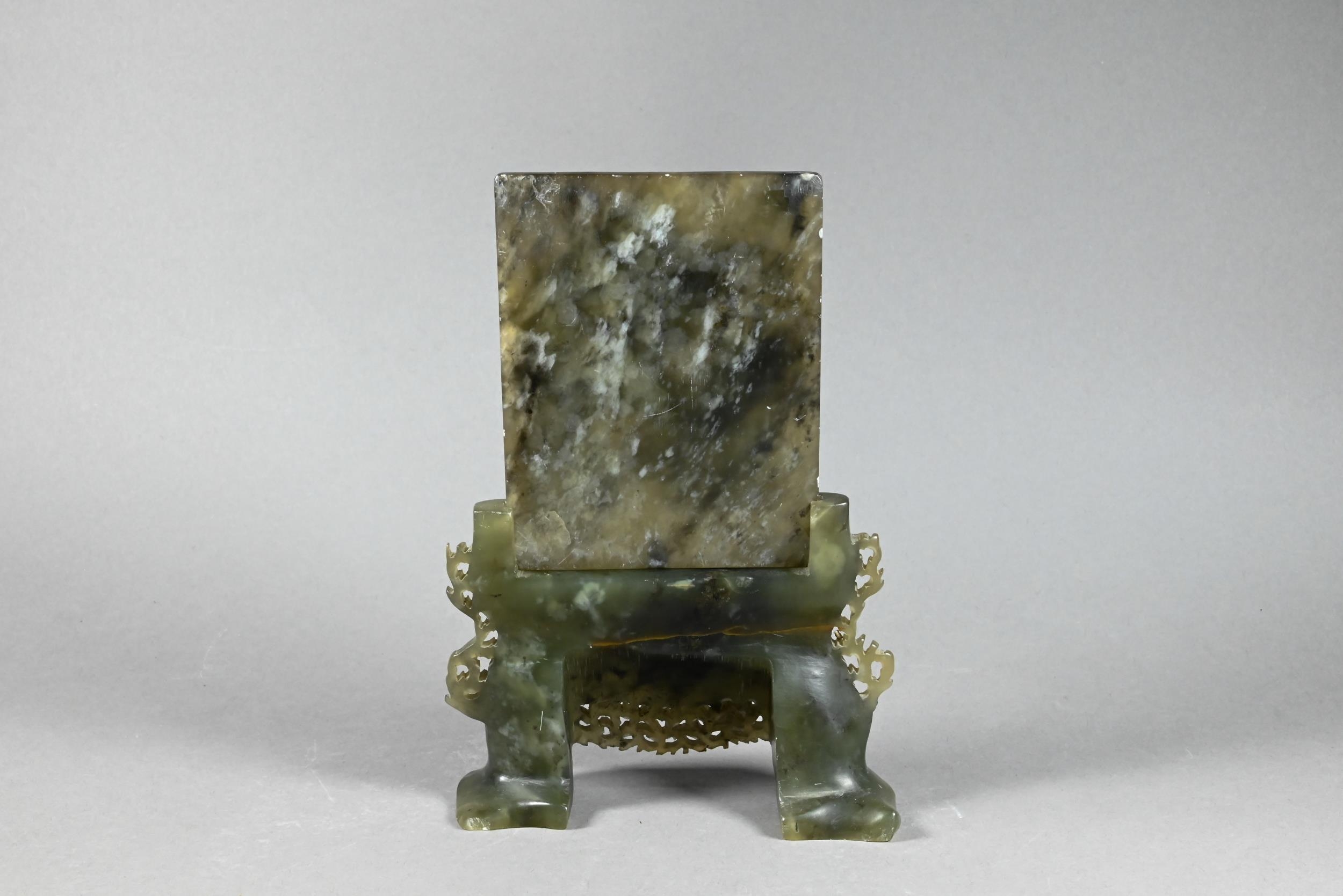 A 20th century Chinese carved 'spinach' soapstone table screen, the mottled green rectangular panels front carved in high relief with a phoenix perching on a leafy tree-branch with plain reverse side, sliding into a naturalistic reticulated stand, post Qing dynasty, 22 cm high x 15 cm w o/a