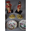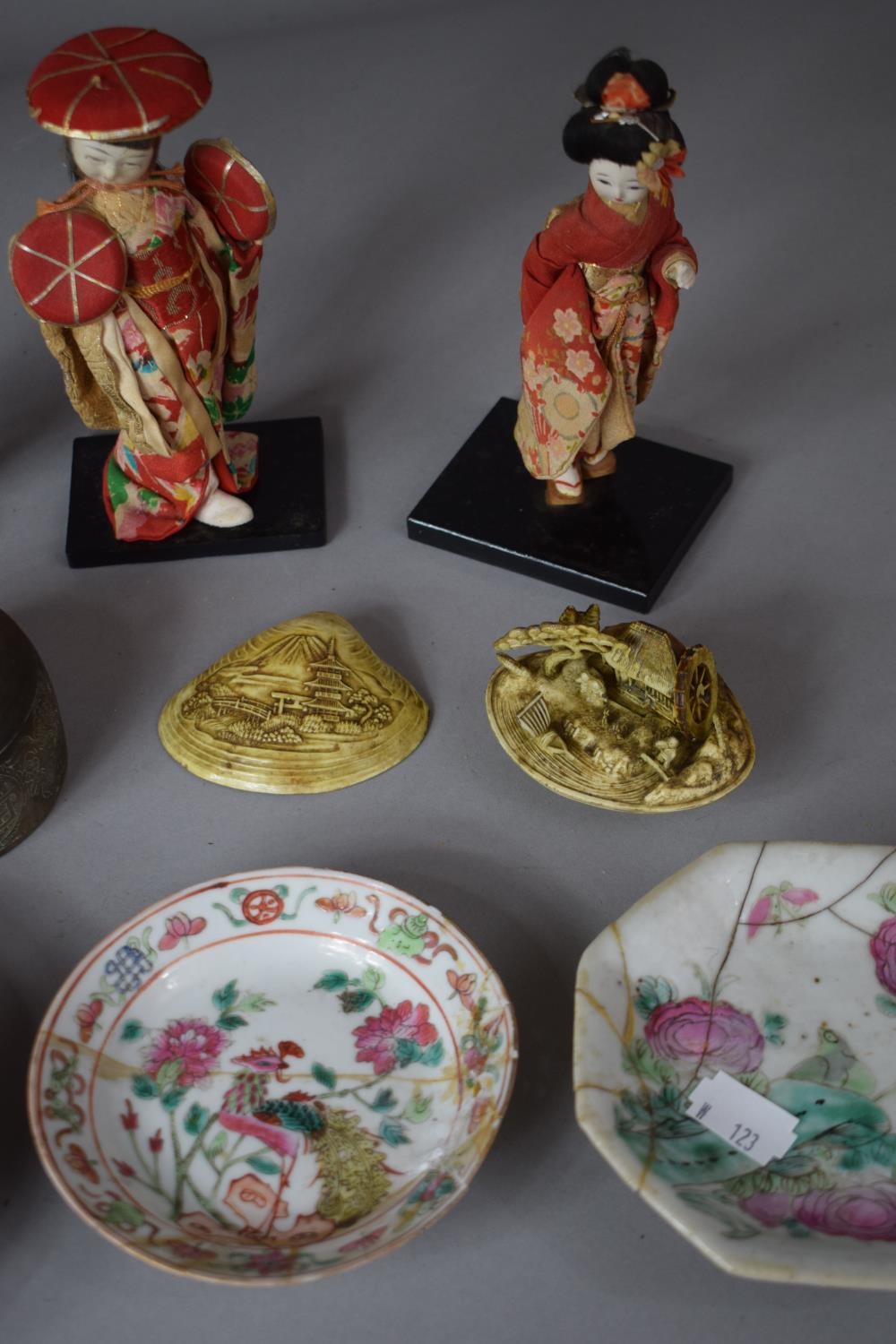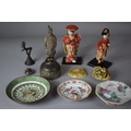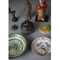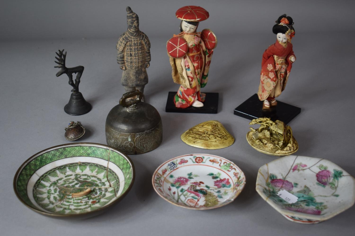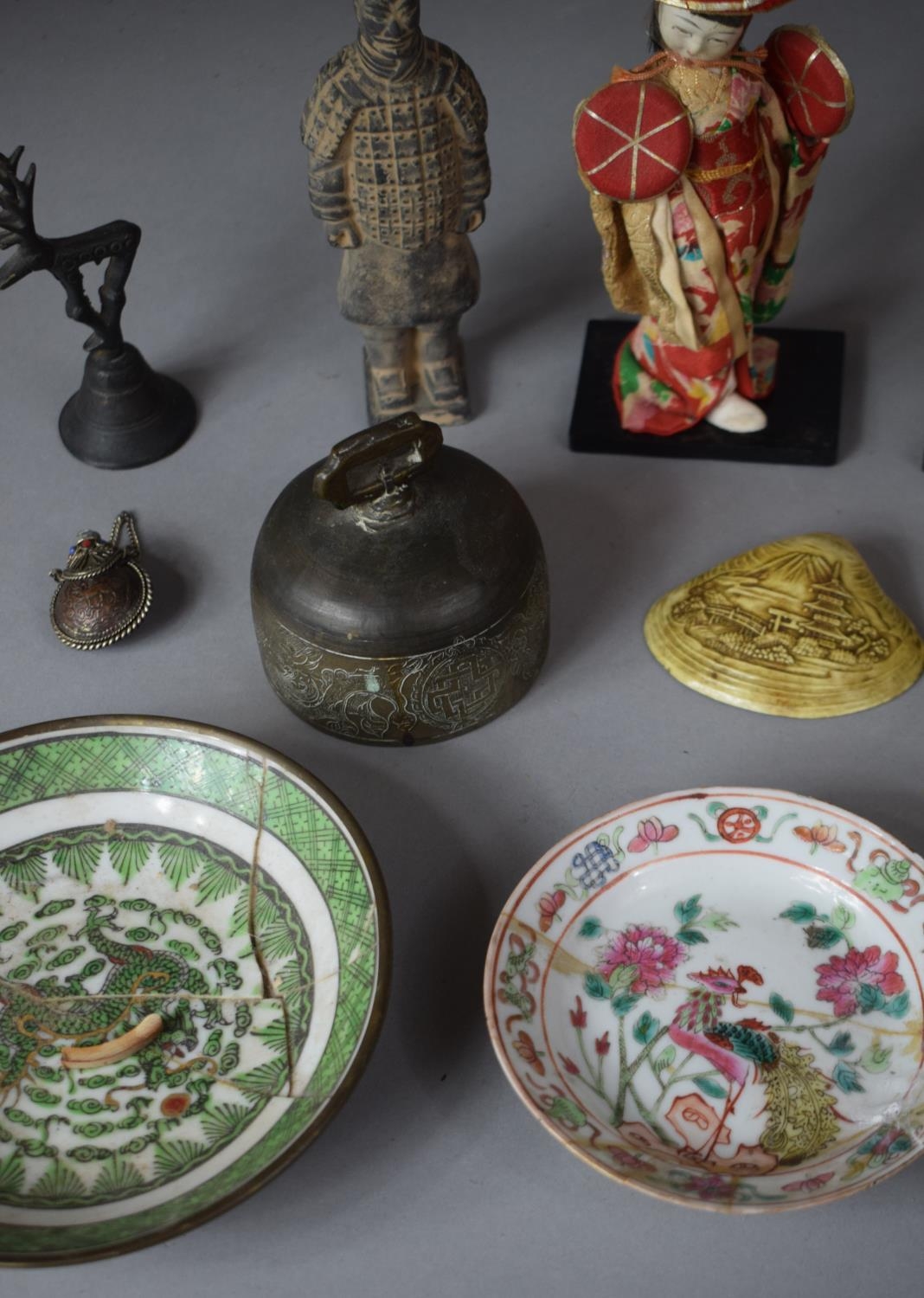 A Collection Of Oriental Items to include Miniature Terracotta Soldier, Bronze Temple Bell with Stag Finial, Chinese Alter Bell, Vintage Geisha Girl Figures, 19th Century Ceramics (AF) Etc