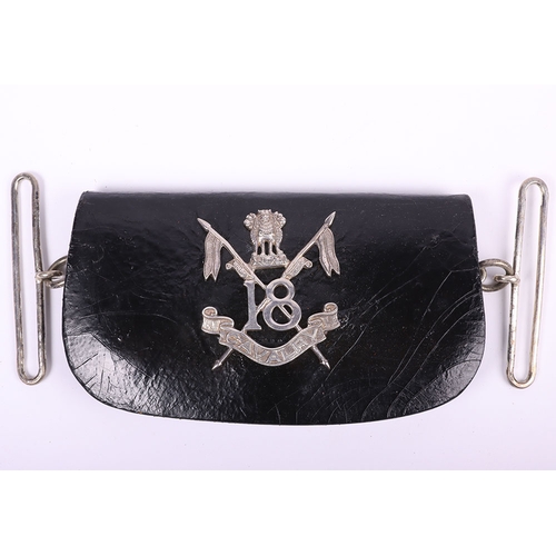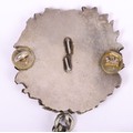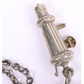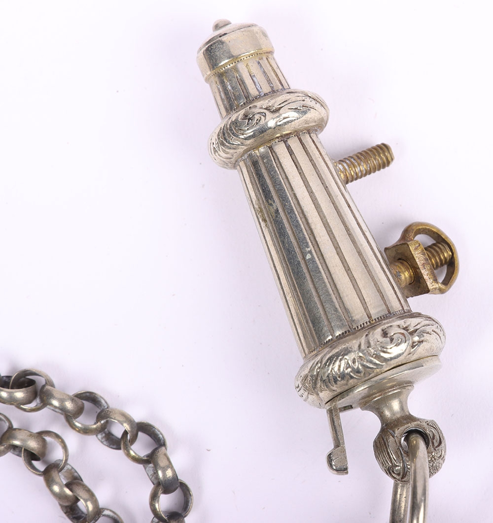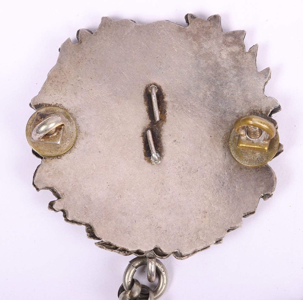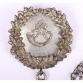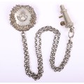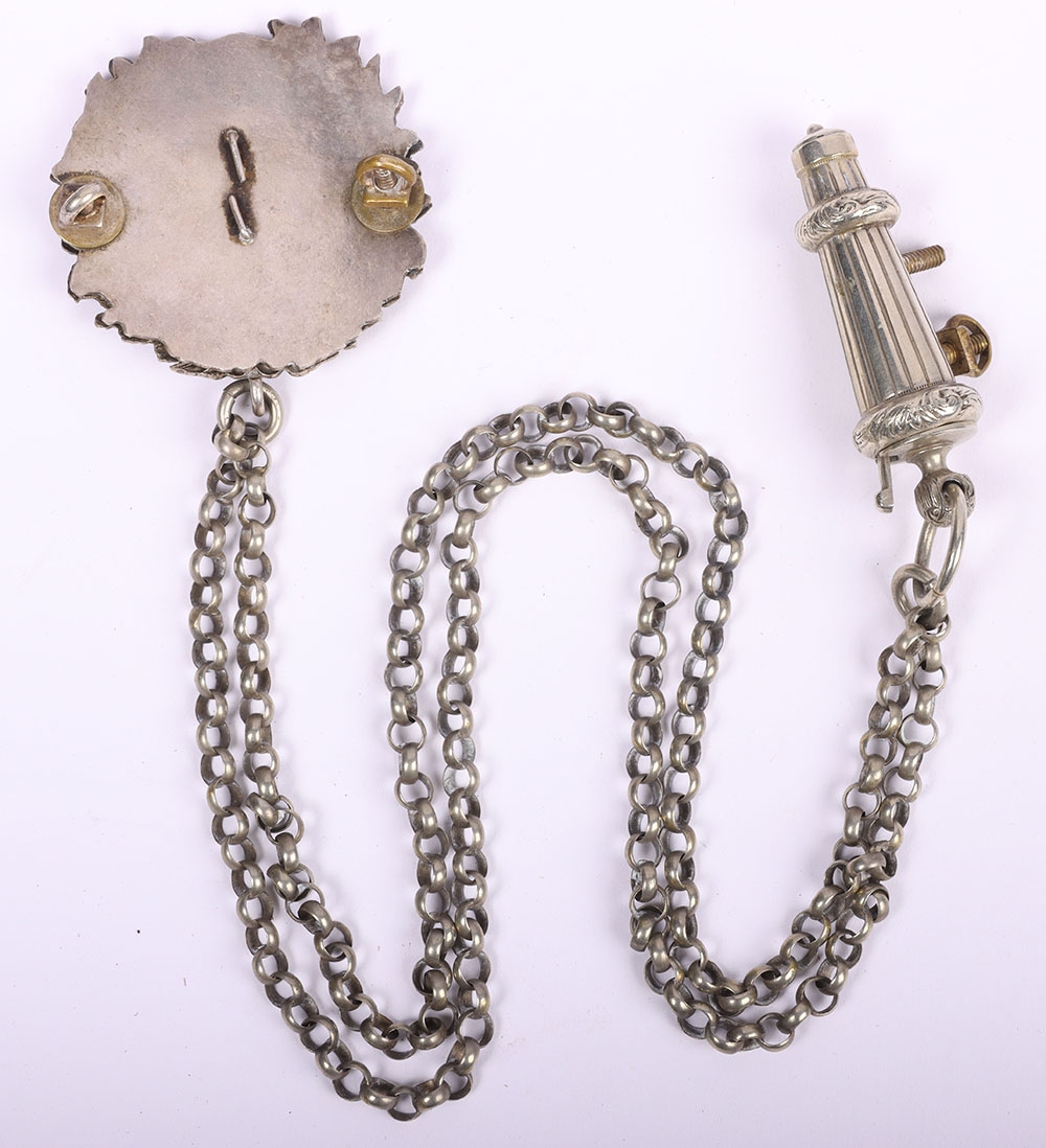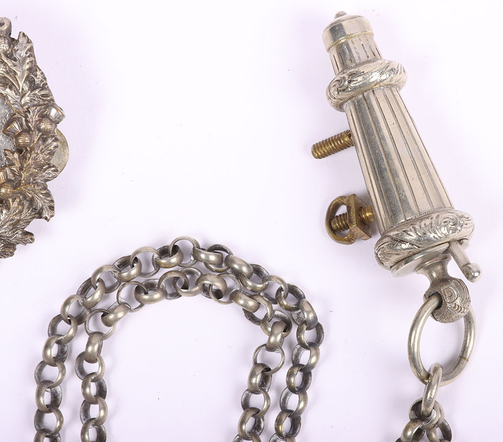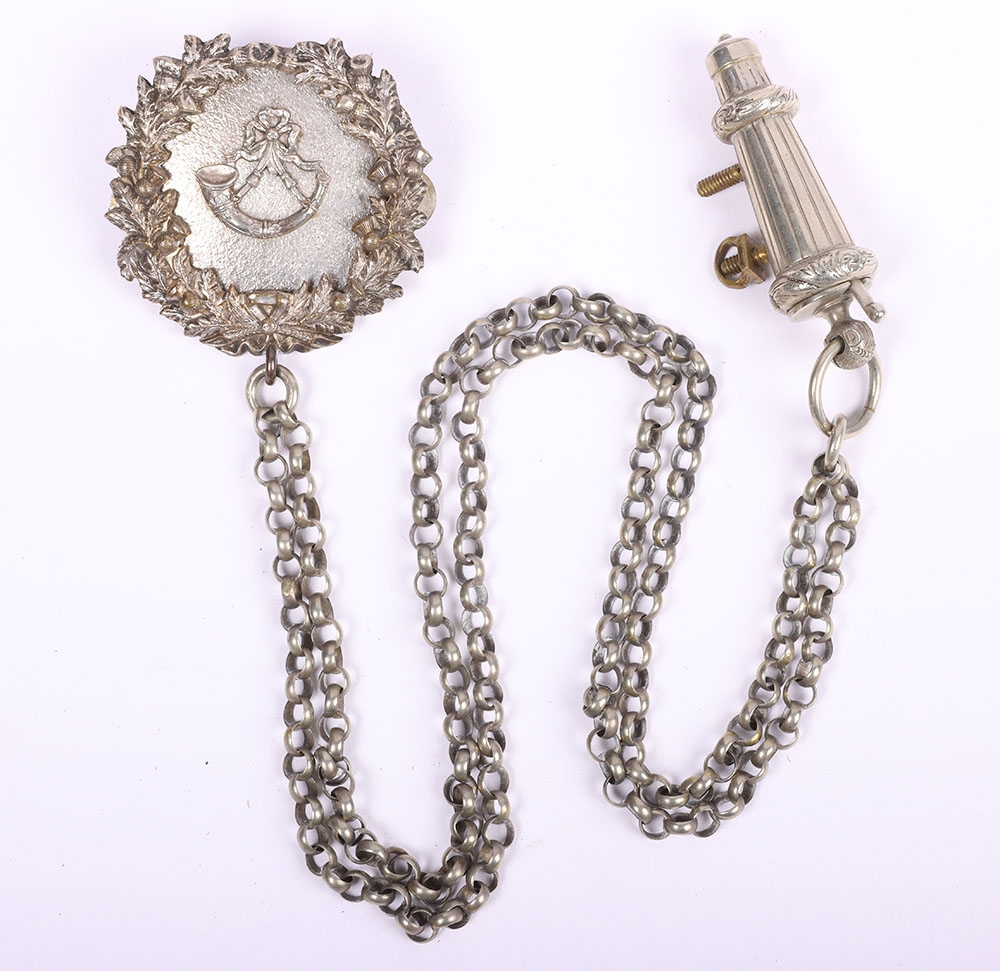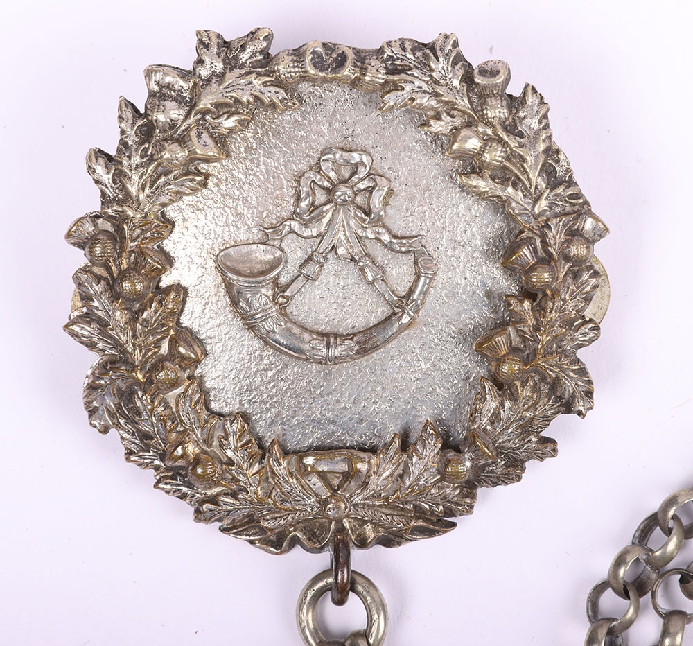 Scottish Rifles / Light Infantry Regiment Officers Cross Belt Fittings, fine white metal cross belt fittings in the form of a white metal circular back plate with strung bugle to the centre and separate thistle wreath, Linked chain leading to white metal whistle in socket mount. Screw post fittings to the reverse.