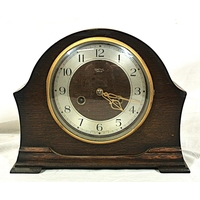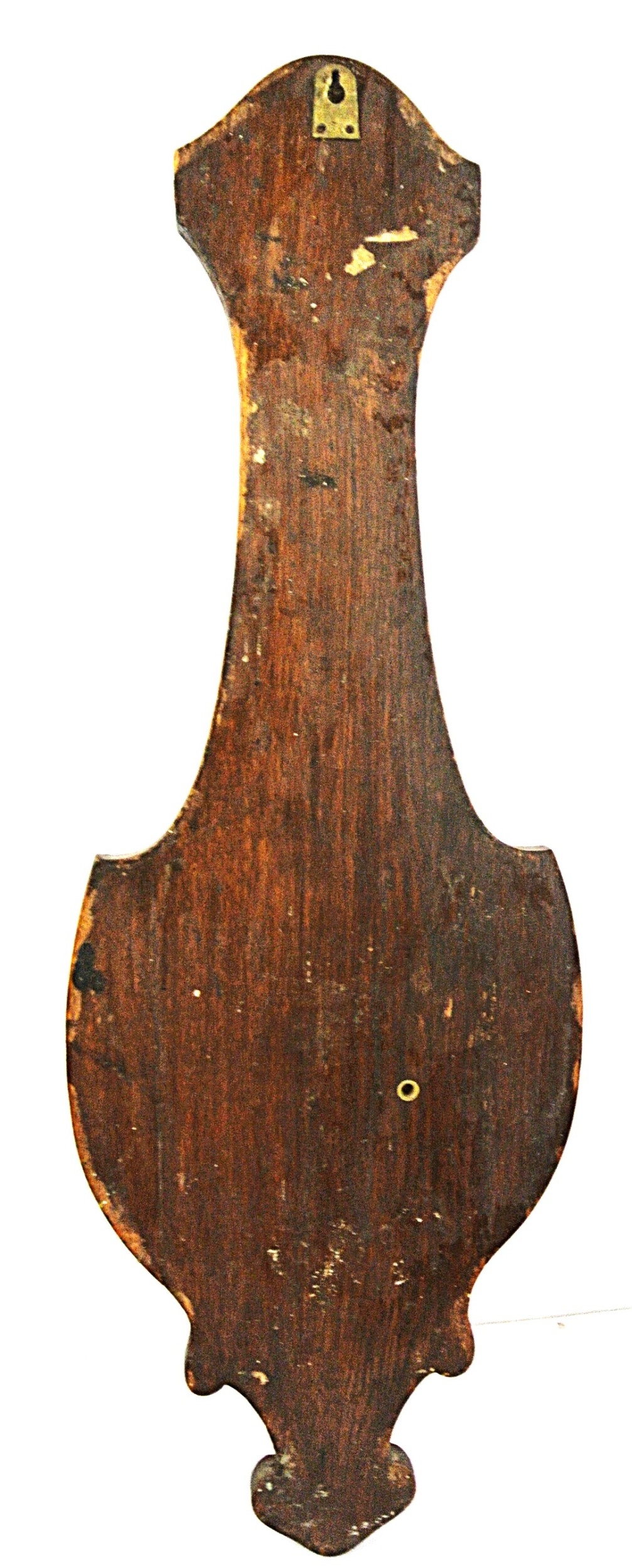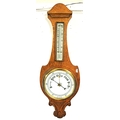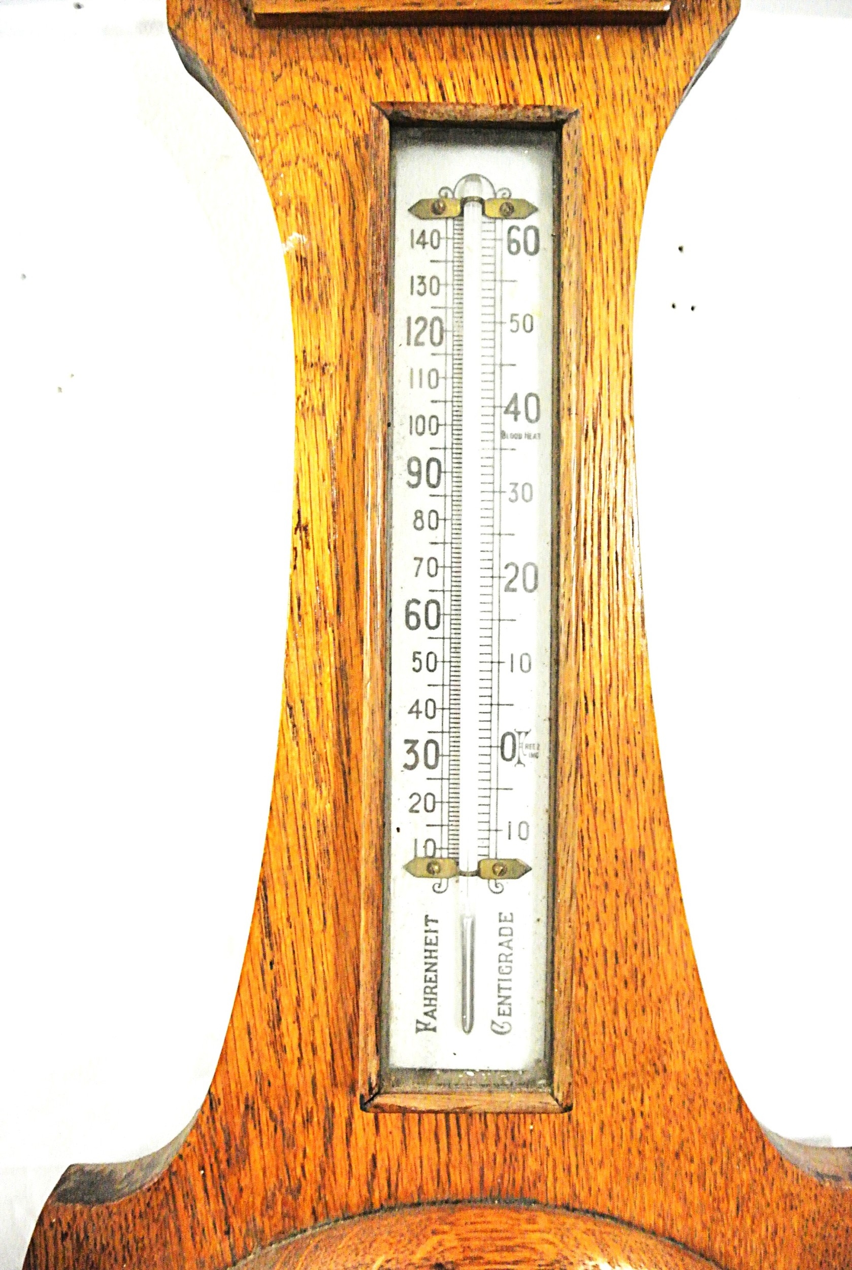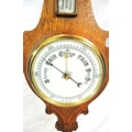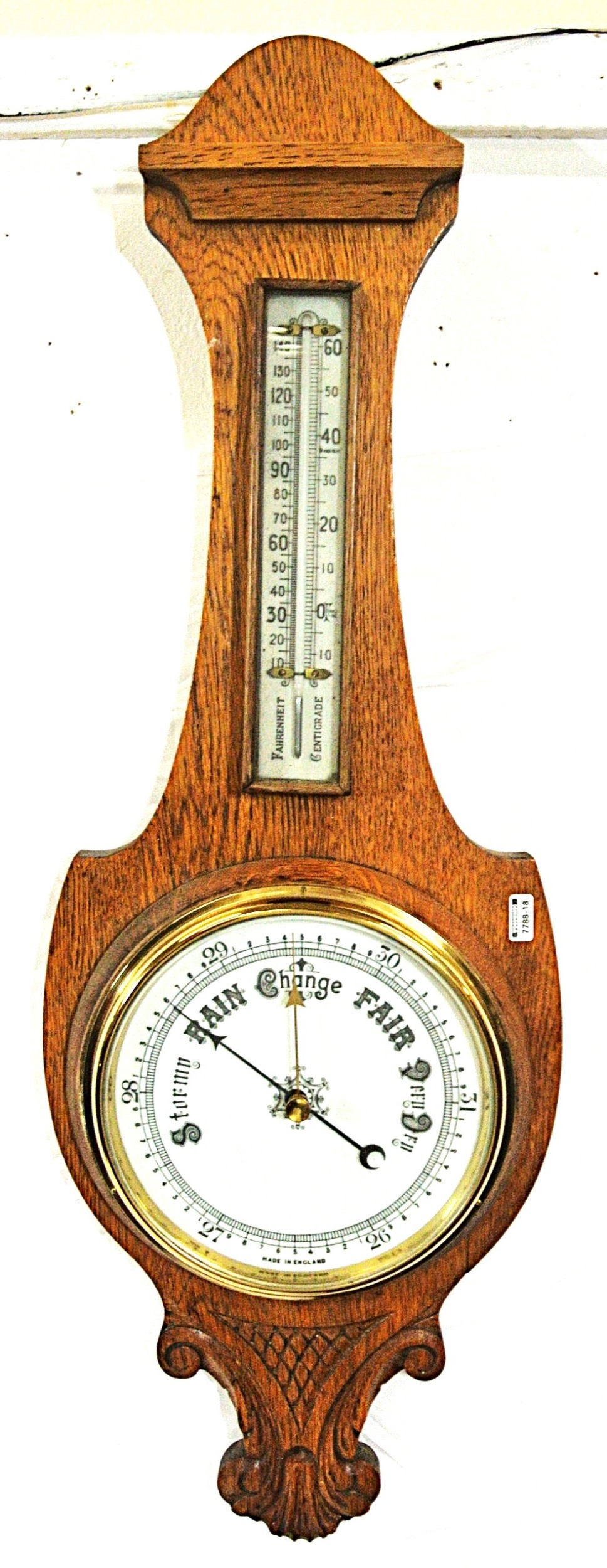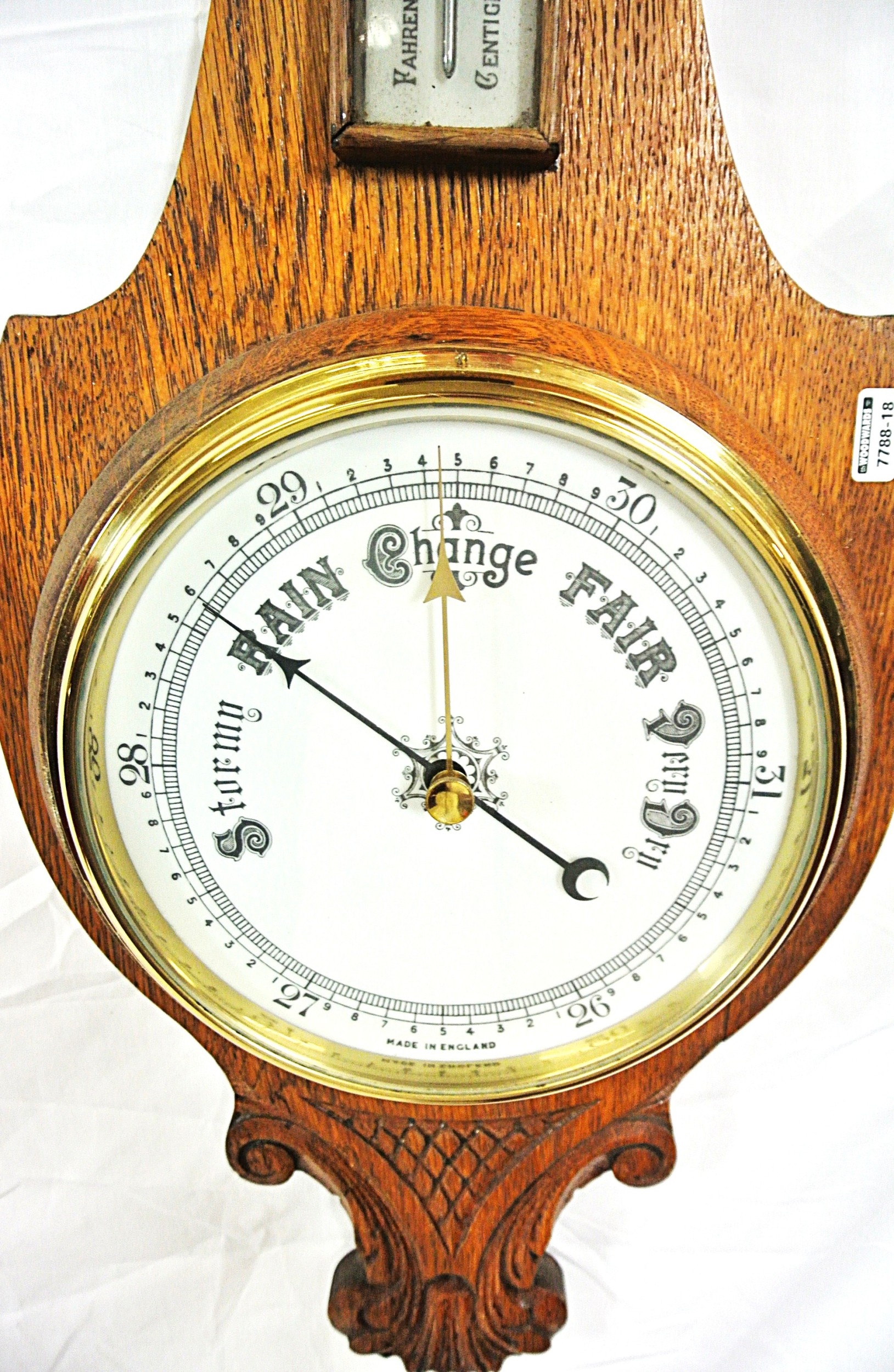 Edwardian style oak wheel barometer with brass framed dial and thermometer