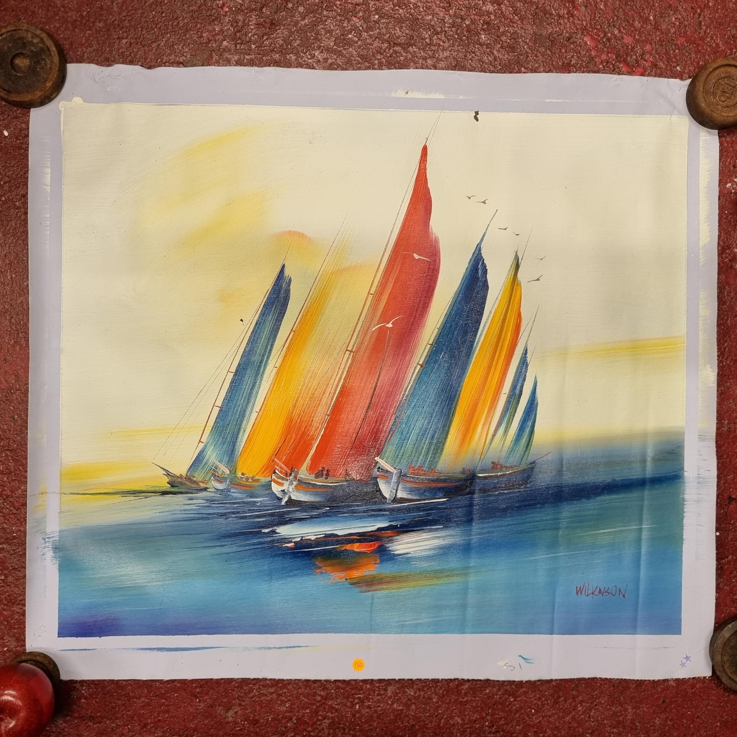 An original oil painting on canvas featuring sail boats with brightly coloured sails, racing on a still sea. Signed bottom right Wilkinson.