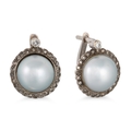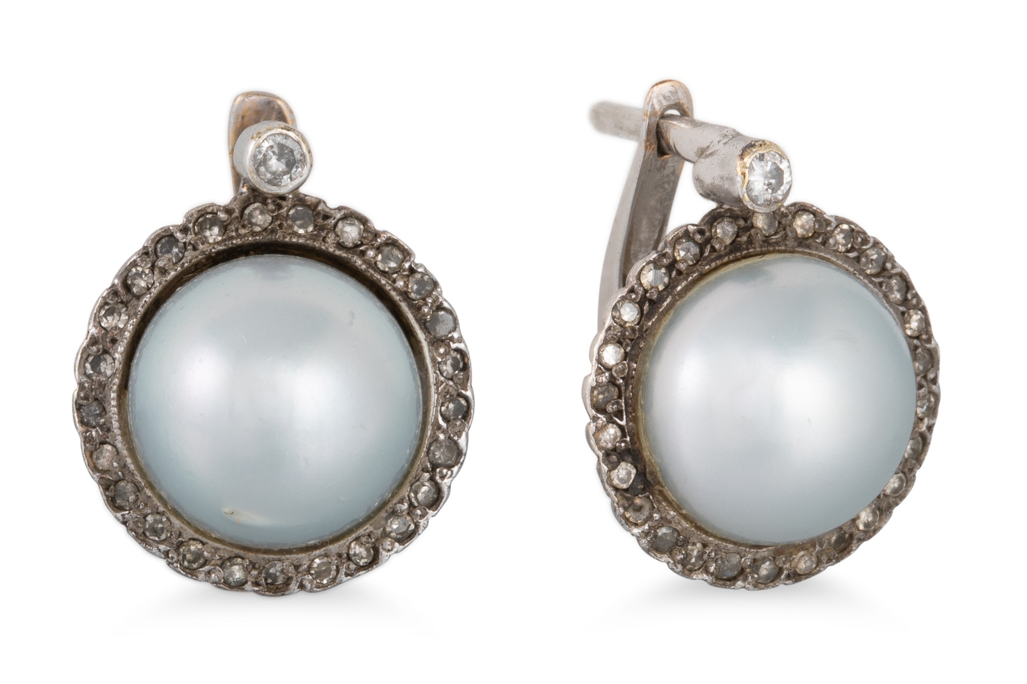 A PAIR OF MABÉ PEARL AND DIAMOND SET EARRINGS, to an old rose cut diamonds surround, mounted in white gold