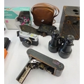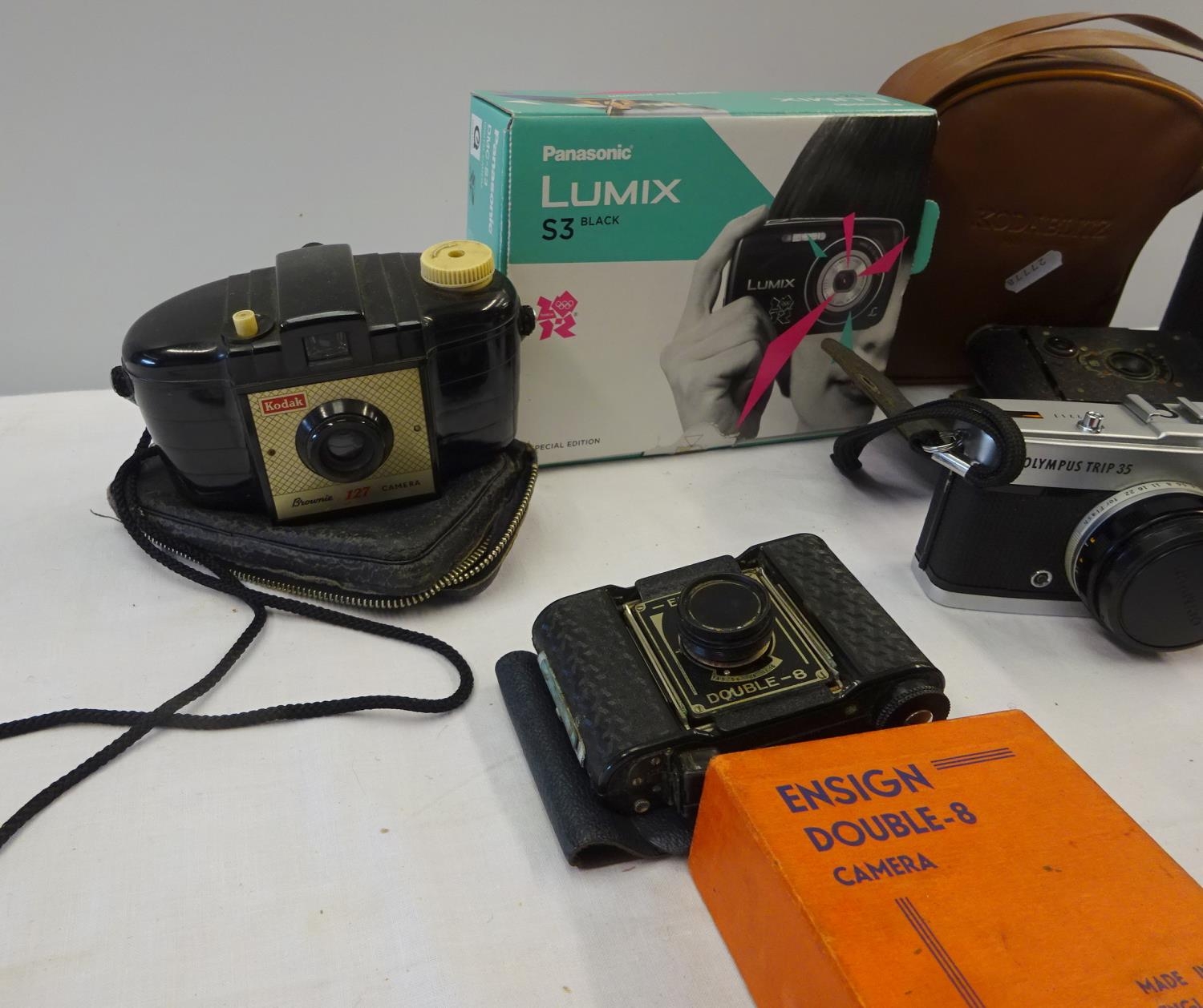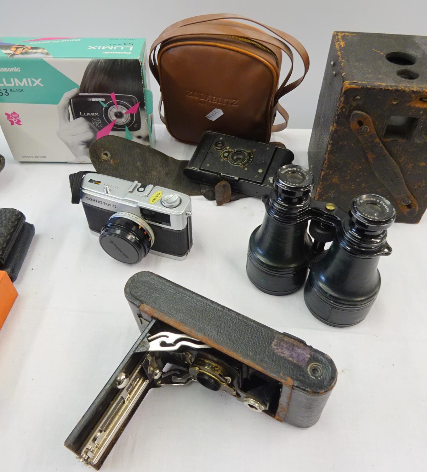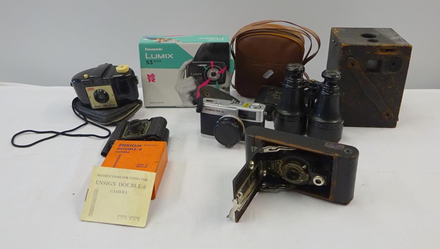 A quantity of various cameras etc to include an Ensign double 8, Kodak, Olmpus, Luminx together with a pair of Reynolds & Branson binoculars.
