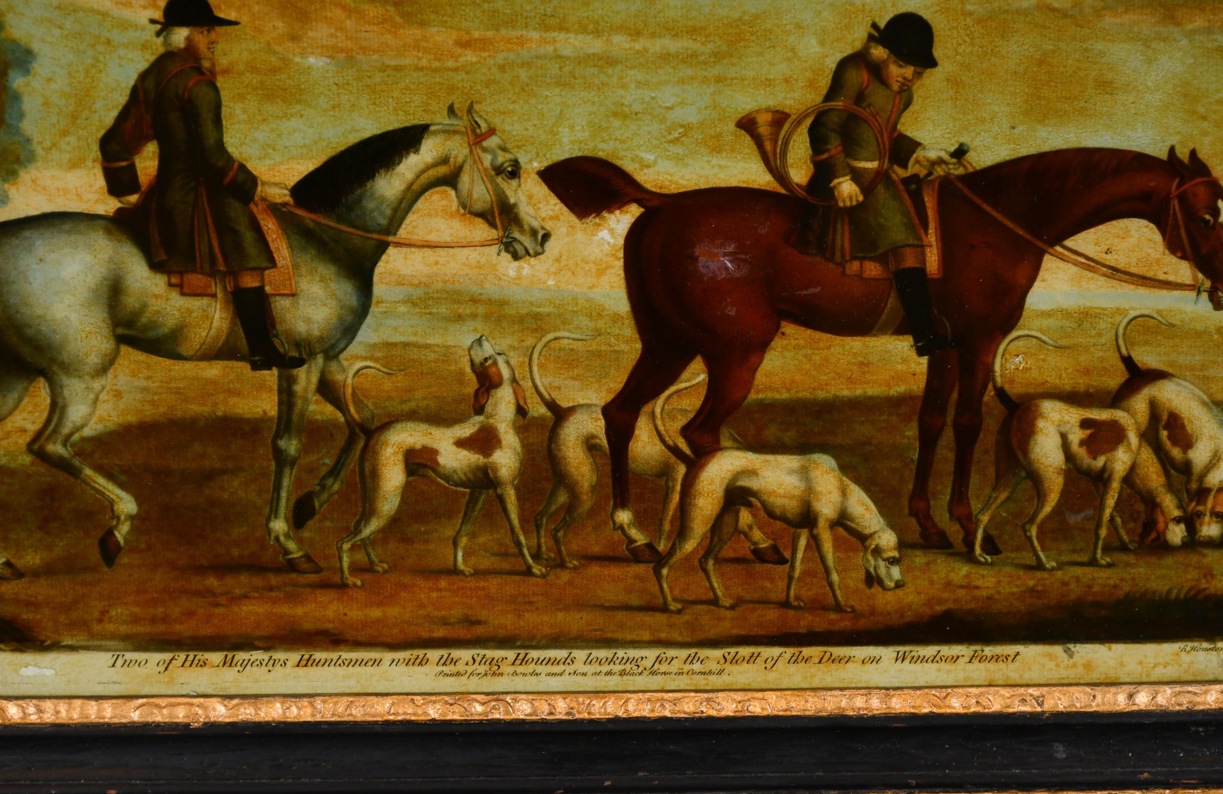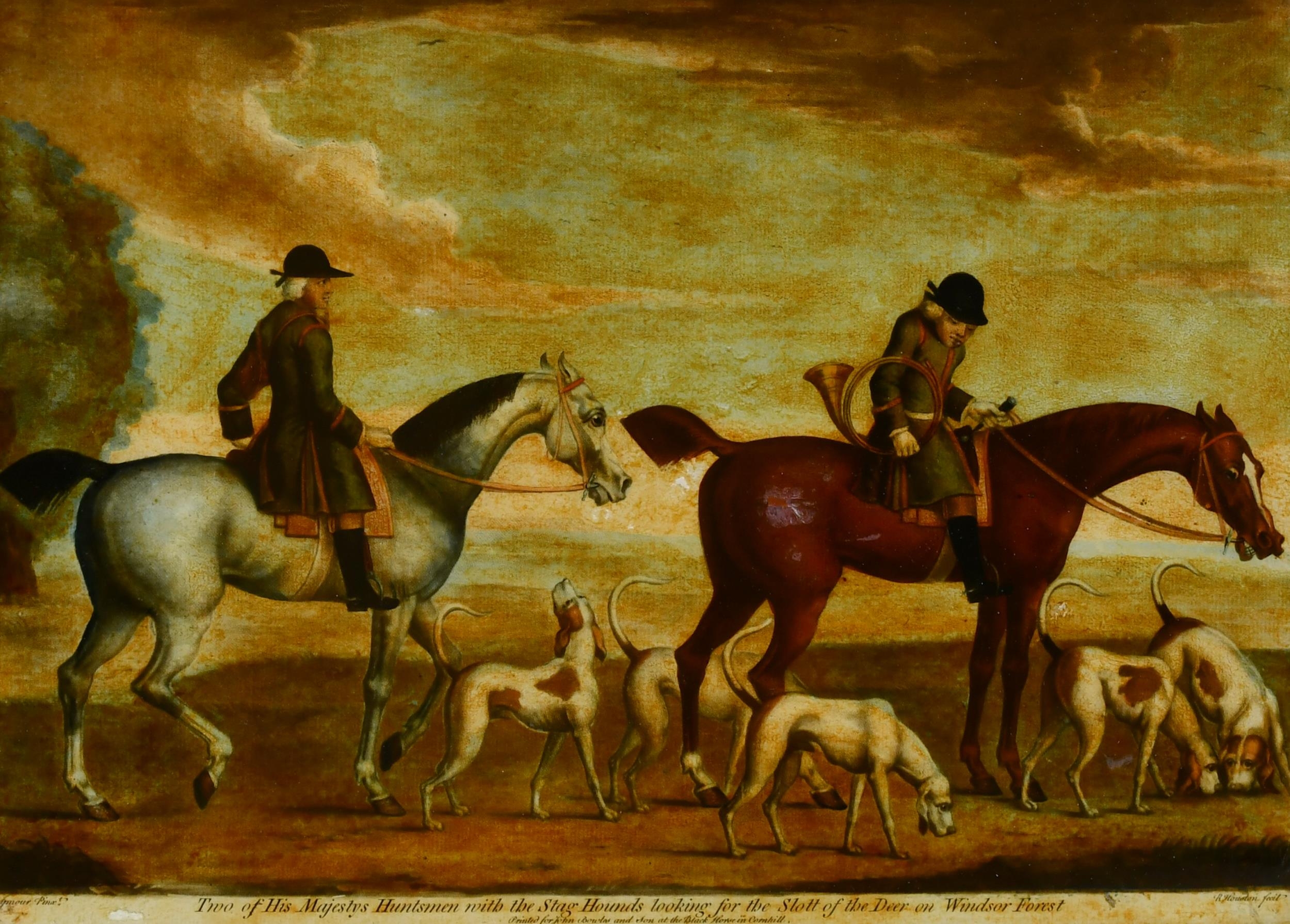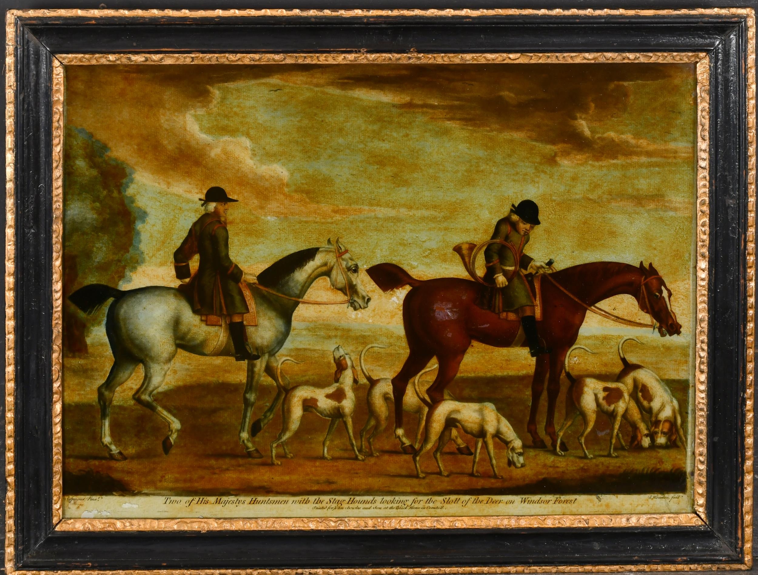 After James Seymour (c.1702-1752) British. "Two of His Majestys Huntsmen with the Stag Hounds looking for the slot of the deer on Windsor Forest", Engraving by R Houston on glass, 10.25" x 14" (26 x 35.5cm) and another by the same hand (2)