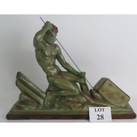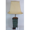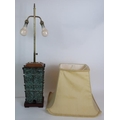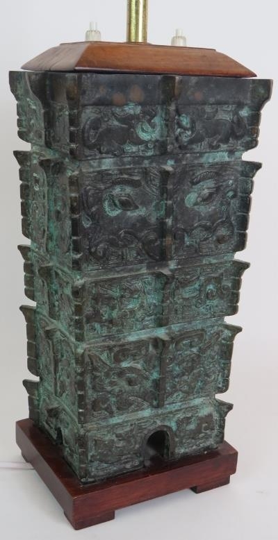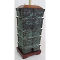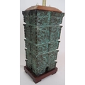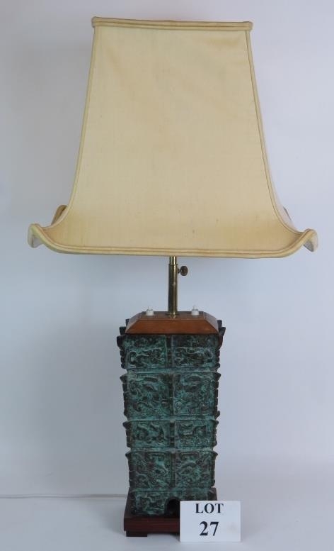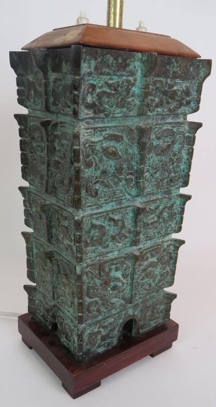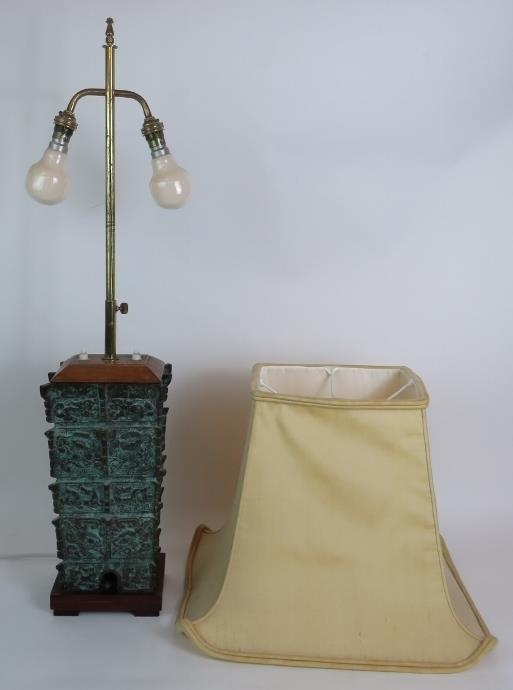 A bronze based table lamp cast in the Chinese Shang Dynasty style, C1930s, with double lamp holder and Pagoda style shade. Overall height with shade: 85cm.