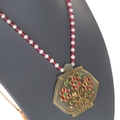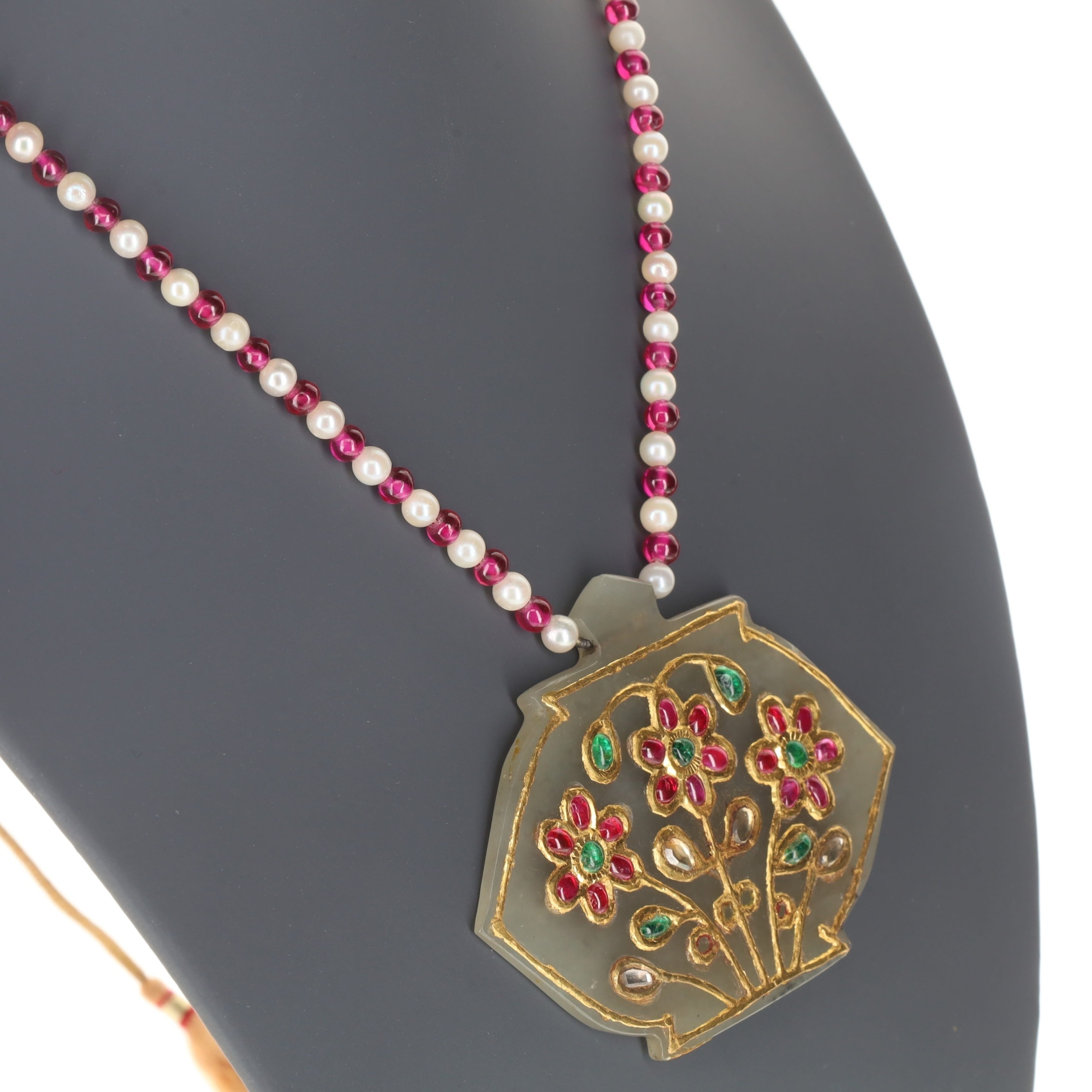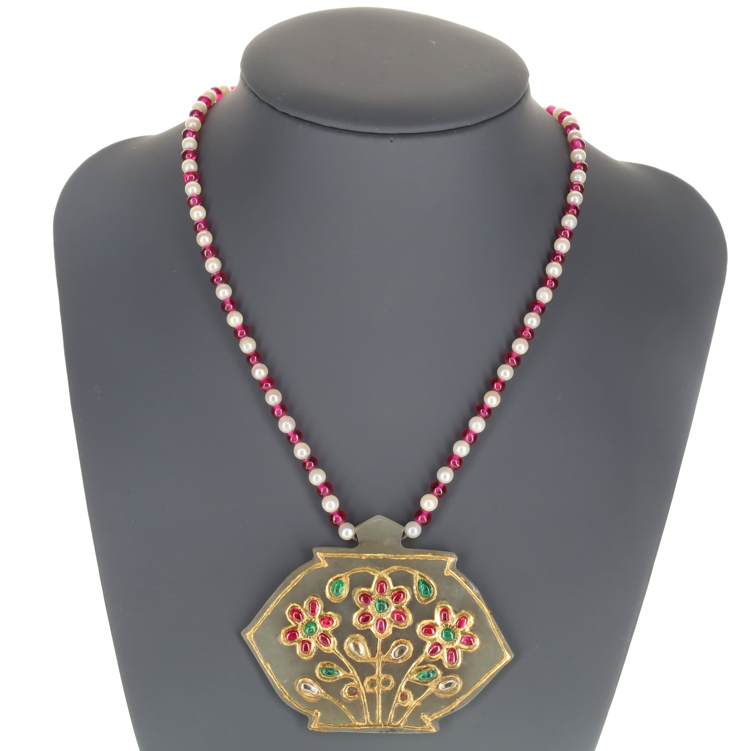 Indian Synthetic Ruby and Cultured Pearl Gold Mounted Necklace with Pendant