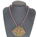 Indian Synthetic Ruby and Cultured Pearl Gold Mounted Necklace with Pendant. Necklace measures approx. 82cm, pendant measures approx. 5 x 6.5cm. Weighs in total 32.8g.
