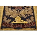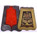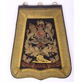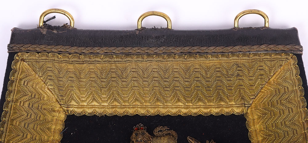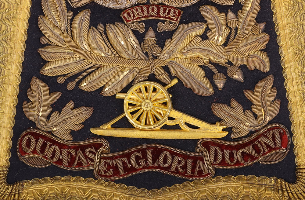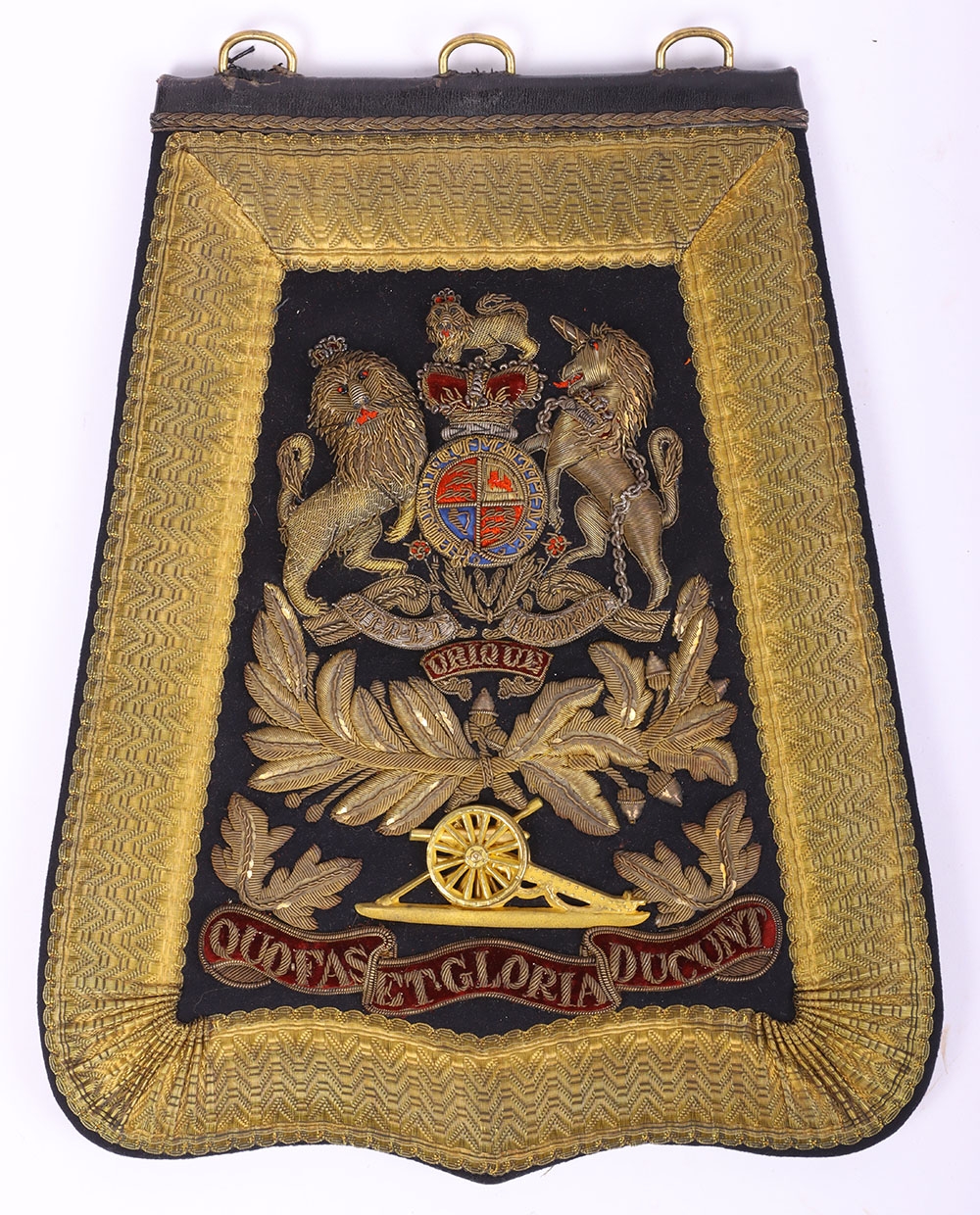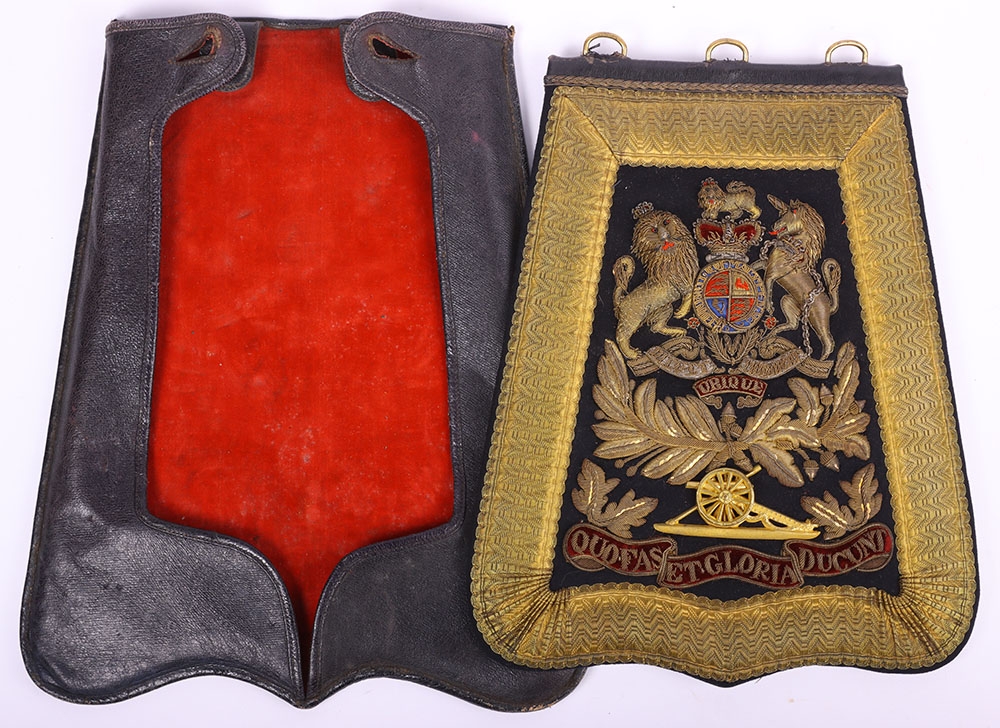 Victorian Royal Artillery Full Dress Sabretache, fine example with gilt bullion wire central Victorian crowned royal arms over bullion oakleaves, gilt metal artillery field gun and velvet lower scroll with motto. Lace to the edge. Complete with the leather flap pouch to the reverse and the foul weather cover. Bullion work all remains bright. Good example.