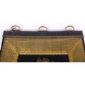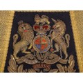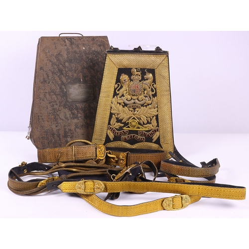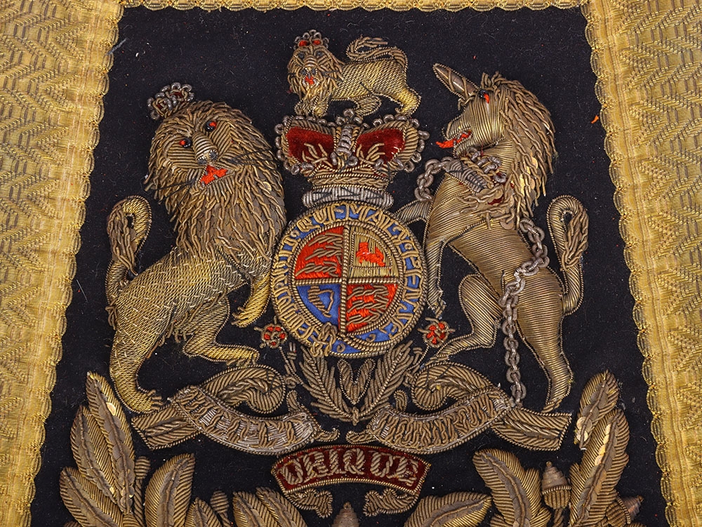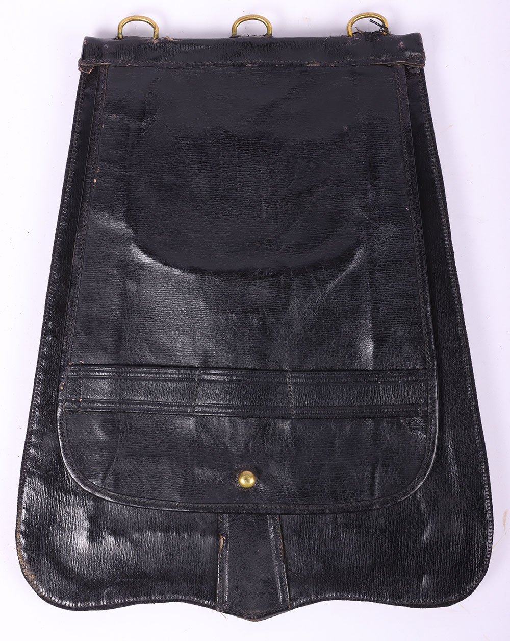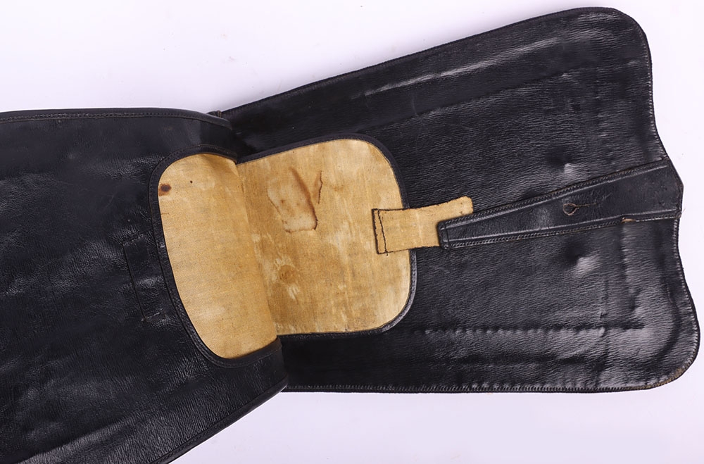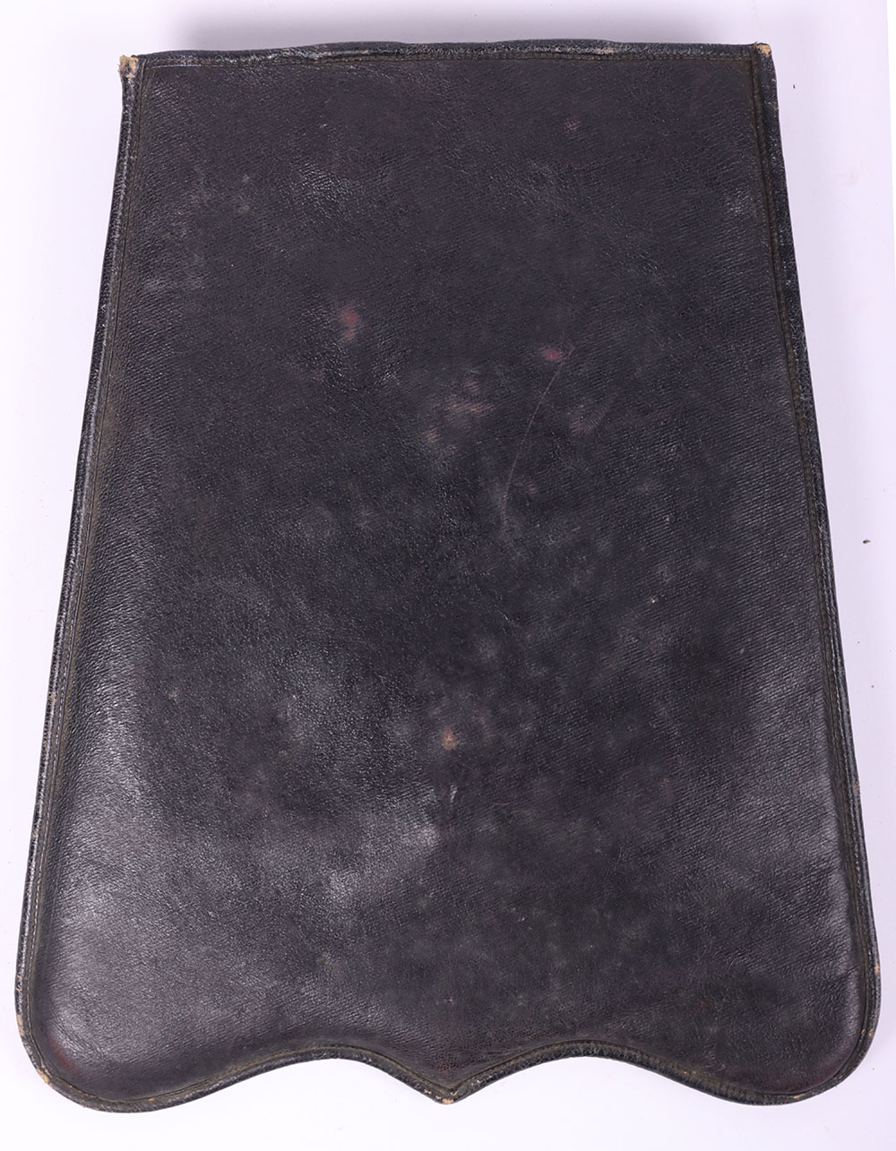 Victorian Royal Artillery Full Dress Sabretache, fine example with gilt bullion wire central Victorian crowned royal arms over bullion oakleaves, gilt metal artillery field gun and velvet lower scroll with motto. Lace to the edge. Complete with the leather flap pouch to the reverse and the foul weather cover. Bullion work all remains bright. Good example.