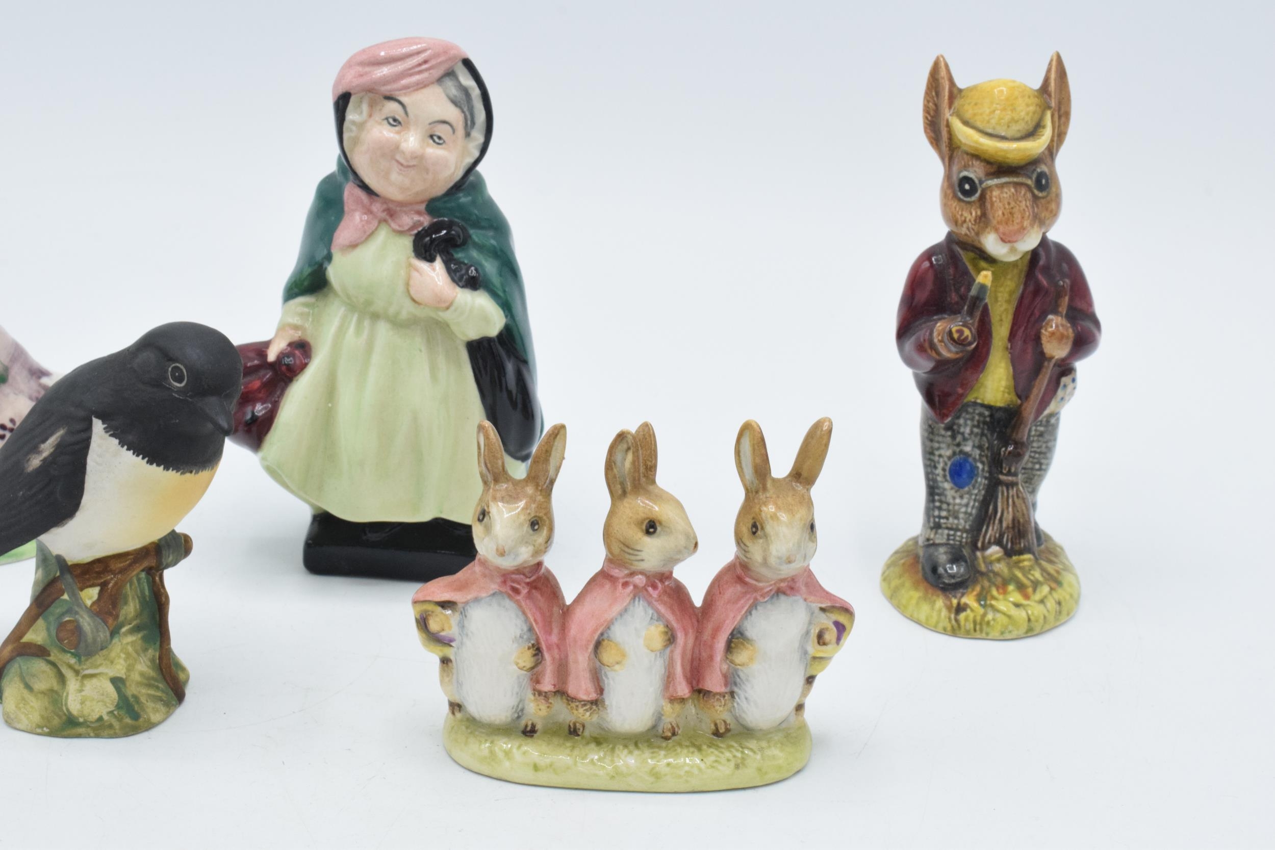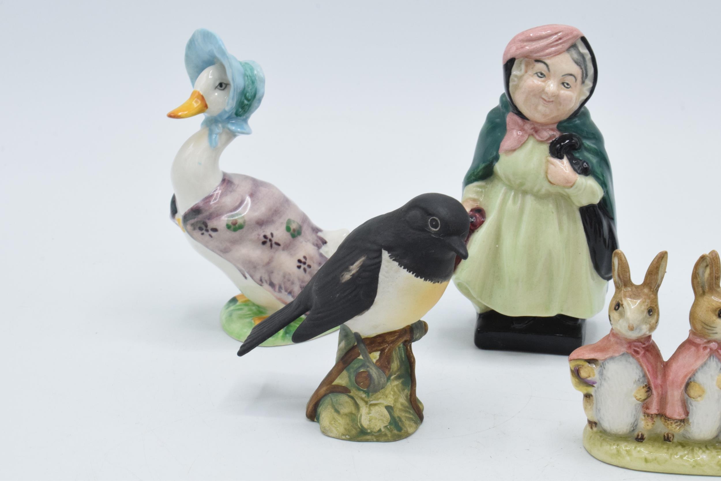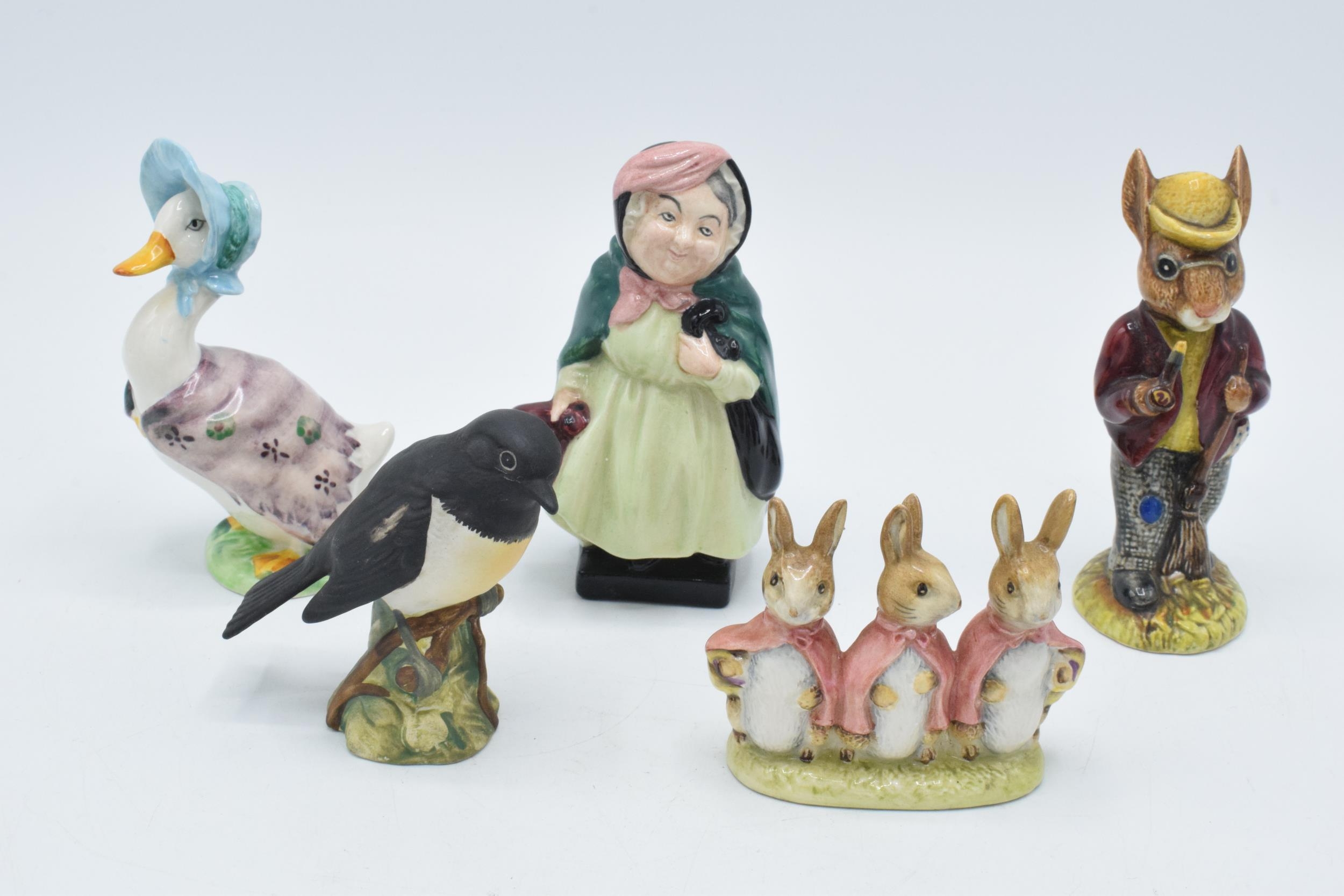 A collection of pottery to include Beswick Beatrix Potter figures x 2, Doulton Bunnykins, Doulton Sairey Gamp and a matte Beswick stonechat (5).