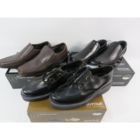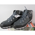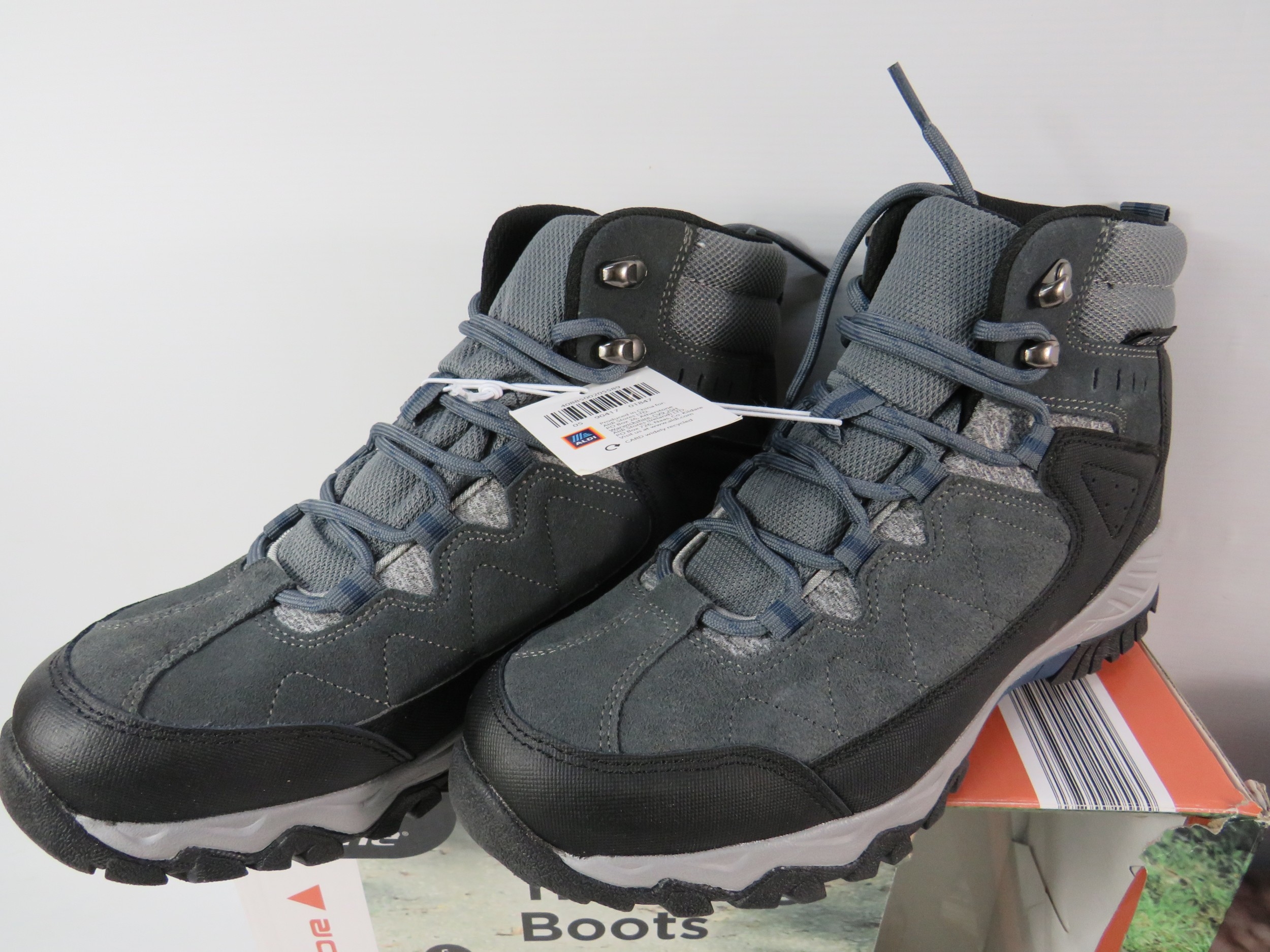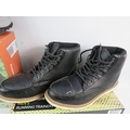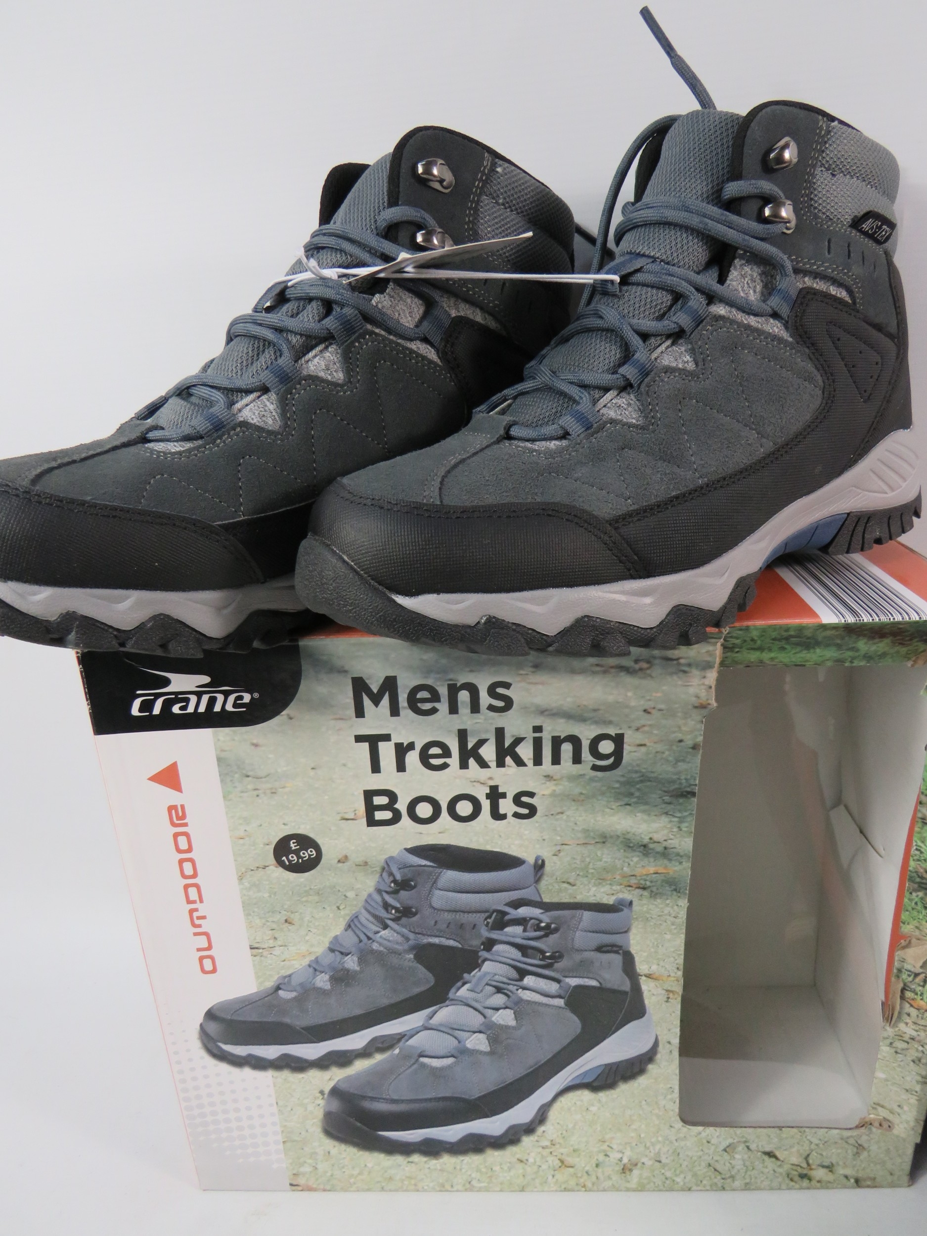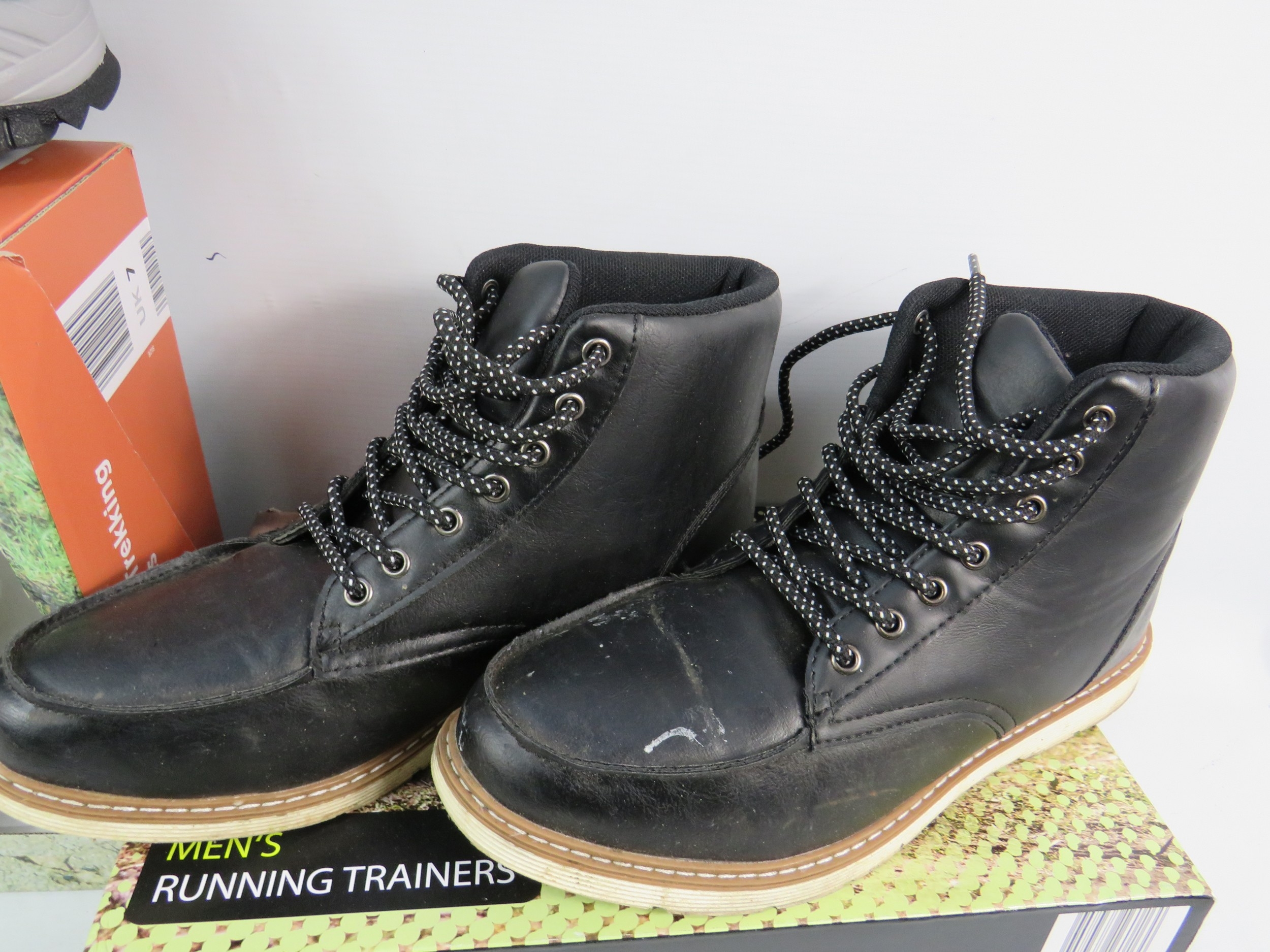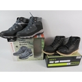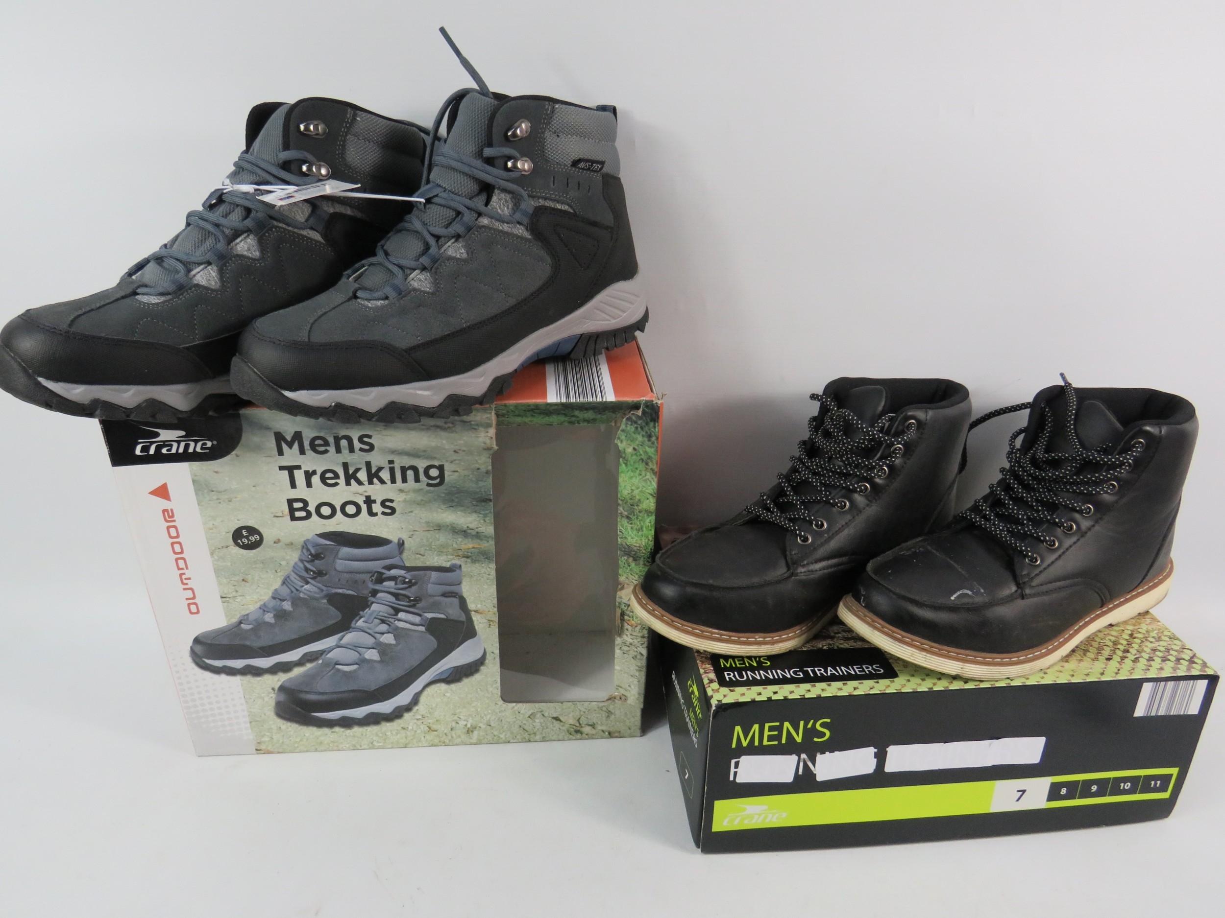Collection of men's footwear, all UK size 7, with original boxes. Includes pair of Crane brand men's trekking boots in grey with blue/black trim, mesh panels, and hiking sole (boxed), pair of black leather work boots or casual boots with contrast sole and lace-up design (boxed), and pair of men's running trainers in box. All items appear new or unworn condition with original packaging. Mix of outdoor, casual, and athletic footwear. Good variety lot for footwear dealers or size 7 wearers.