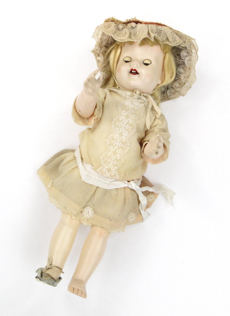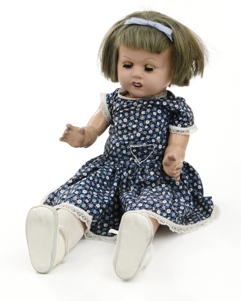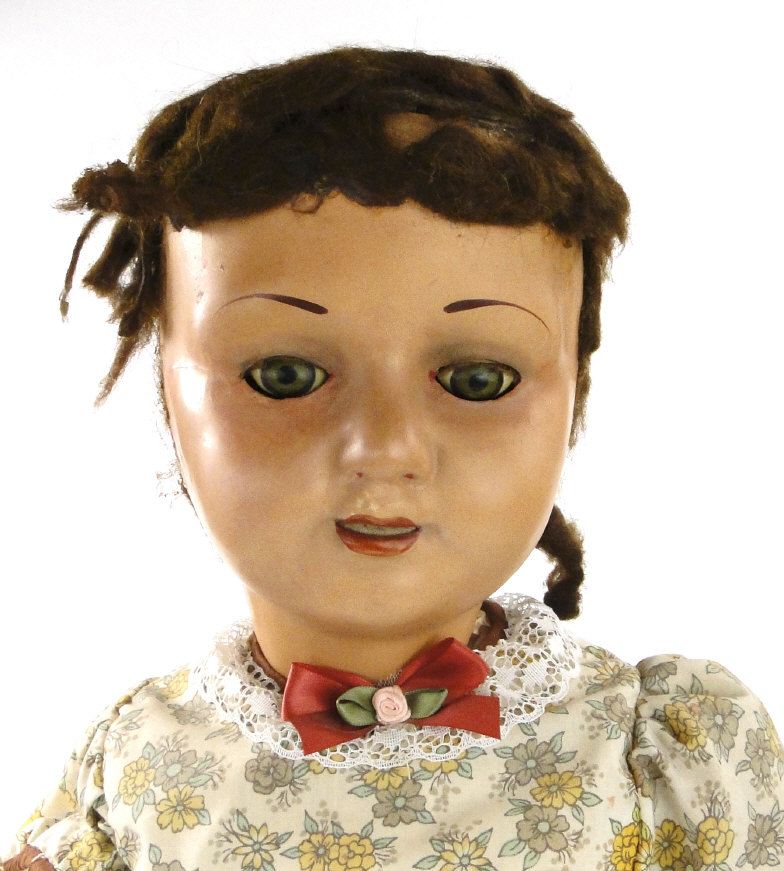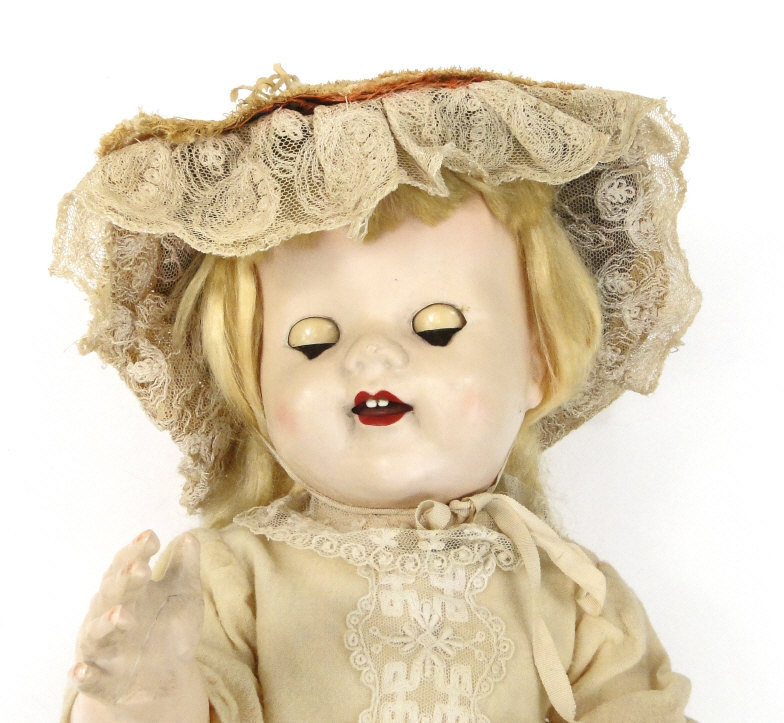 Four 1960s composition dolls with painted facial features, many with real hair wigs, the largest approximately 75cm high