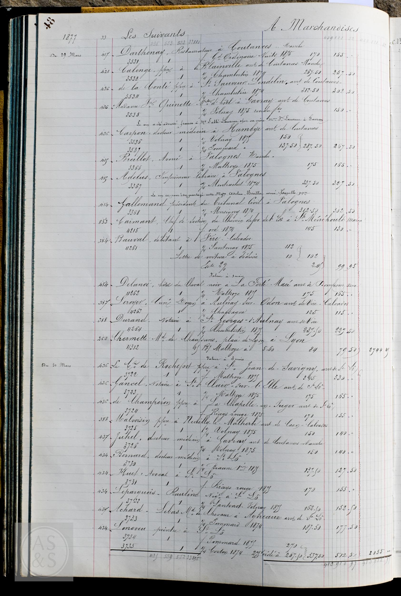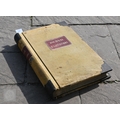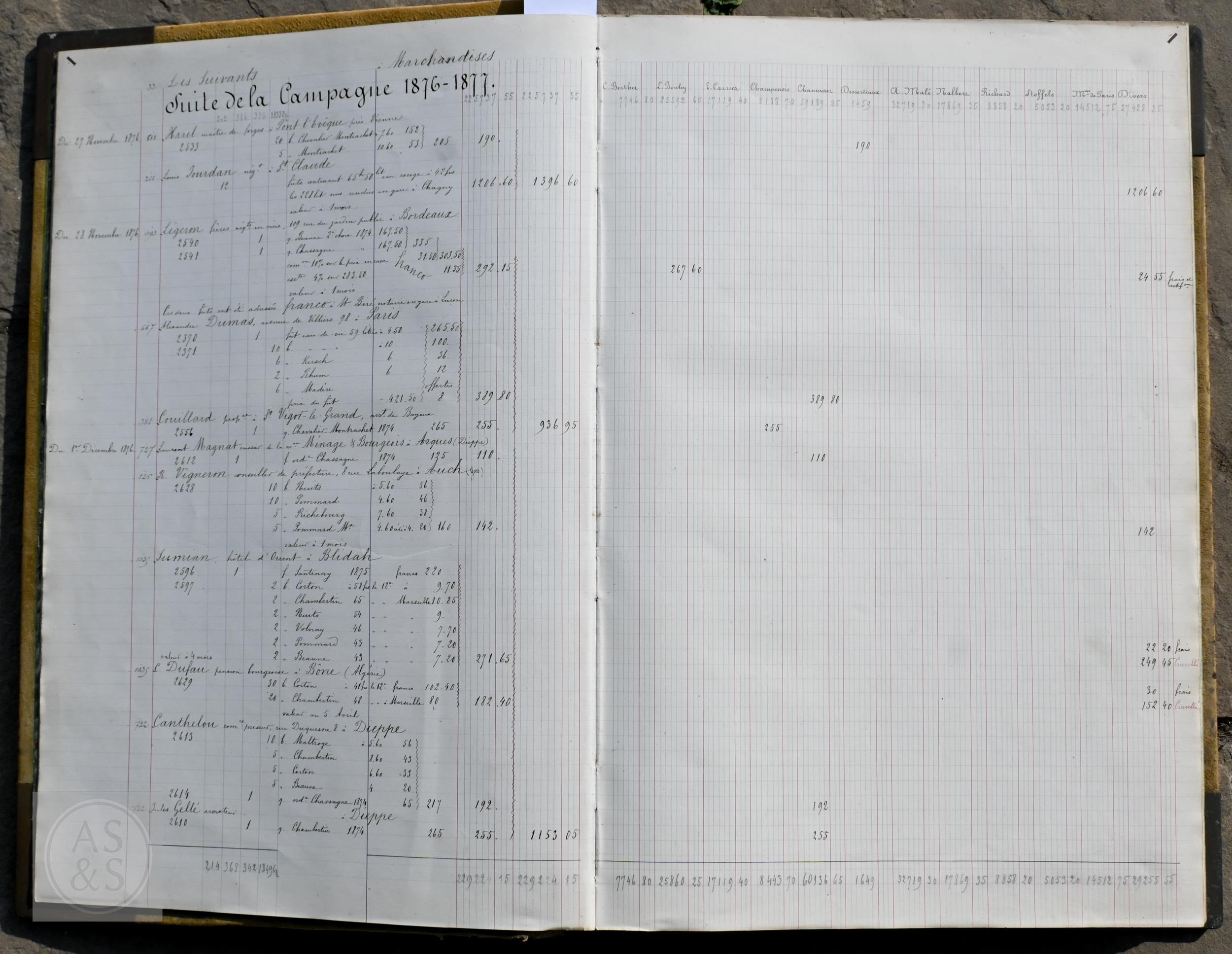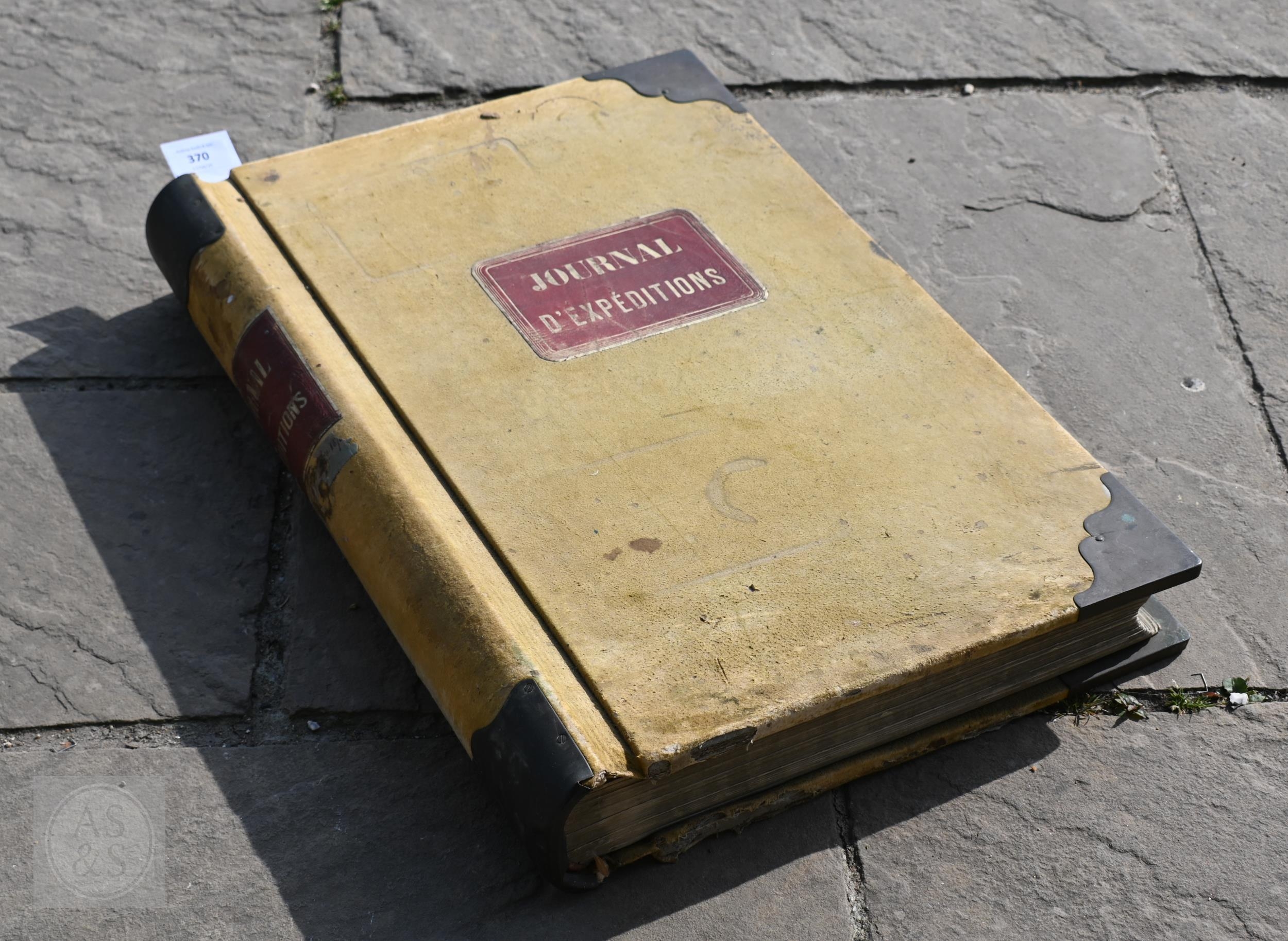 A 19th century French large brass and chamois-bound manuscript ledger, listing expenses incurred on a journey and other details, 1876-77, folio