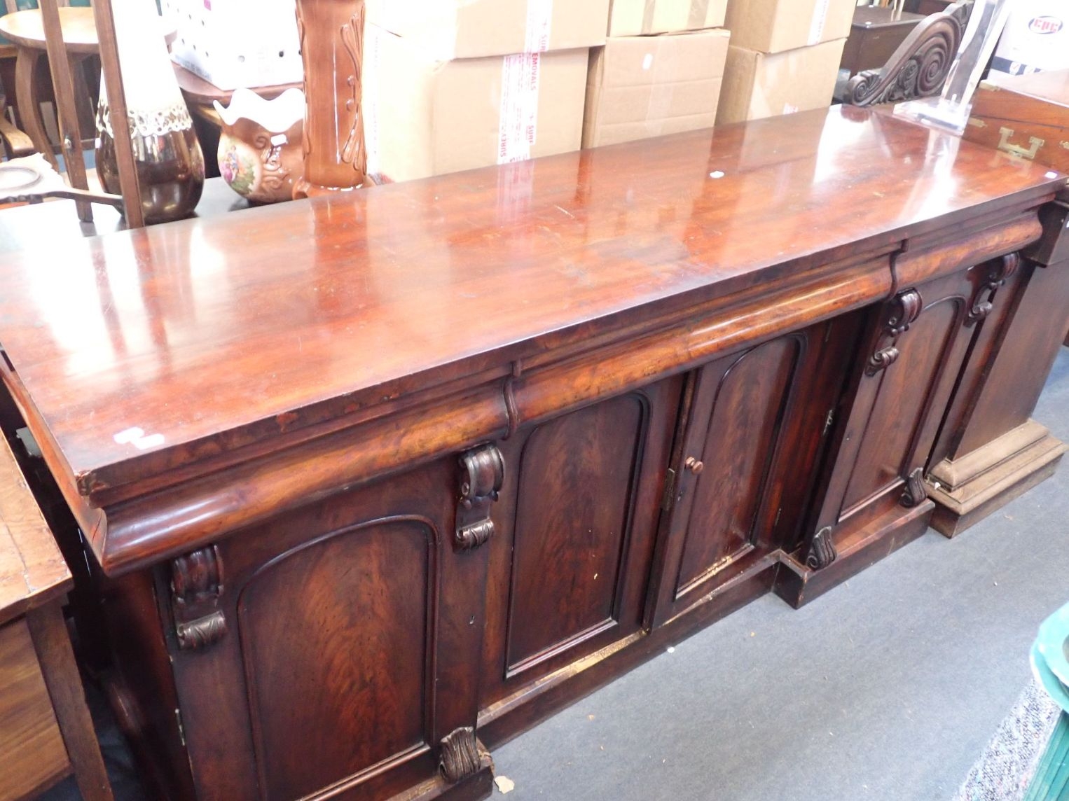 A VICTORIAN FIGURED MAHOGANY SIDEBOARD with recessed front section and carved corbels 180cm wide