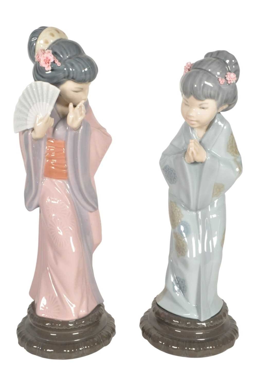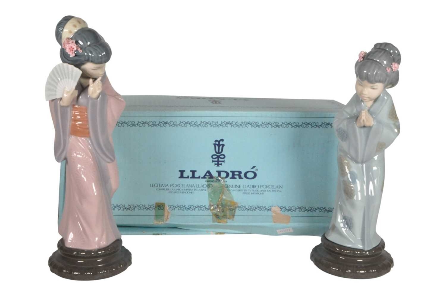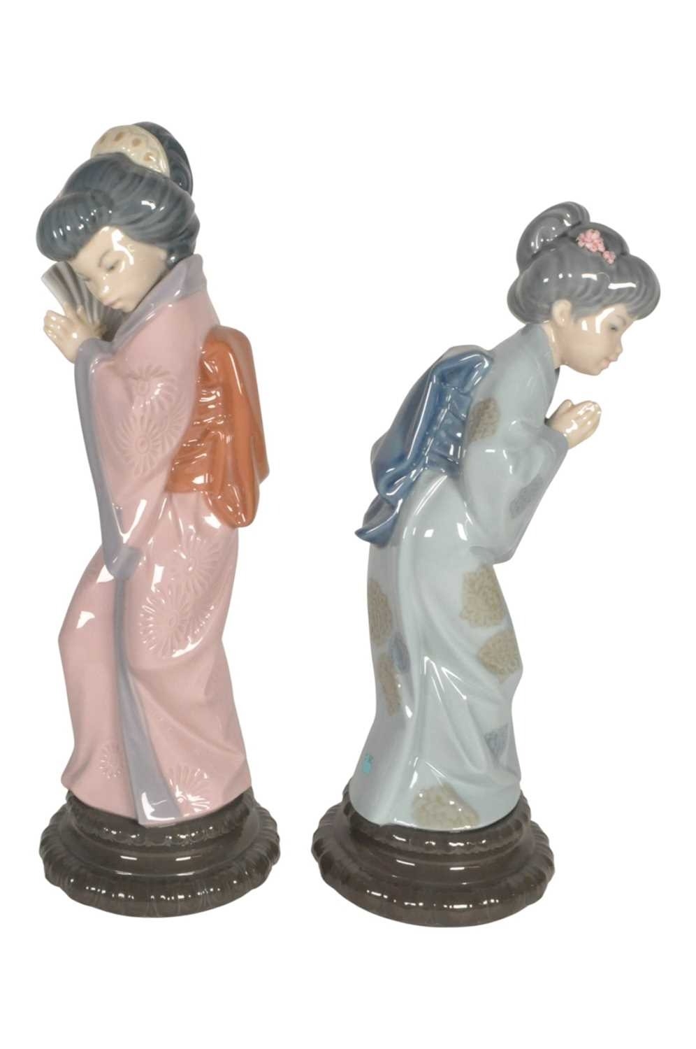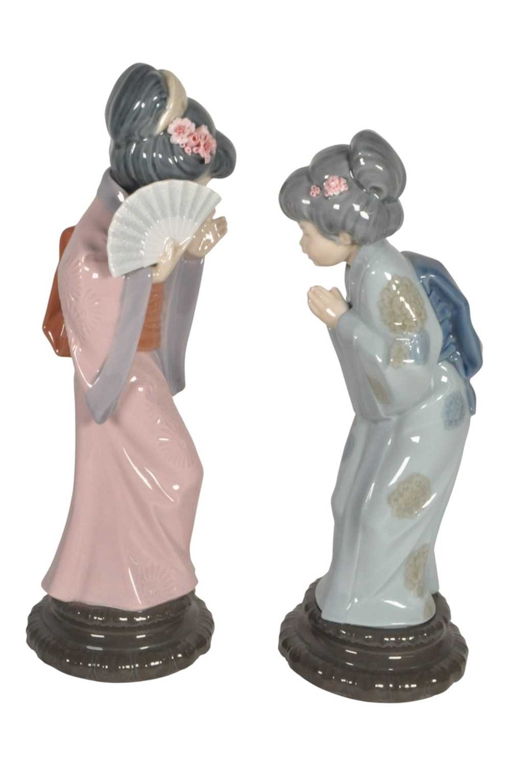 Lladro - Two late 20th century porcelain Japanese Geisha lady figures. Comprised of no. 4990 'Japonesita tímida' housed within the original box and no. 4989 'Japonesita Sayonara'. Maker's mark to the base of each piece. Largest measuring approx. 29.5cm tall.