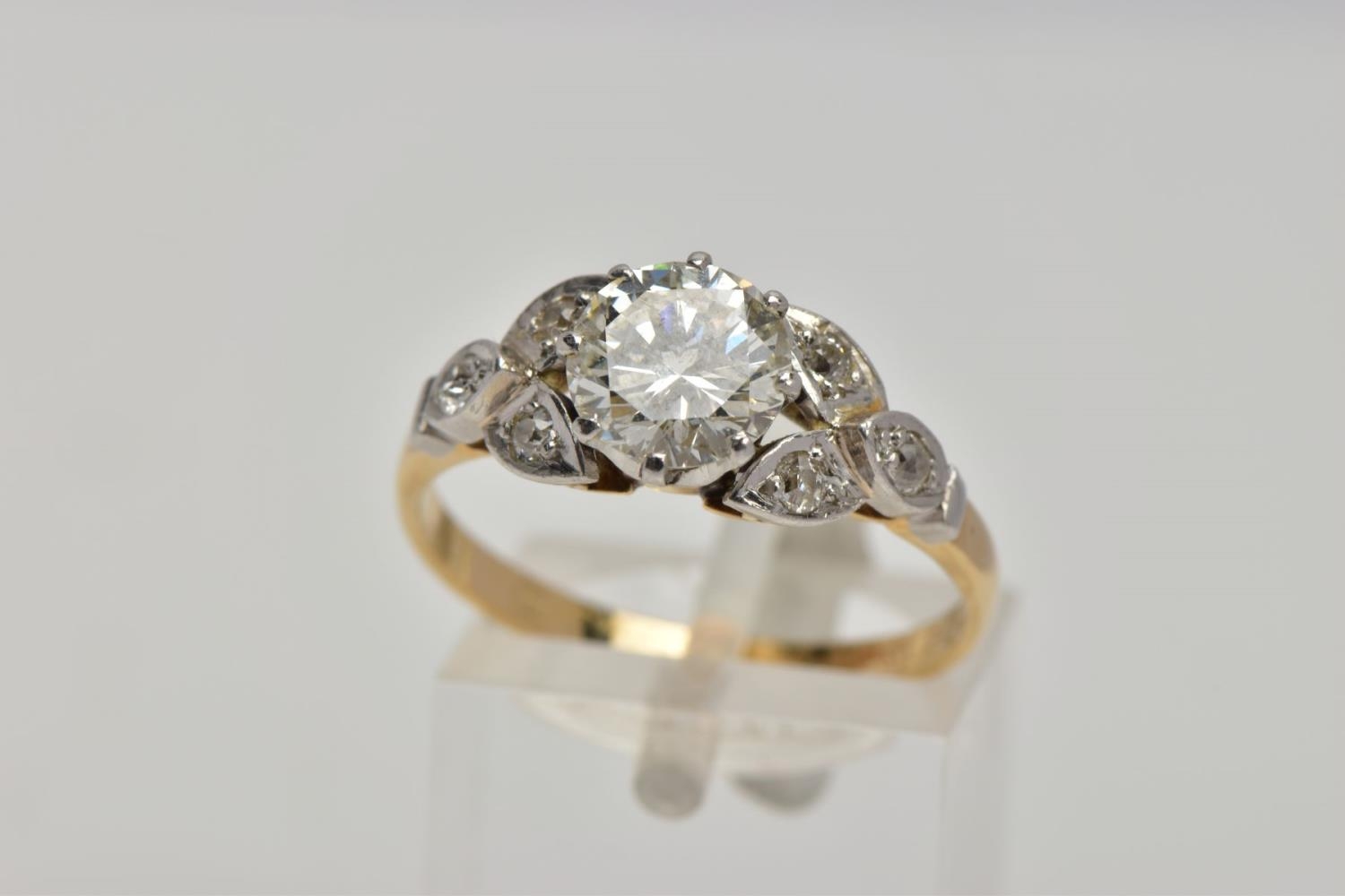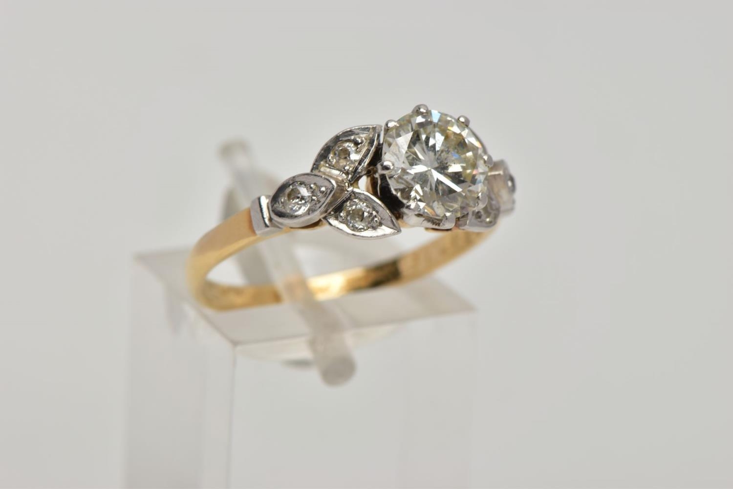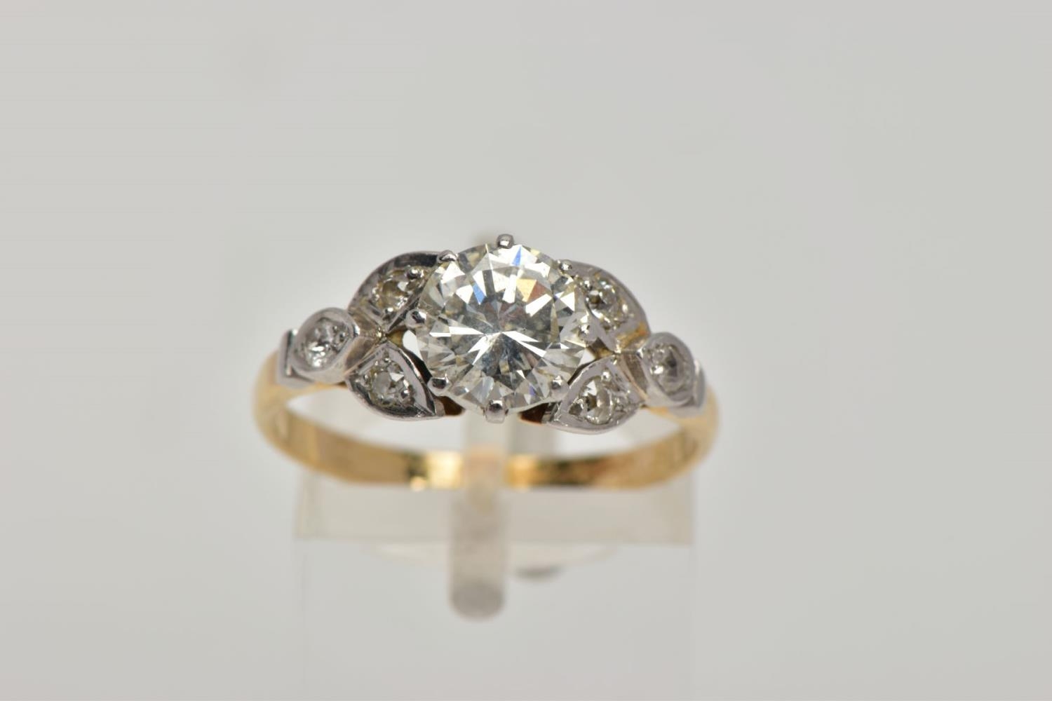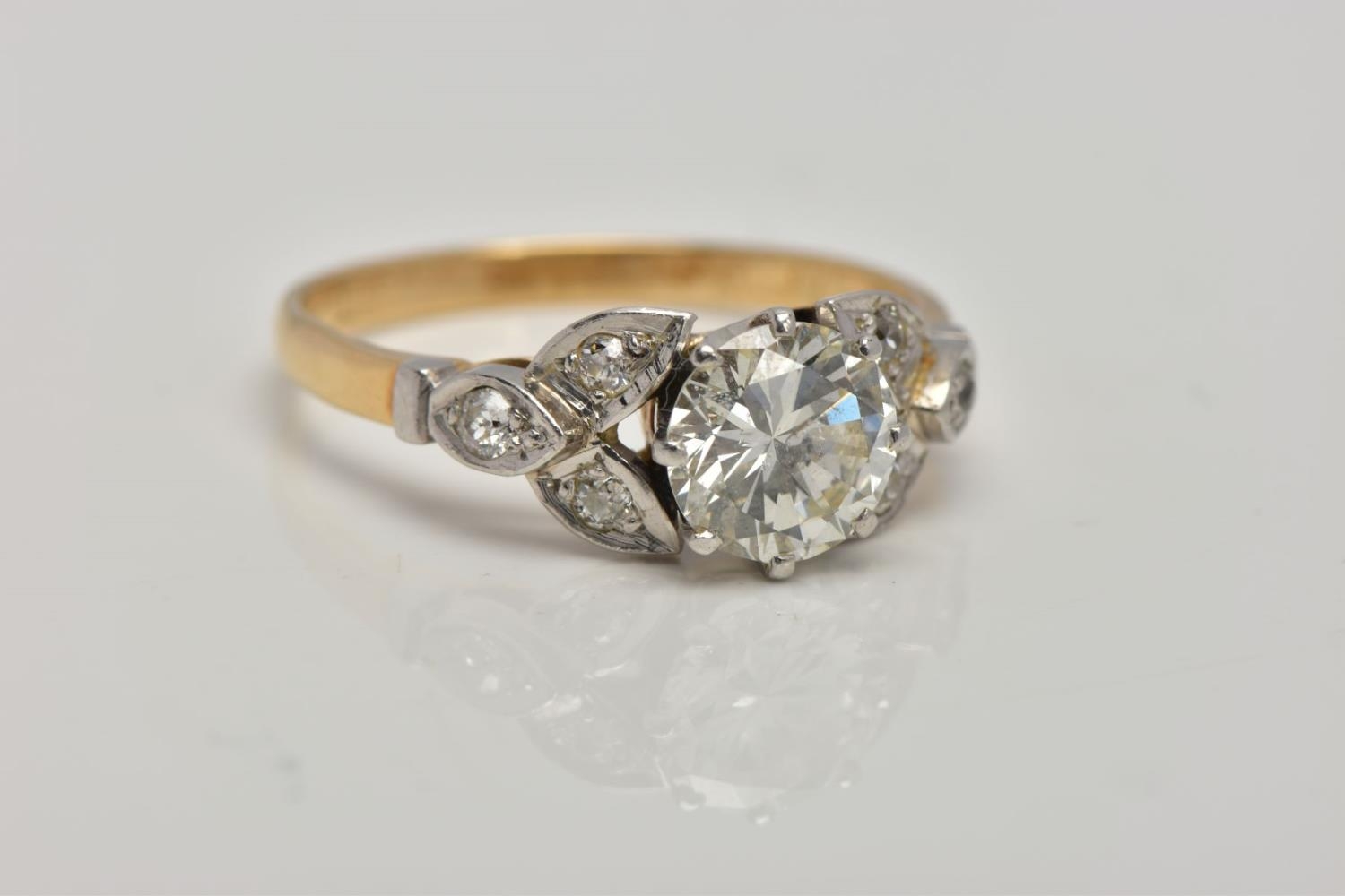A YELLOW METAL DIAMOND RING, centring on an eight claw set, round brilliant cut diamond, estimated diamond weight 1.40cts, colour assessed as K/L, clarity assessed as S12, to the mixed Swiss and old cut diamond detailed leaf shoulders, estimated total diamond weight 0.20cts, leading onto a plain polished band, stamped '18ct', ring size Q, approximate gross weight 4.1 grams (condition report: the diamond is slightly loose within the setting,