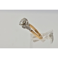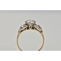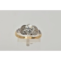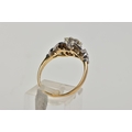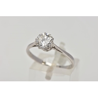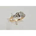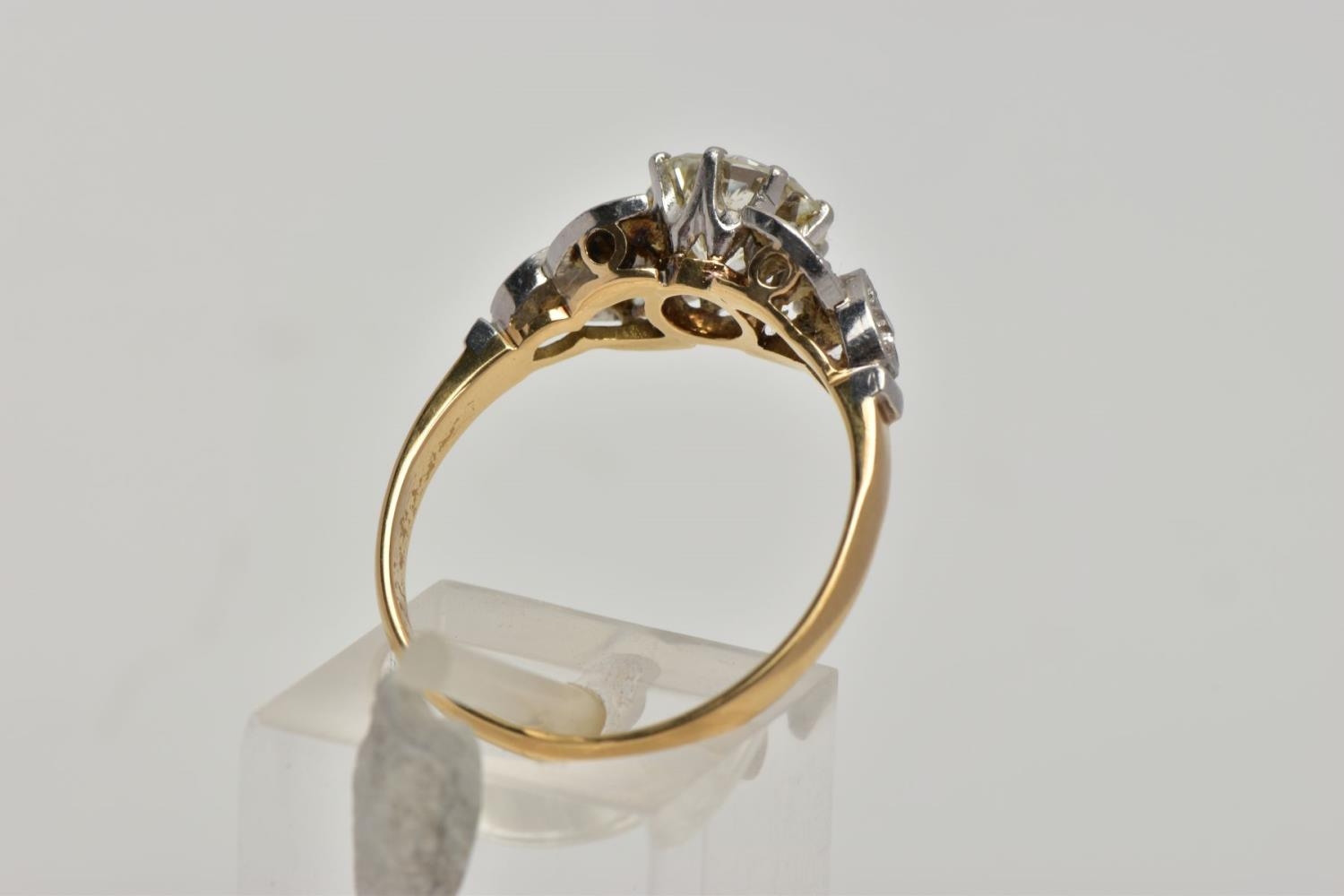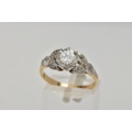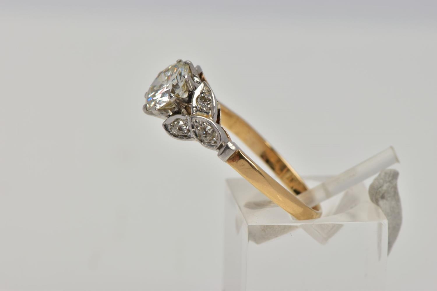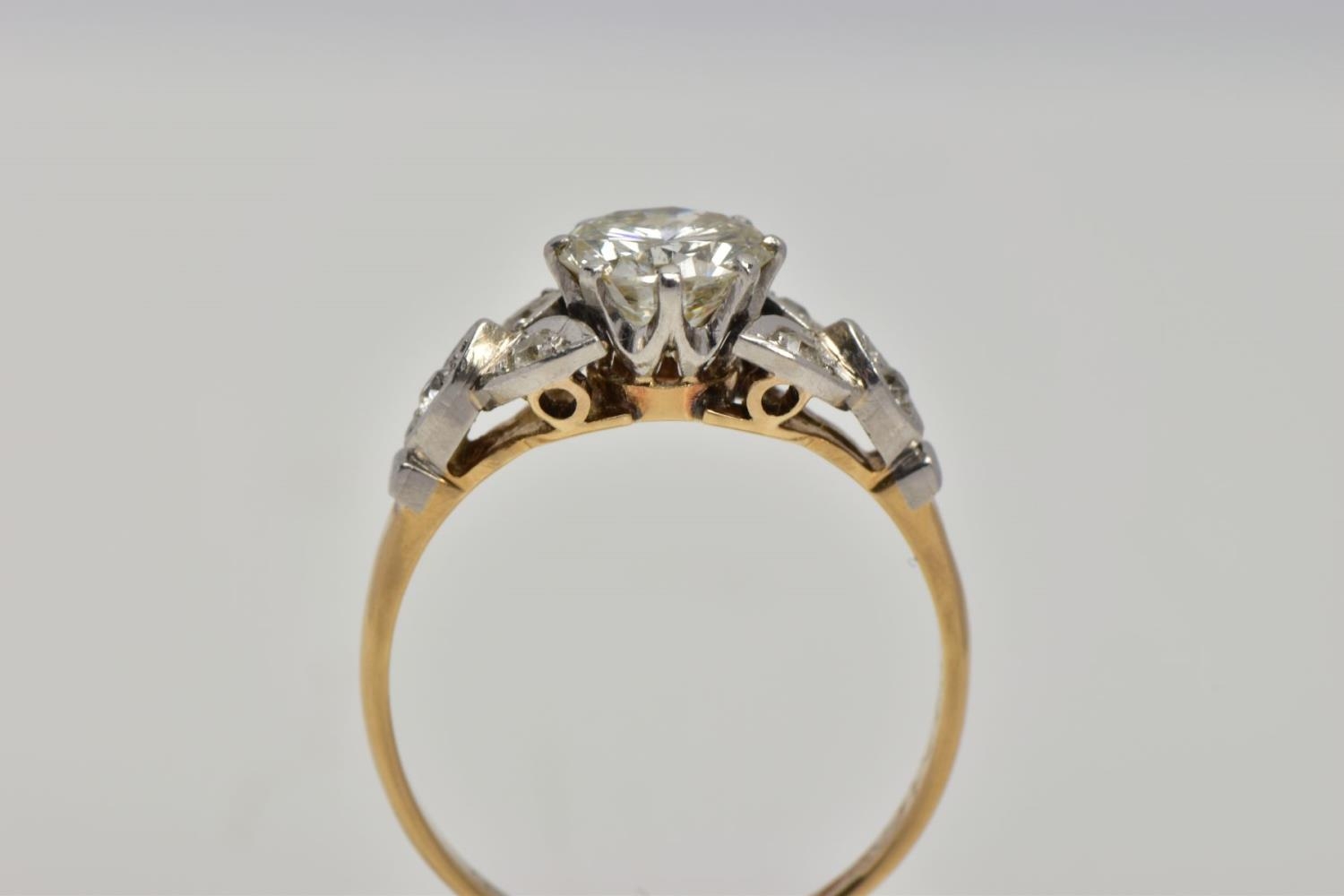 A YELLOW METAL DIAMOND RING, centring on an eight claw set, round brilliant cut diamond, estimated diamond weight 1.40cts, colour assessed as K/L, clarity assessed as S12, to the mixed Swiss and old cut diamond detailed leaf shoulders, estimated total diamond weight 0.20cts, leading onto a plain polished band, stamped '18ct', ring size Q, approximate gross weight 4.1 grams (condition report: the diamond is slightly loose within the setting,