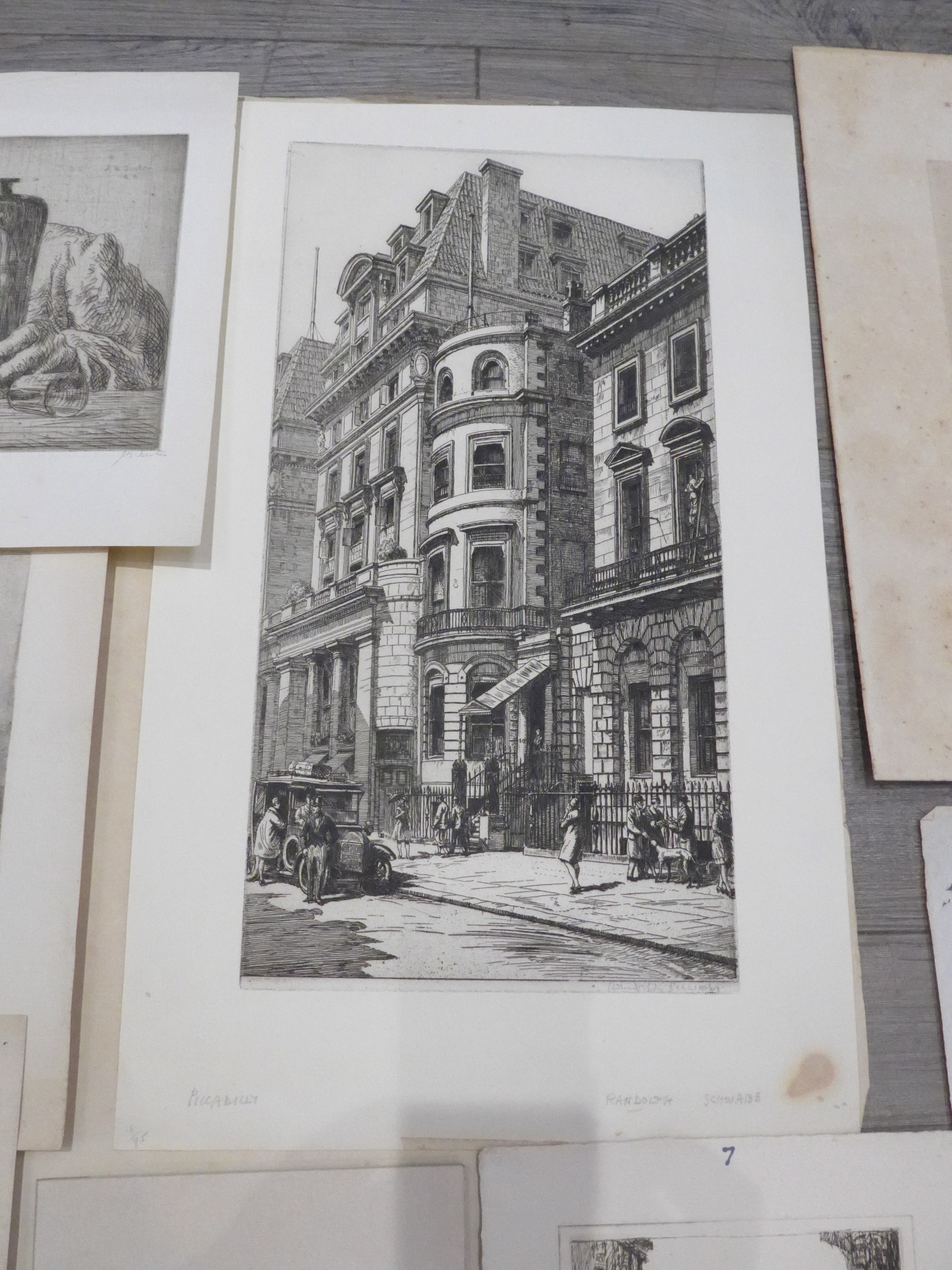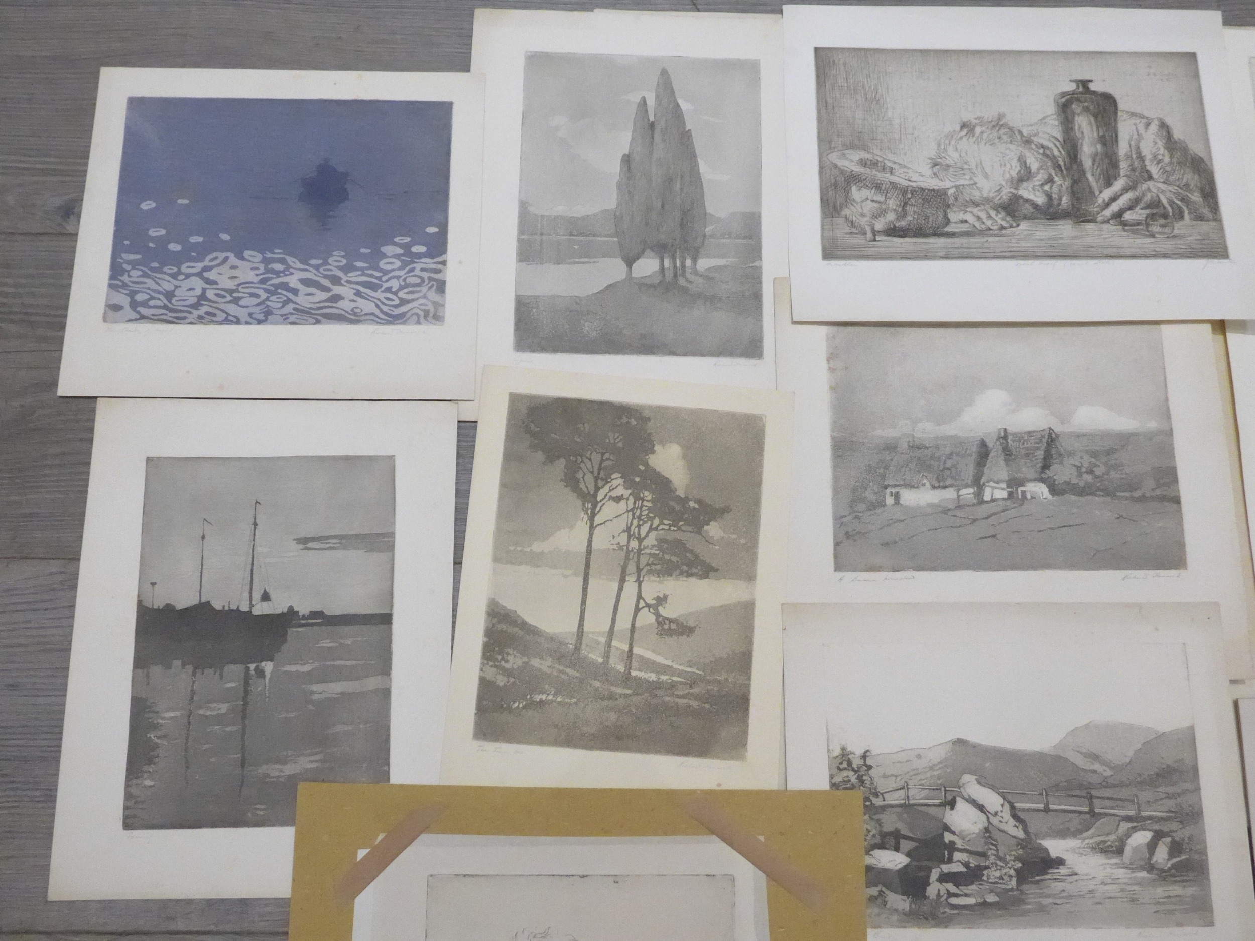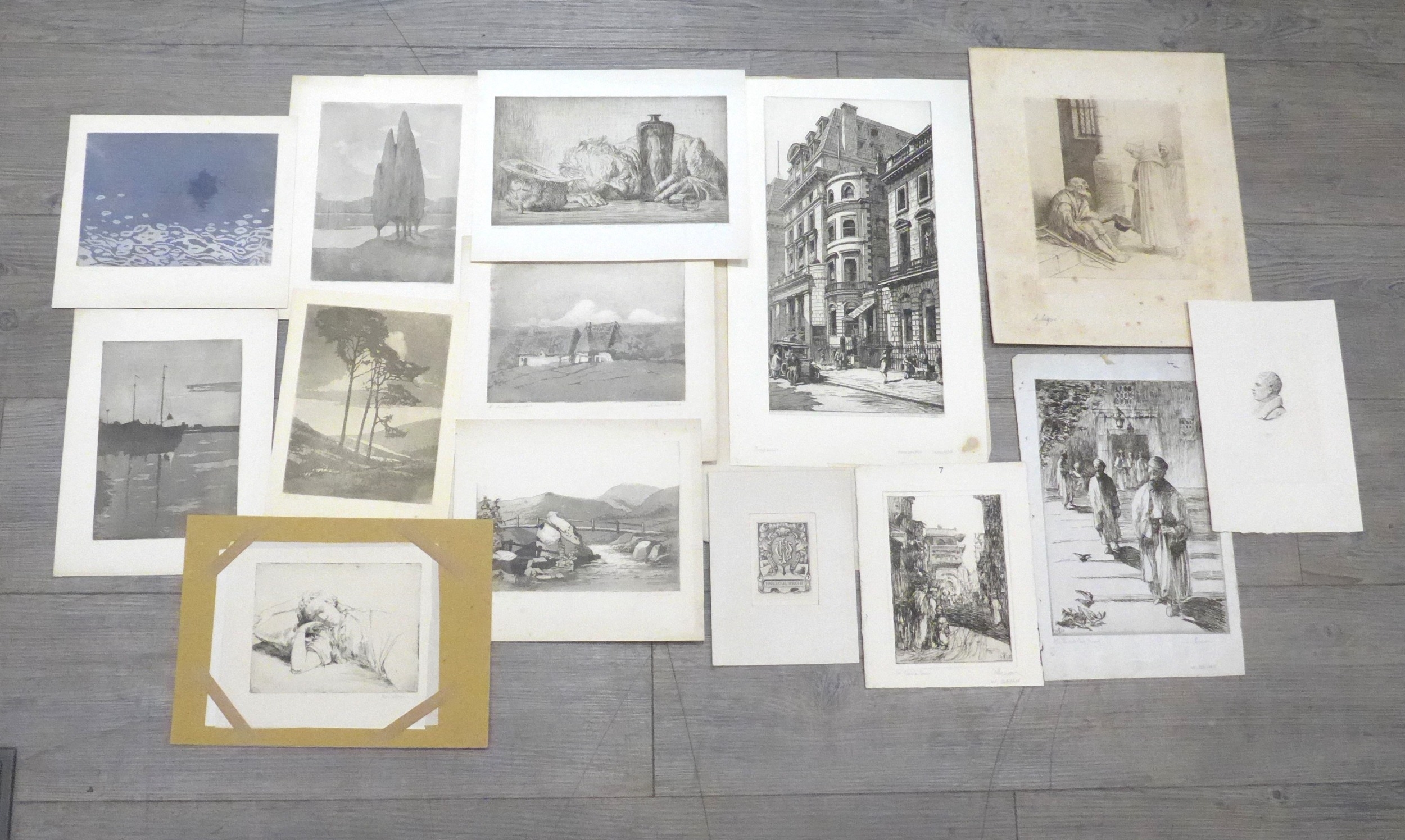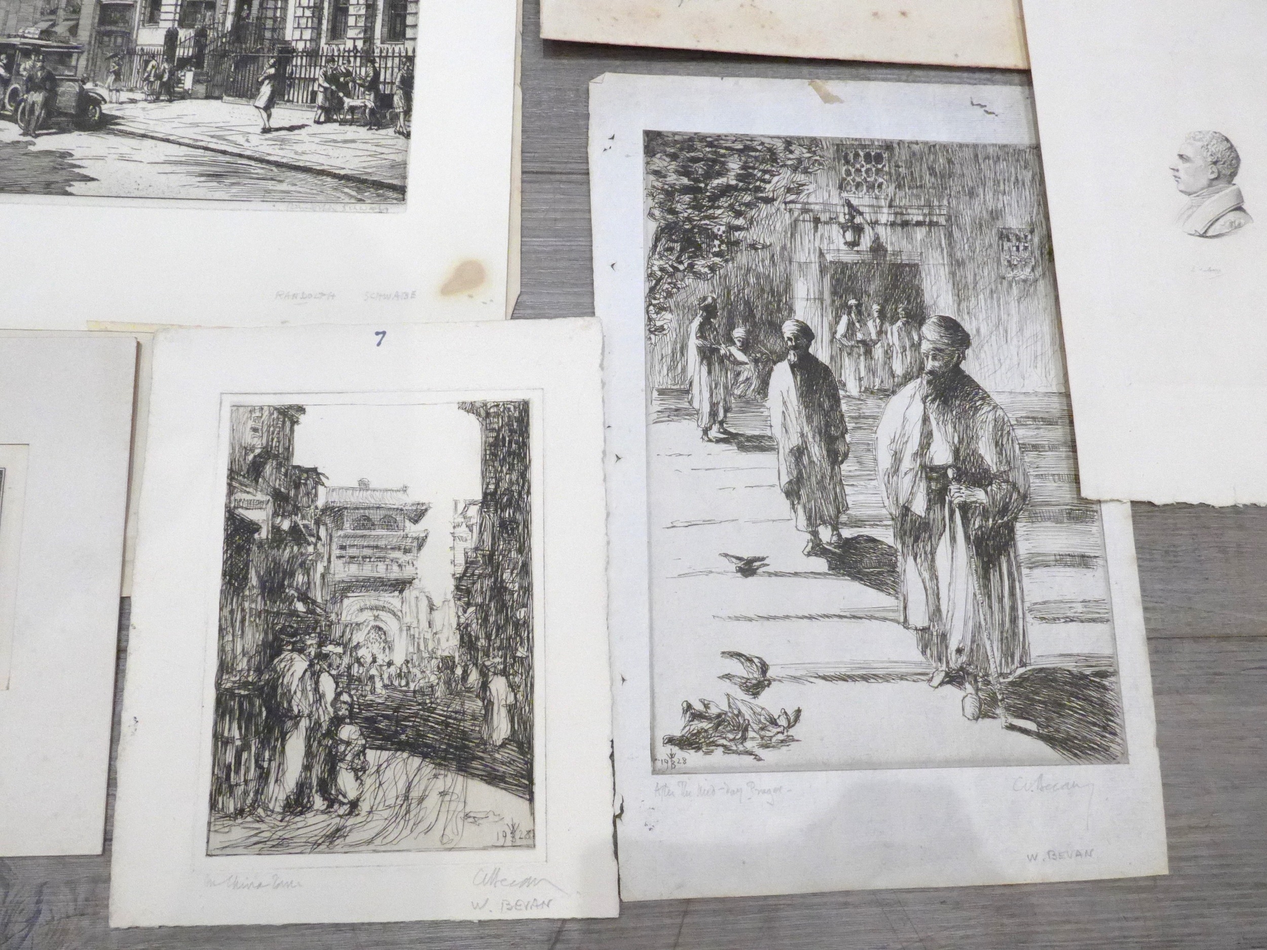 A collection of etchings and prints including Randolph Schwabe, Richard Hancock, W.Bevan, Rosa Hope, John Bulloch Souter etc. Largest overall size 43cm x 26.5cm (14) Provenance - From the collection of Henry Potter Stevens (1875-1965)