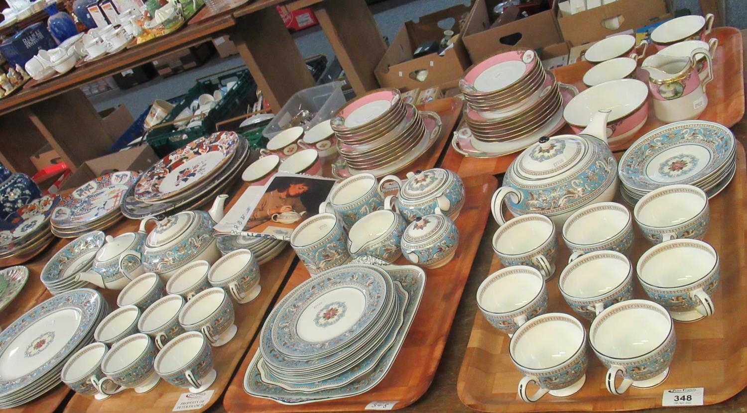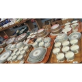 Four trays of Wedgwood 'Florentine Turquoise' tea and dinner ware to include: six dinner plates, six bowls, seventeen cups, twelve sauces, three teapots, milk jug, two sugar bowls, side plates, cake plate and square serving plate, etc.
