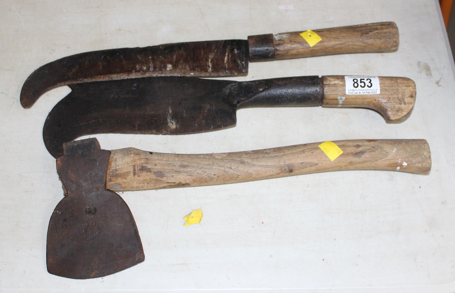 2 vintage billhooks and hatchet axe (3), all with makers marks