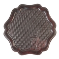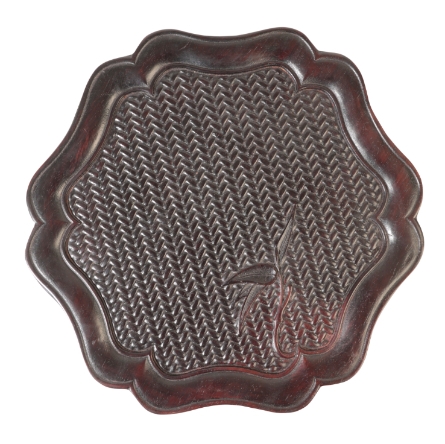 A CHINESE "ZITAN" TRAY of circular form with an undulating border, the central panel carved to simulate basketwork over which grows a bamboo shoot, 30cm dia.