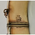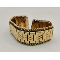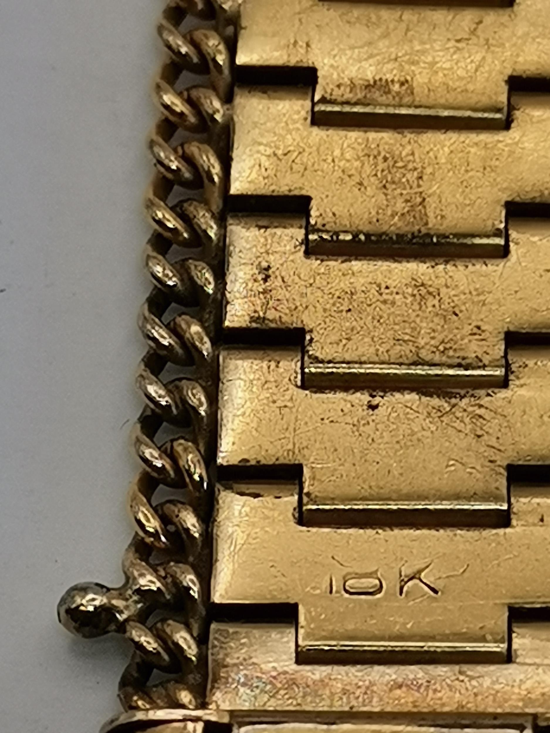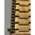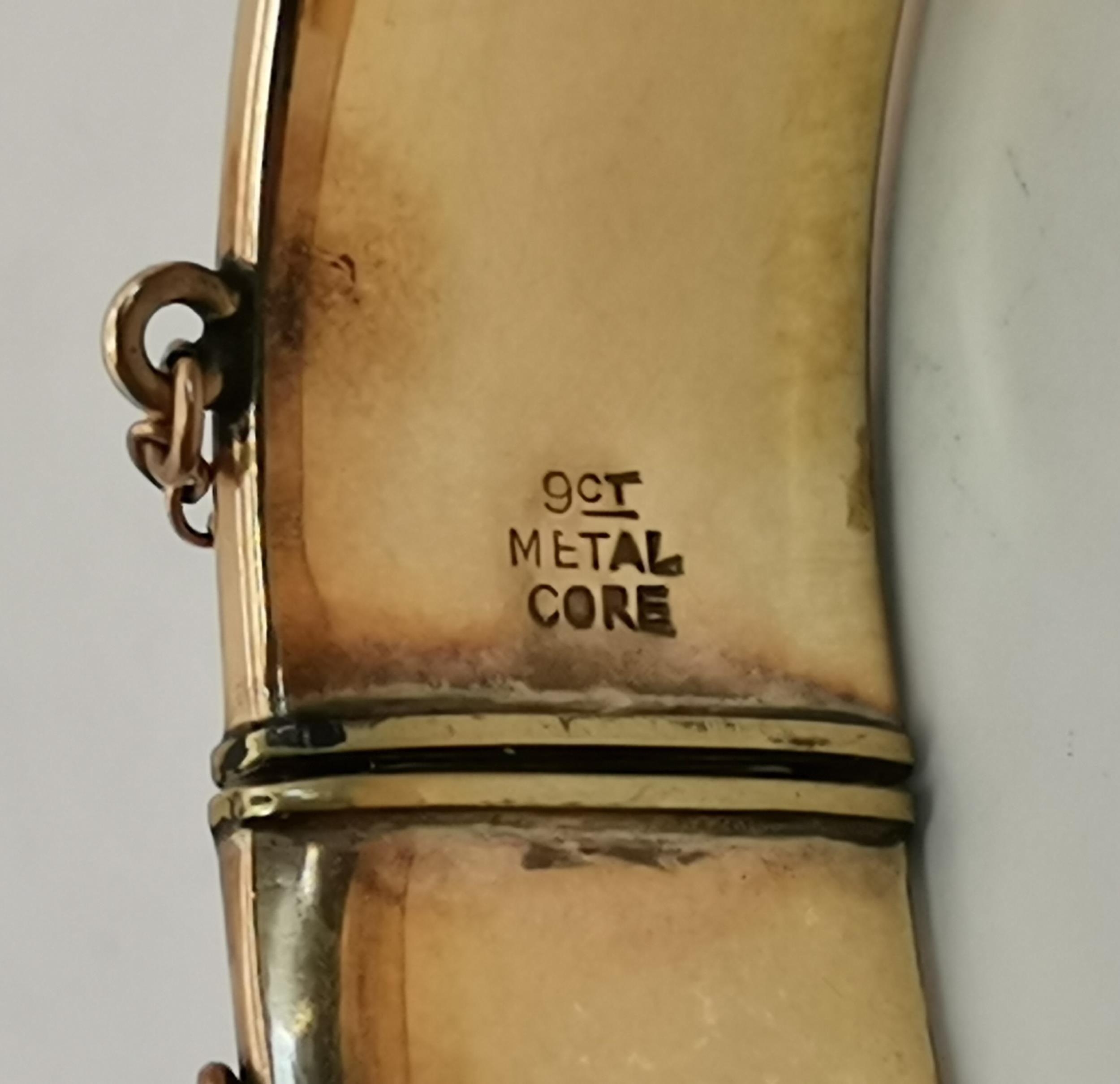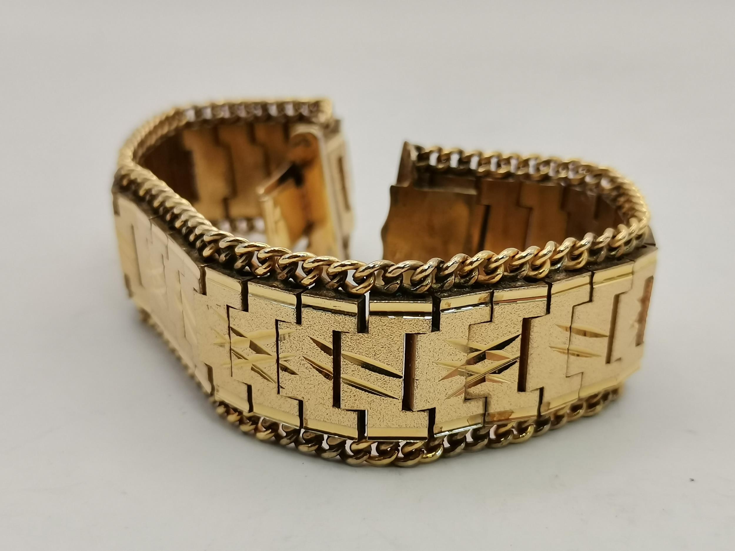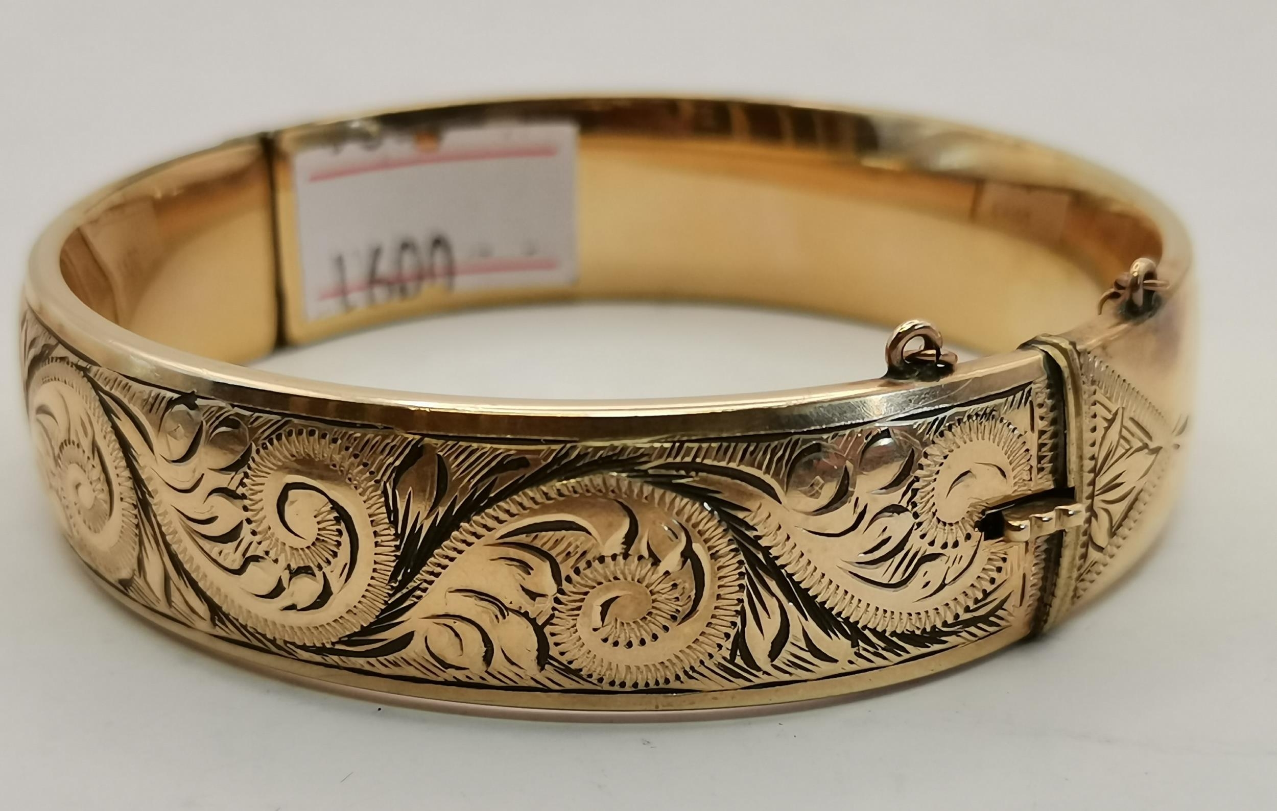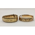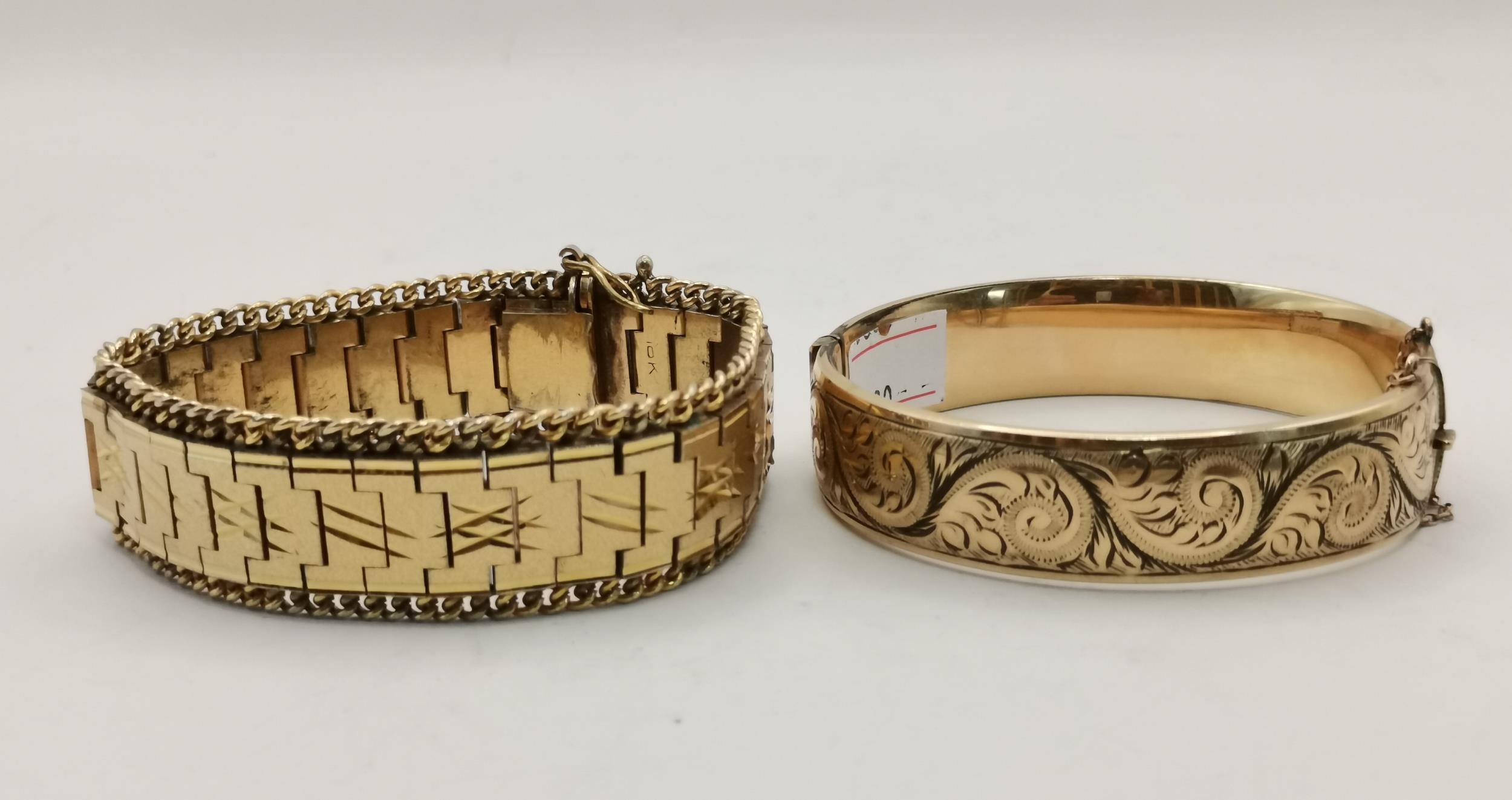 A 9 carat gold hinge-opening bangle, engraved to front with scrolling foliate decoration, stamped 9CT, with metal core; together with a yellow metal brick-link bracelet, cut with slice decoration, with curb link edging. (2) Bracelet approx. 20cm long