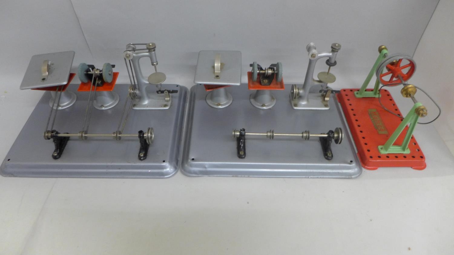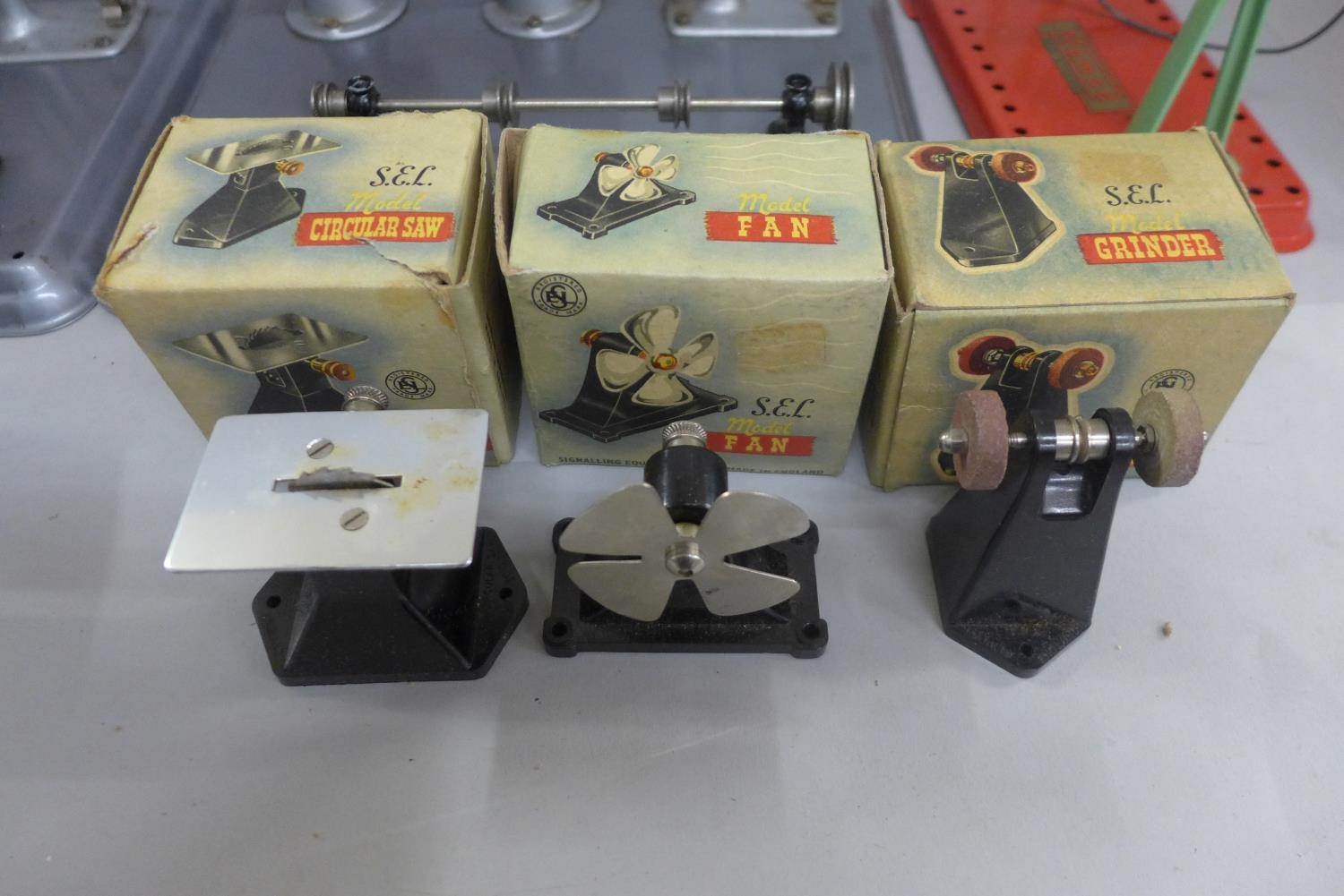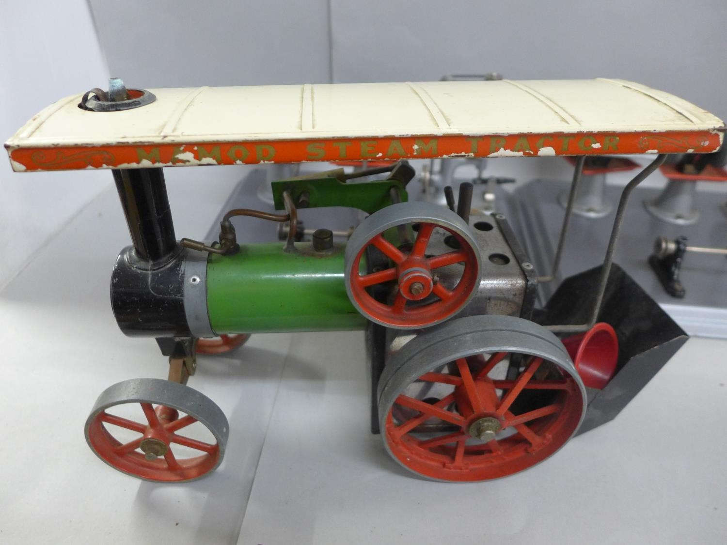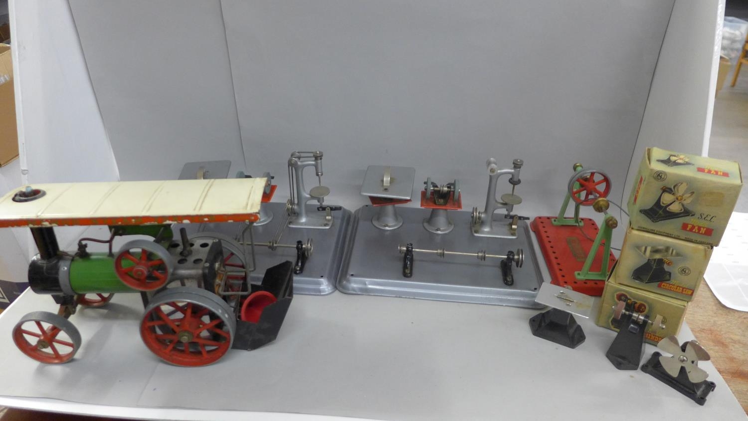 An early 1960's traction engine with instructions and accessories including a line shaft, model fan, model grinder and model circular saw, all in original boxes and two work stations