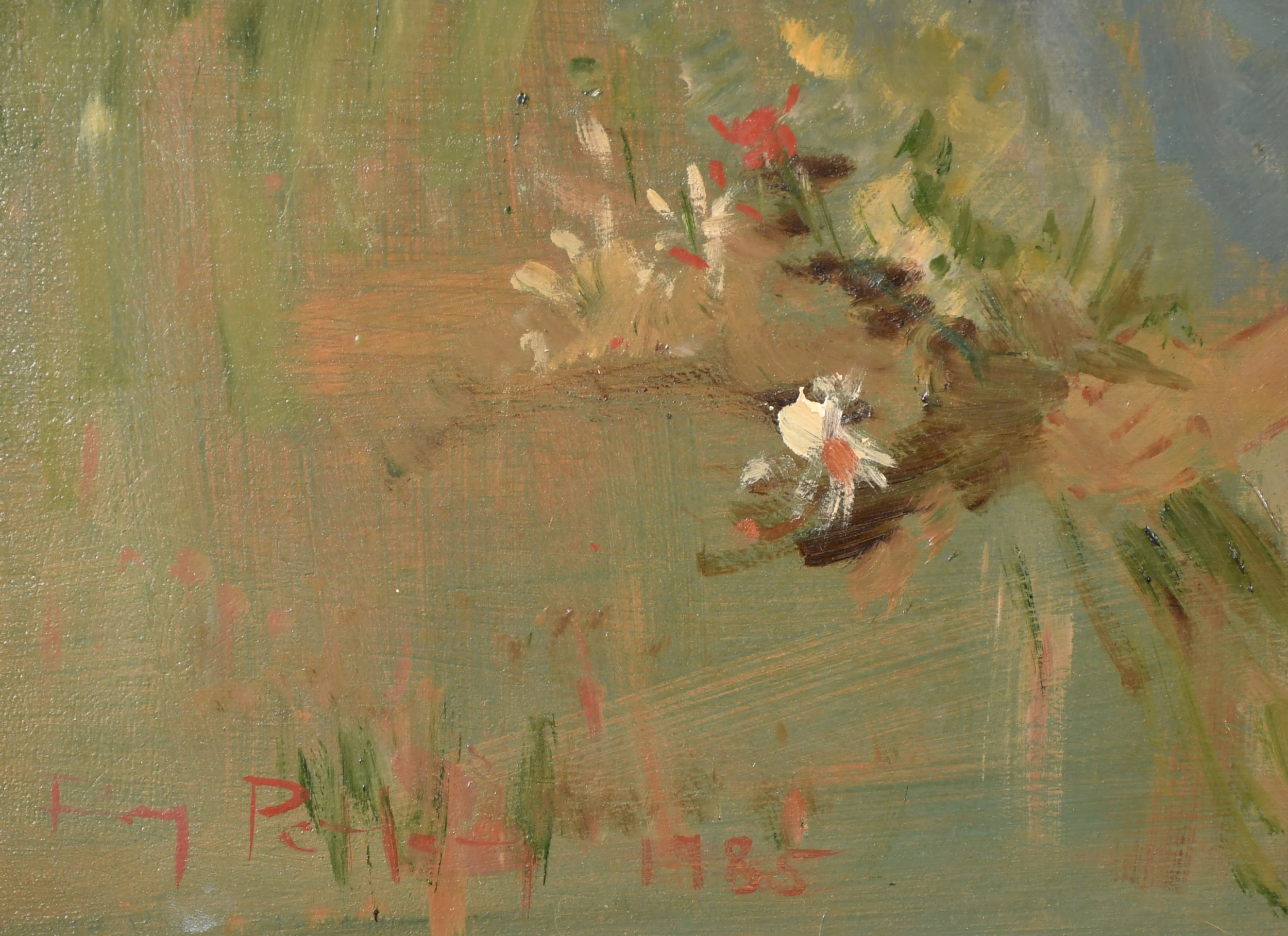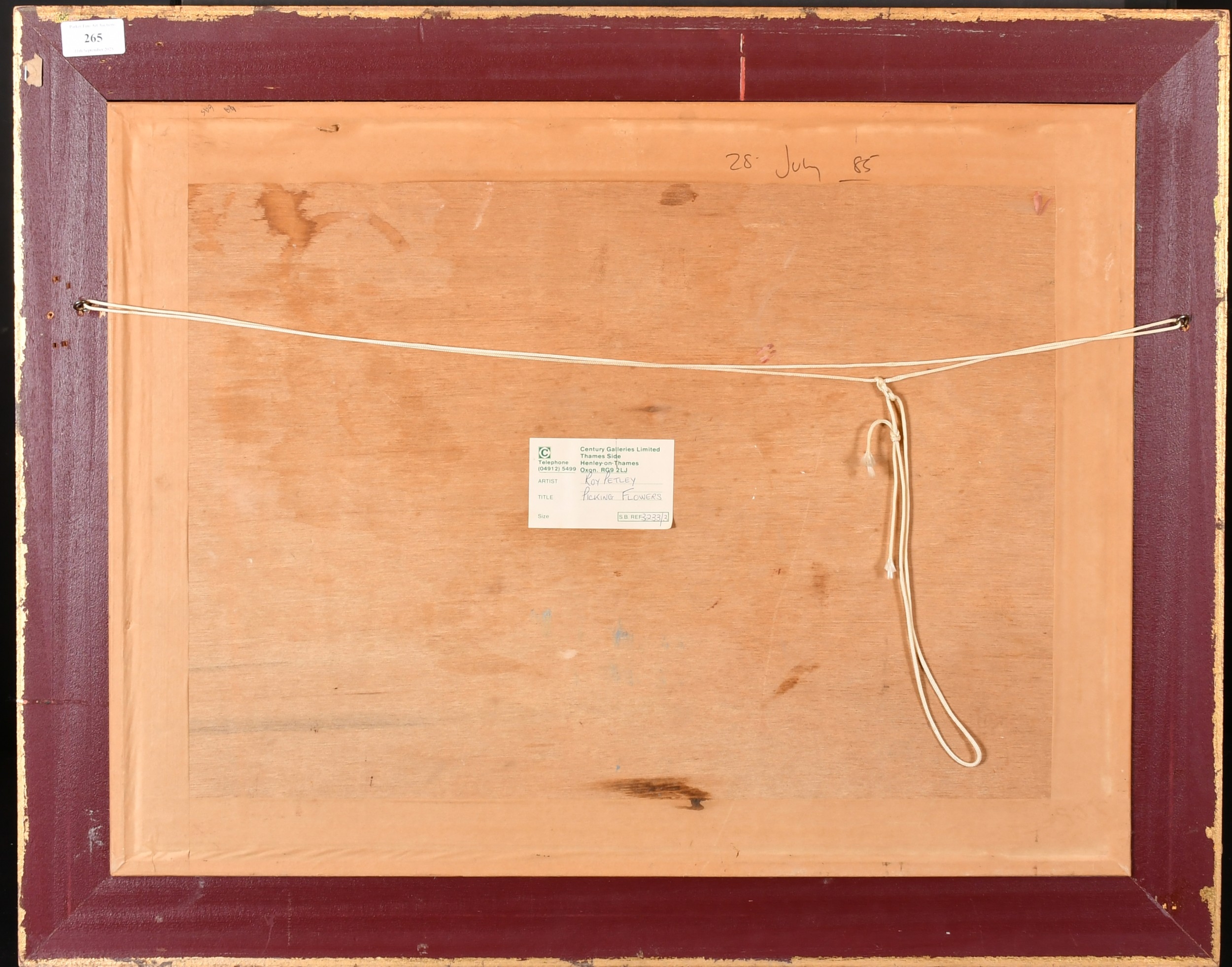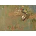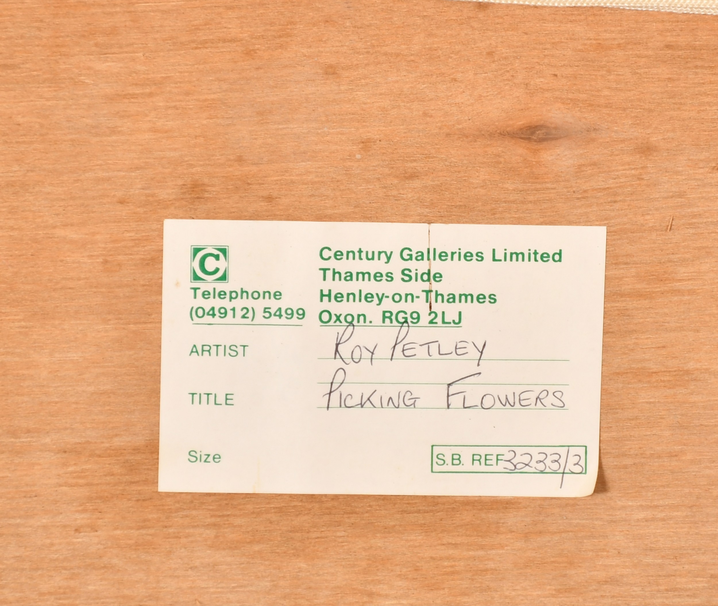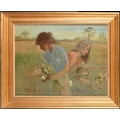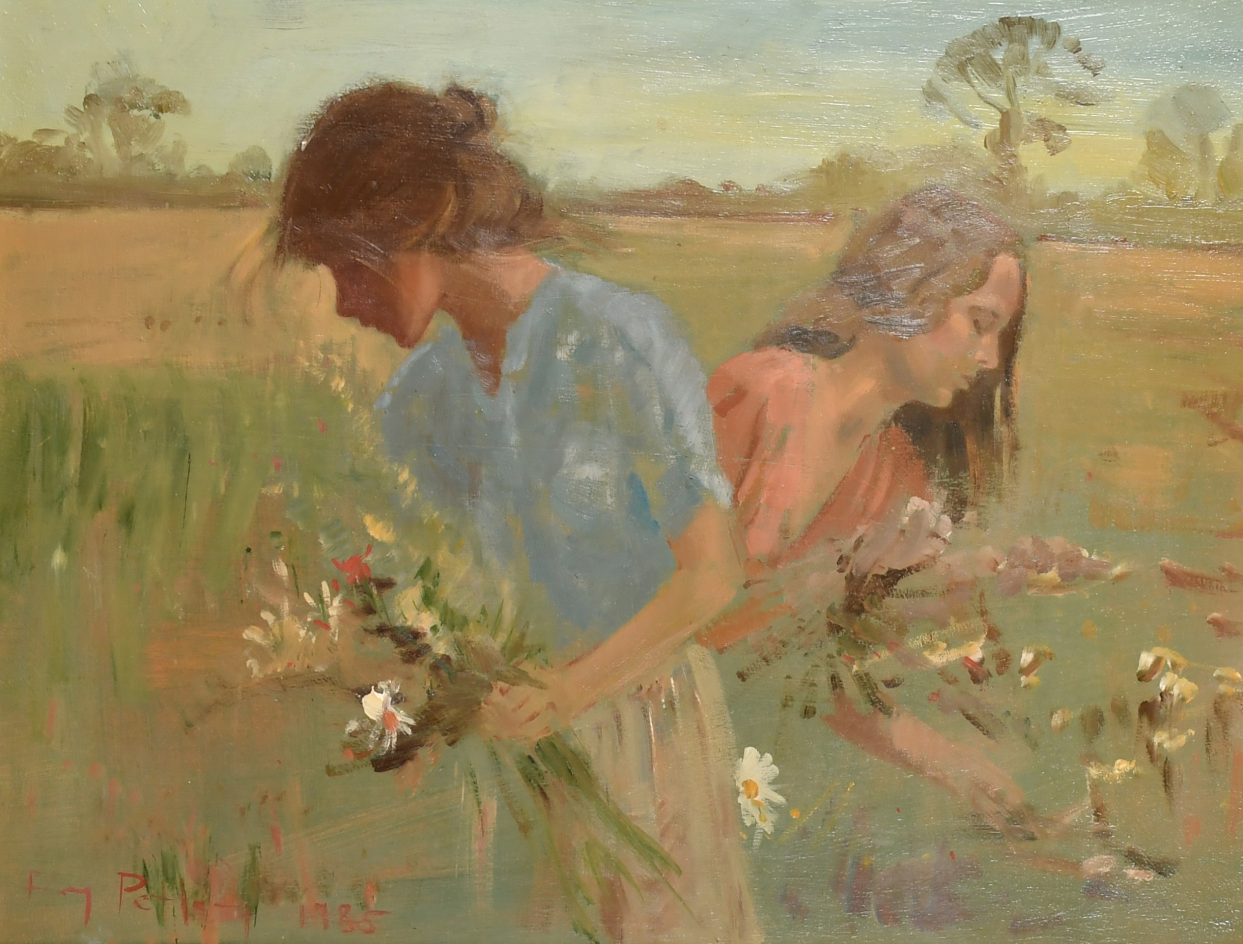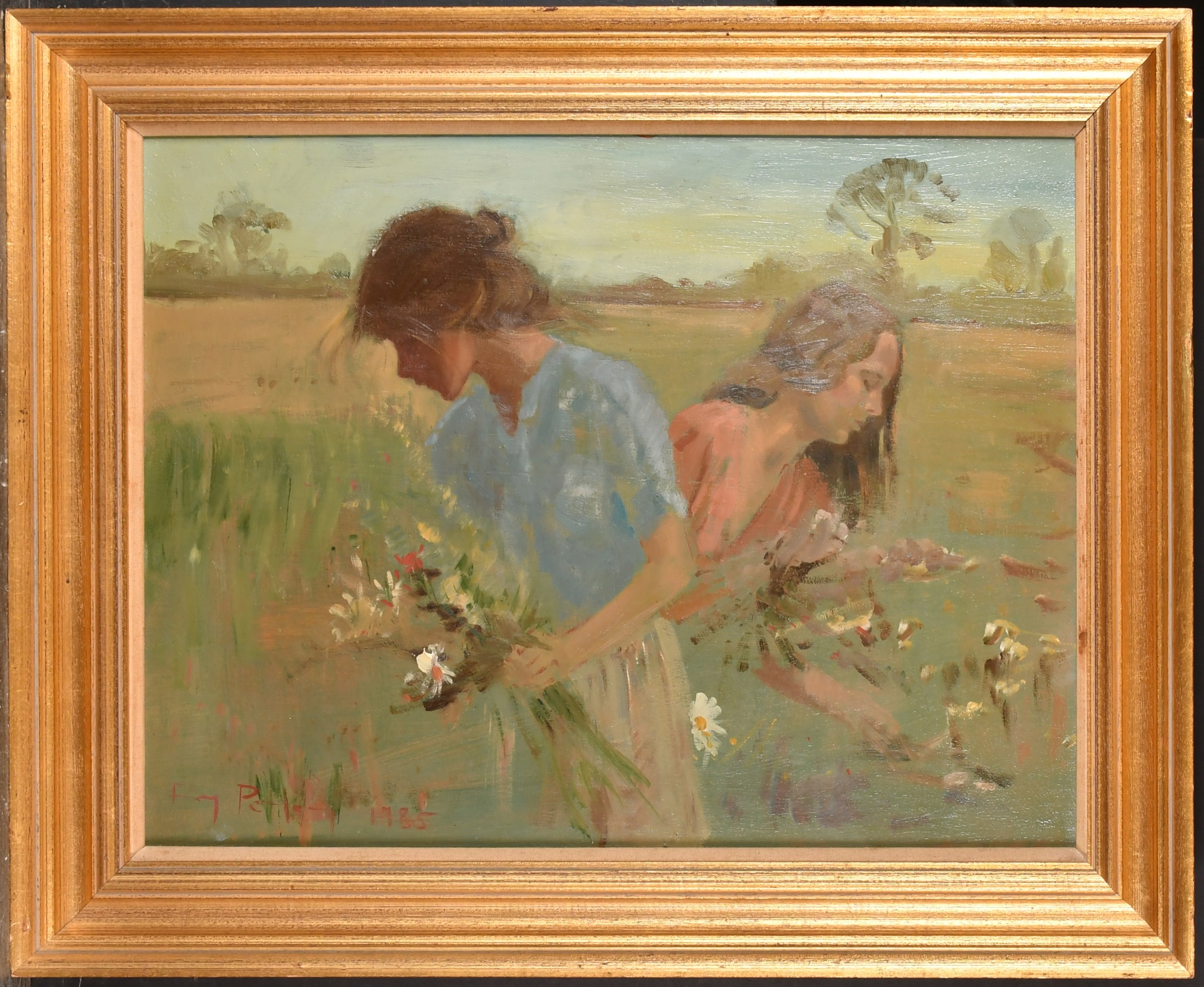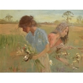 Roy Petley (1950- ) British. "Picking Flowers", Oil on board, Signed and dated 1985, and inscribed on a label verso, 17.75" x 23.75" (45.1 x 60.3cm). Provenance: Century Galleries Limited, Henley-on-Thames