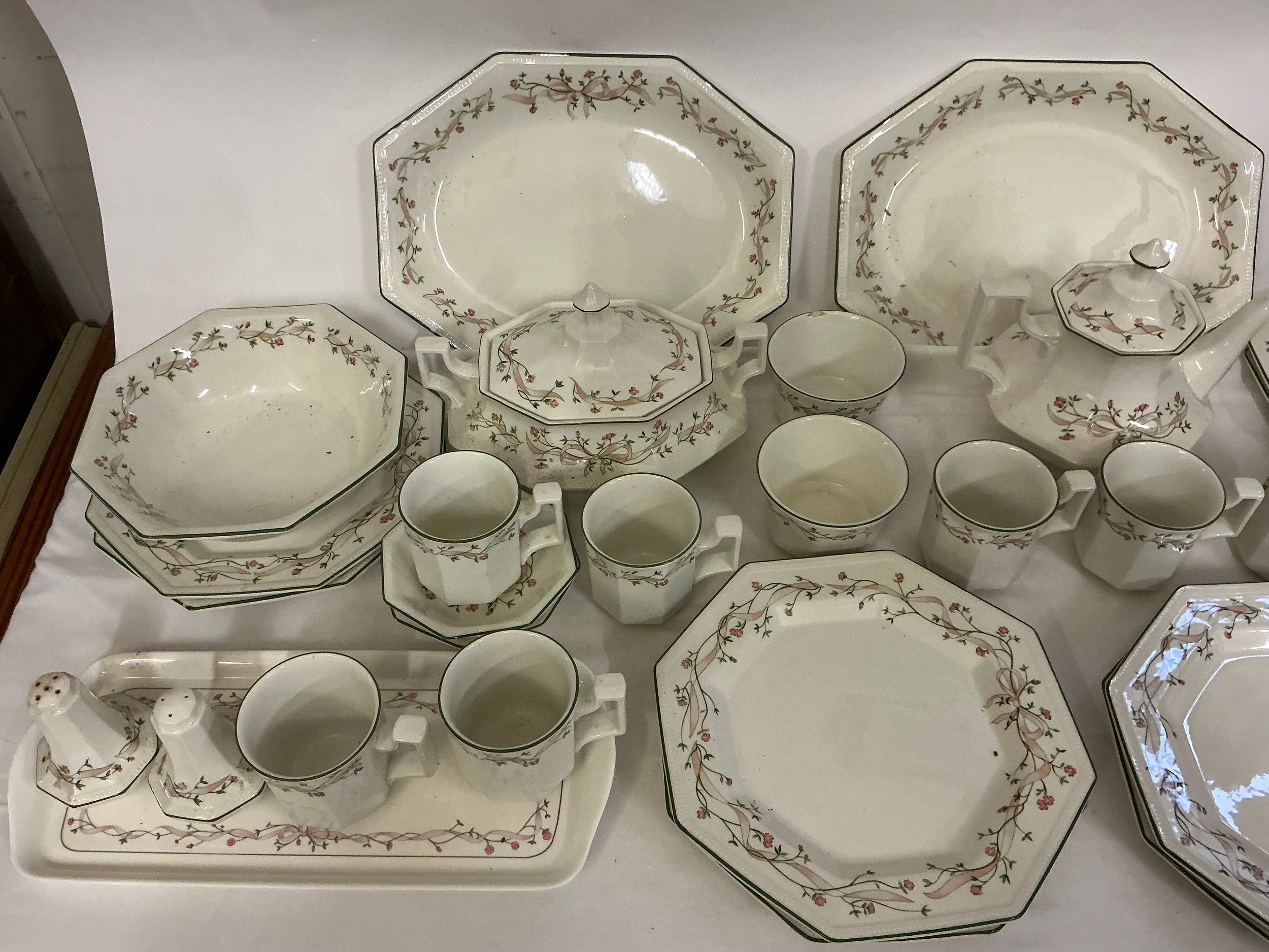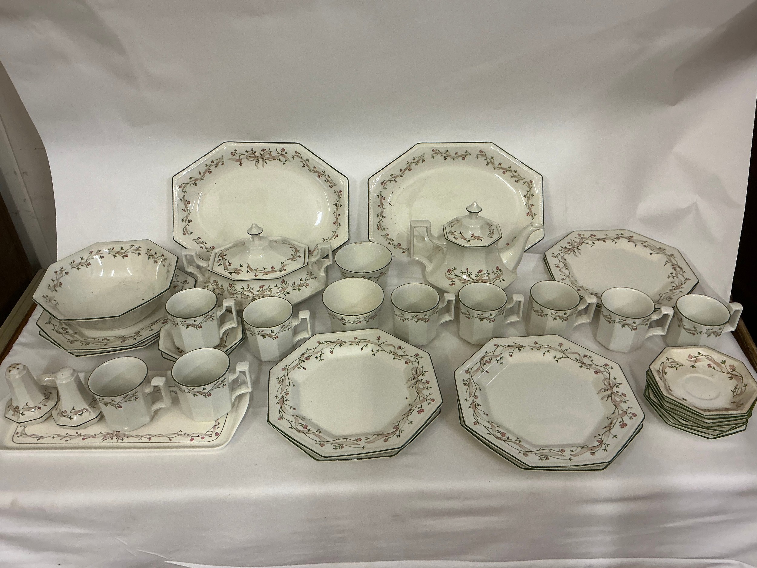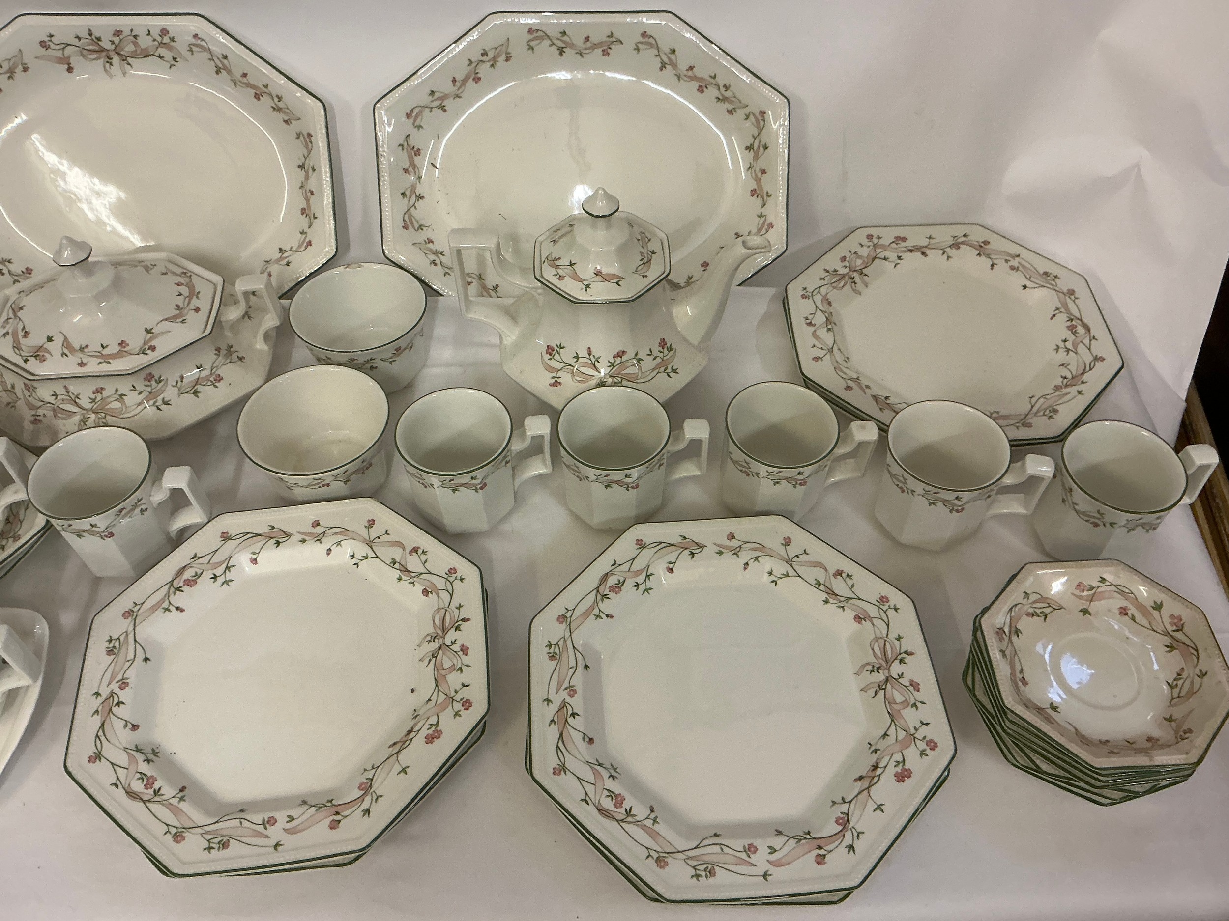 A Johnson Brothers Dinner & Tea Service in the "Eternal Beau" pattern to include Two Large Serving Plates, Dinner Plates, Tea Pot, Covered Tureen, Salt & Pepper, Sugar Bowl, Cups, Mugs & Saucers.