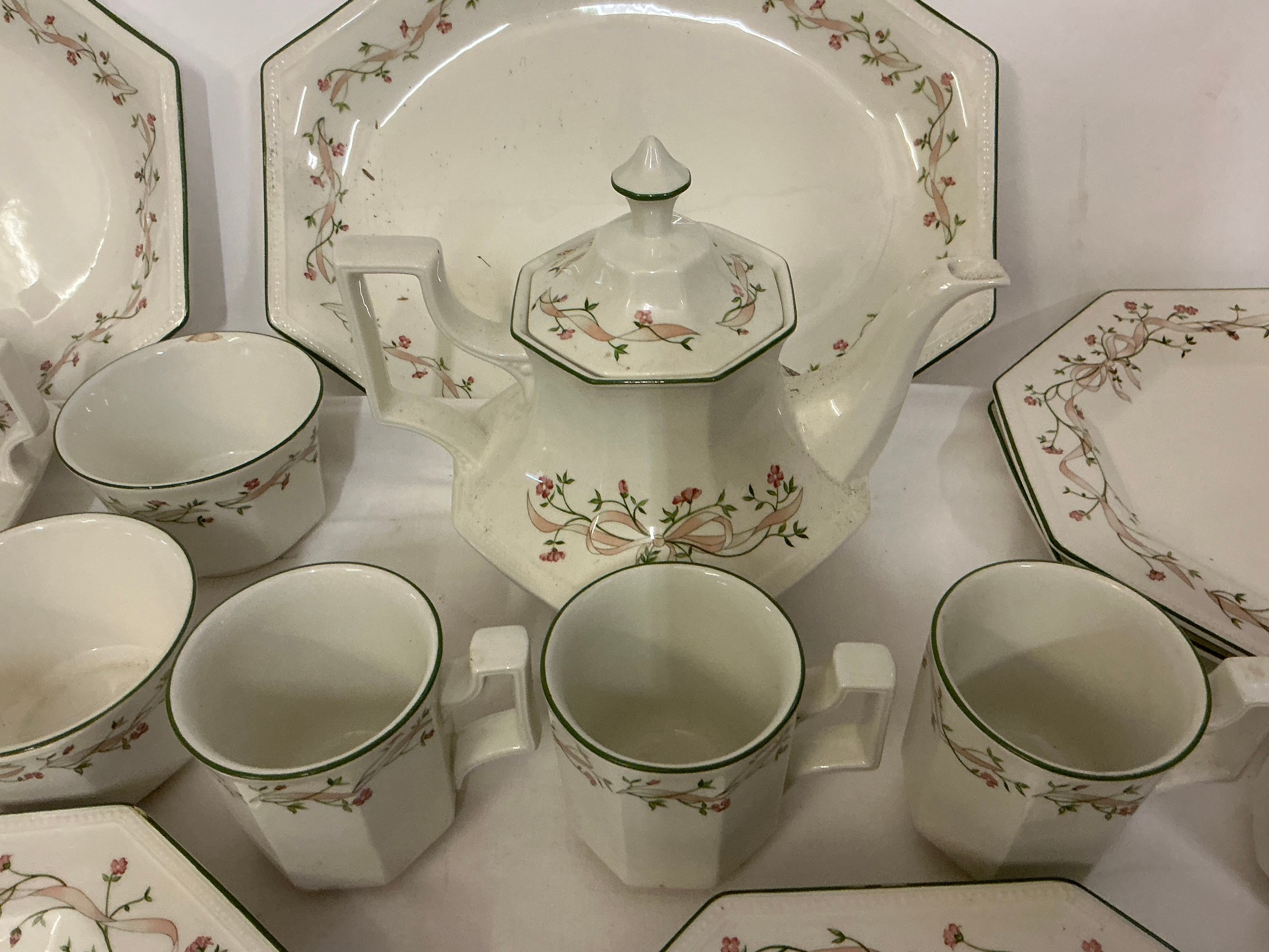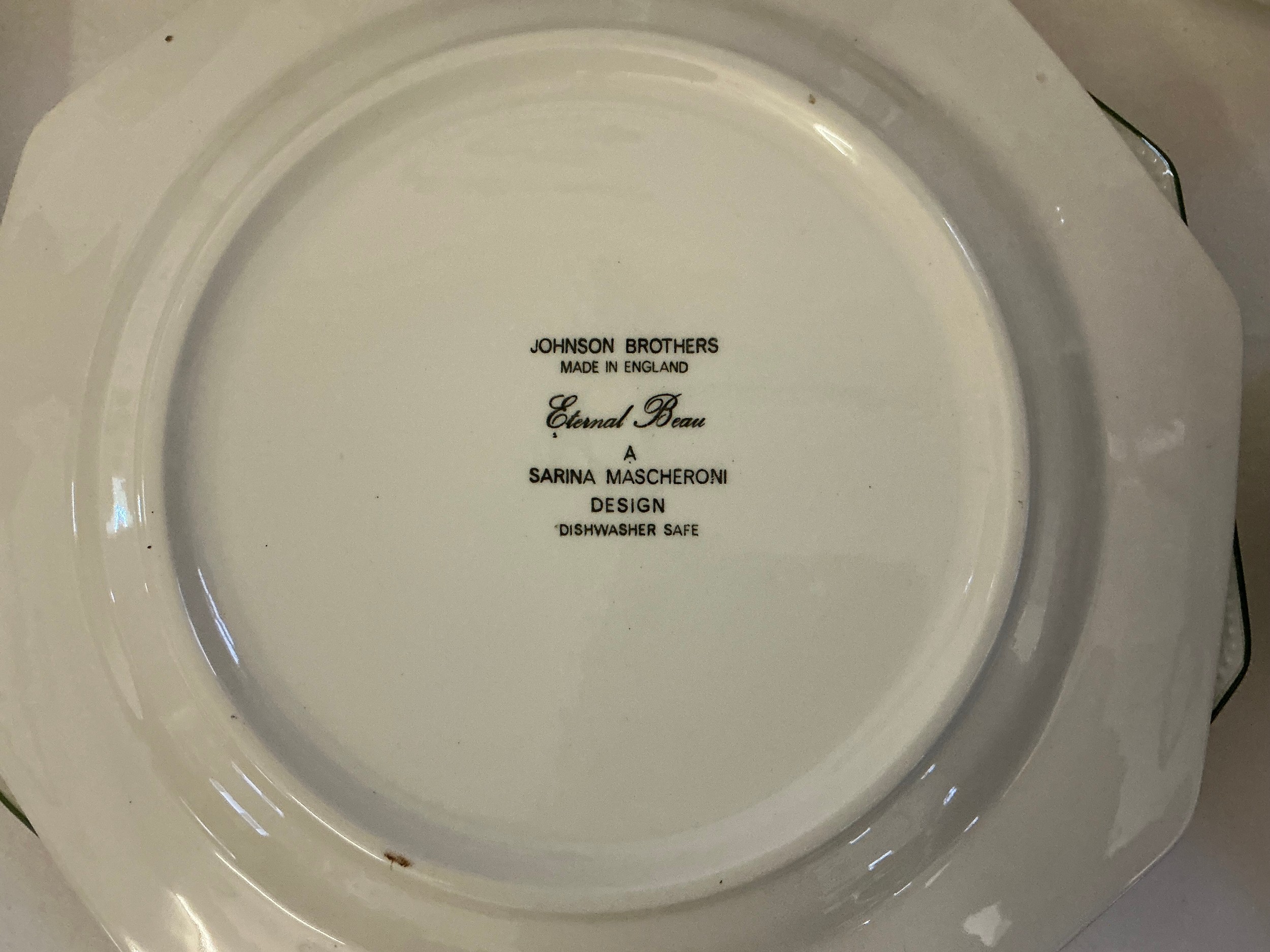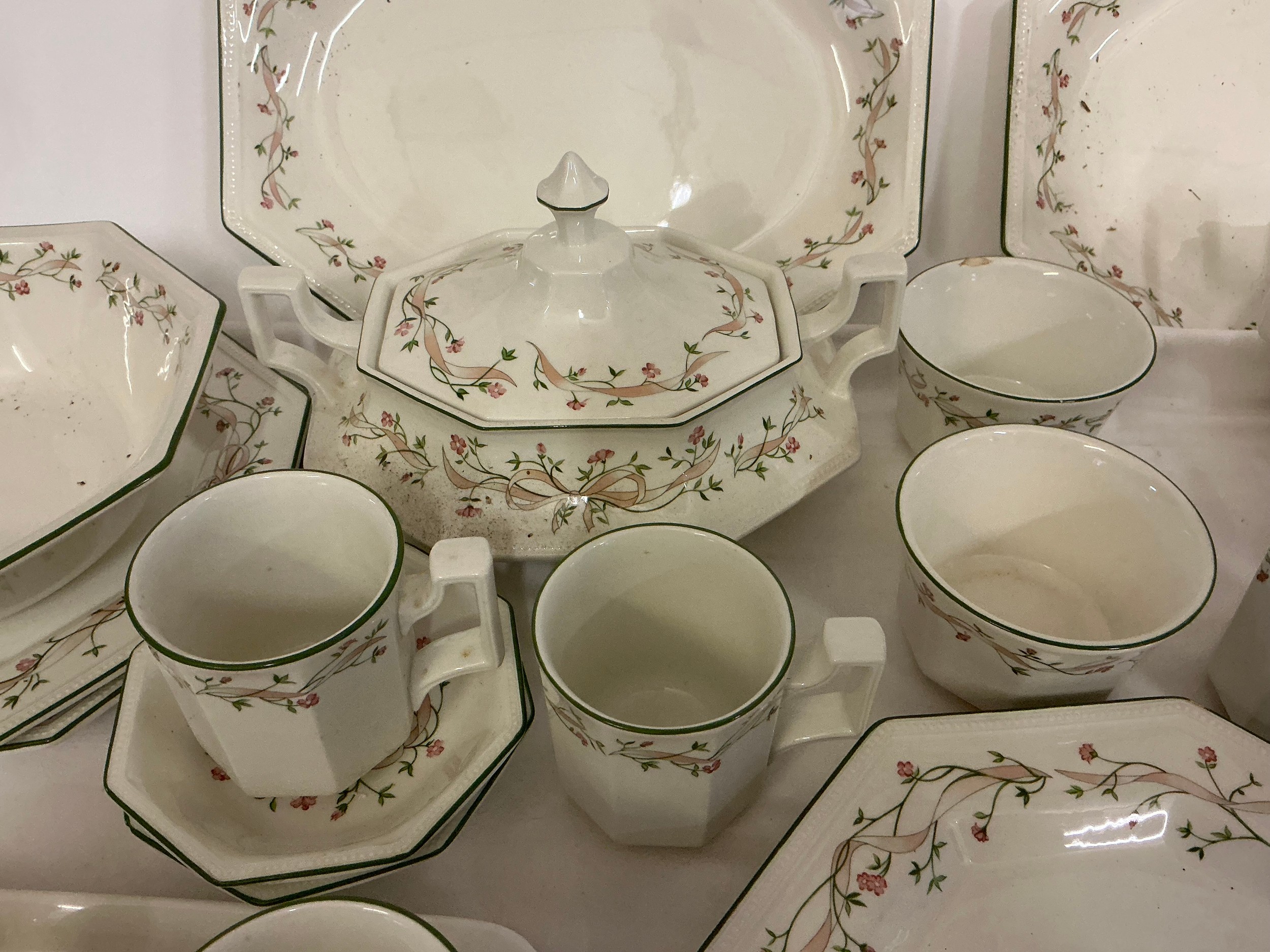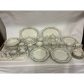 A Johnson Brothers Dinner & Tea Service in the "Eternal Beau" pattern to include Two Large Serving Plates, Dinner Plates, Tea Pot, Covered Tureen, Salt & Pepper, Sugar Bowl, Cups, Mugs & Saucers.