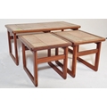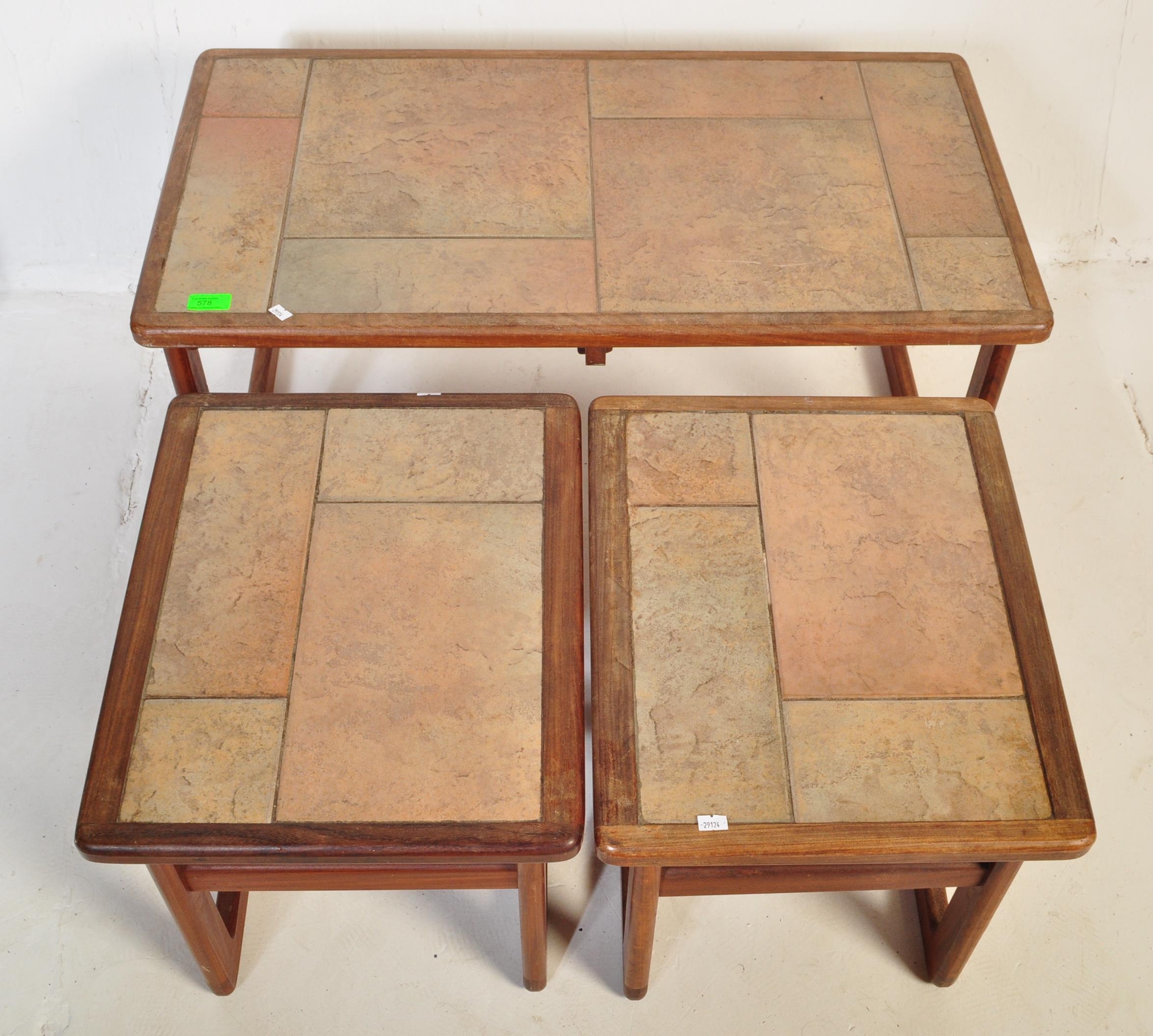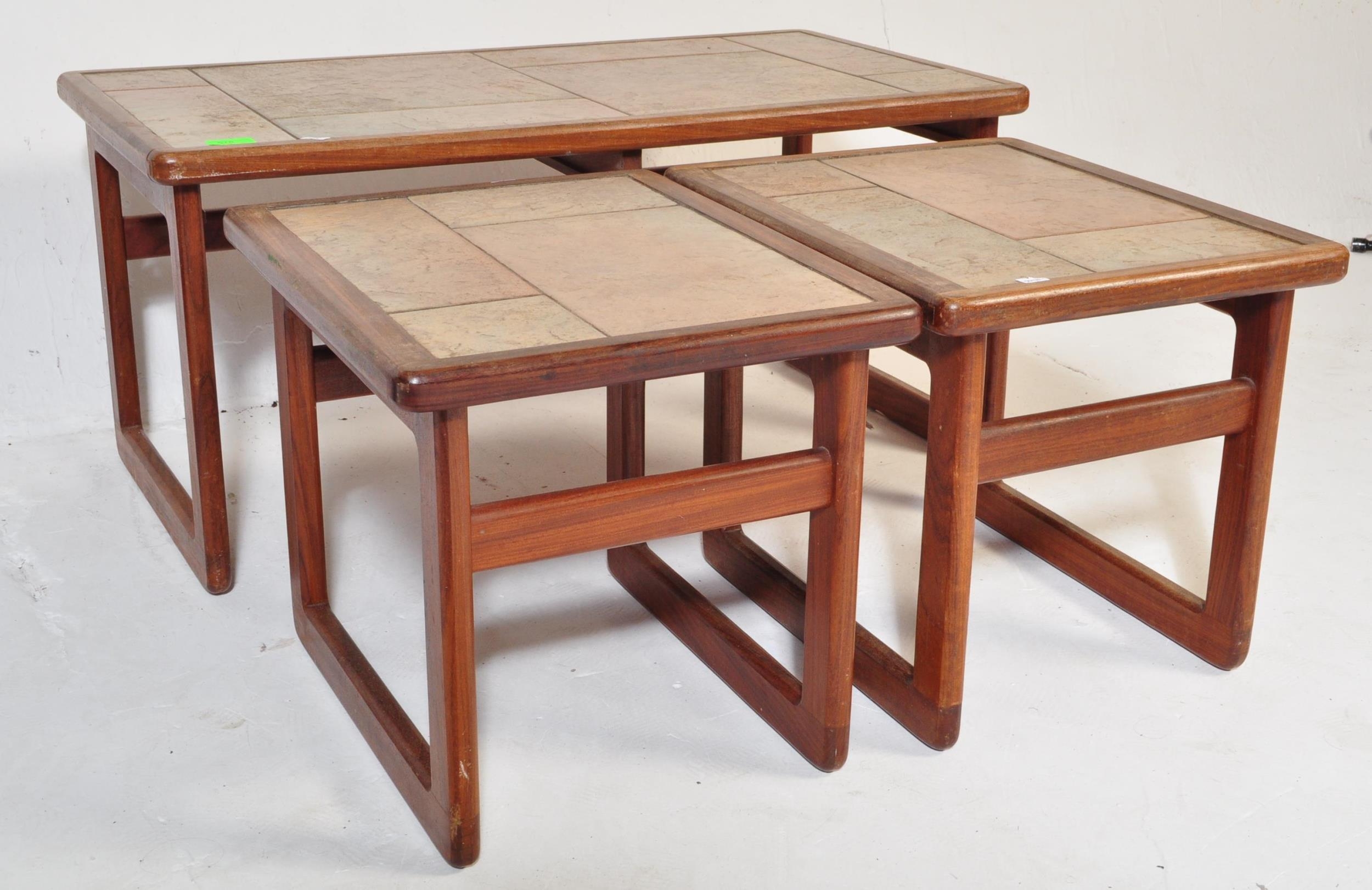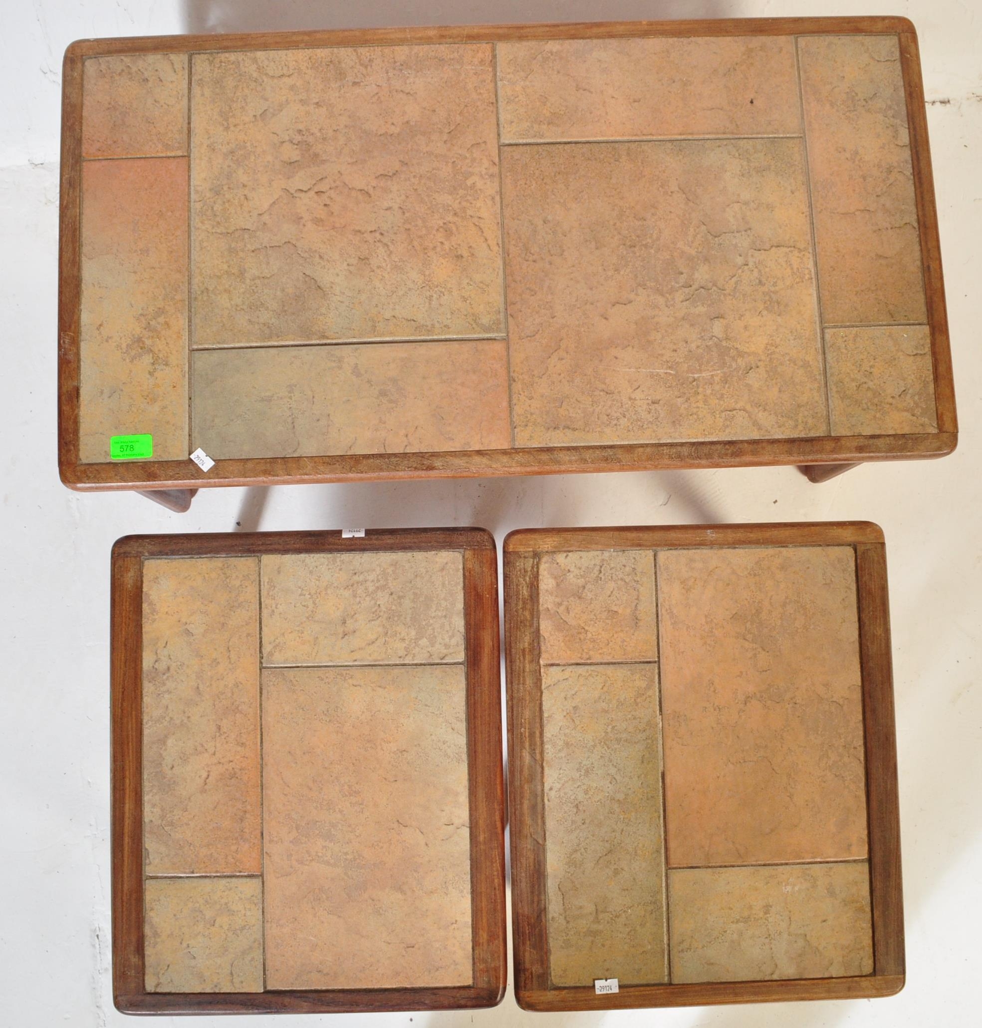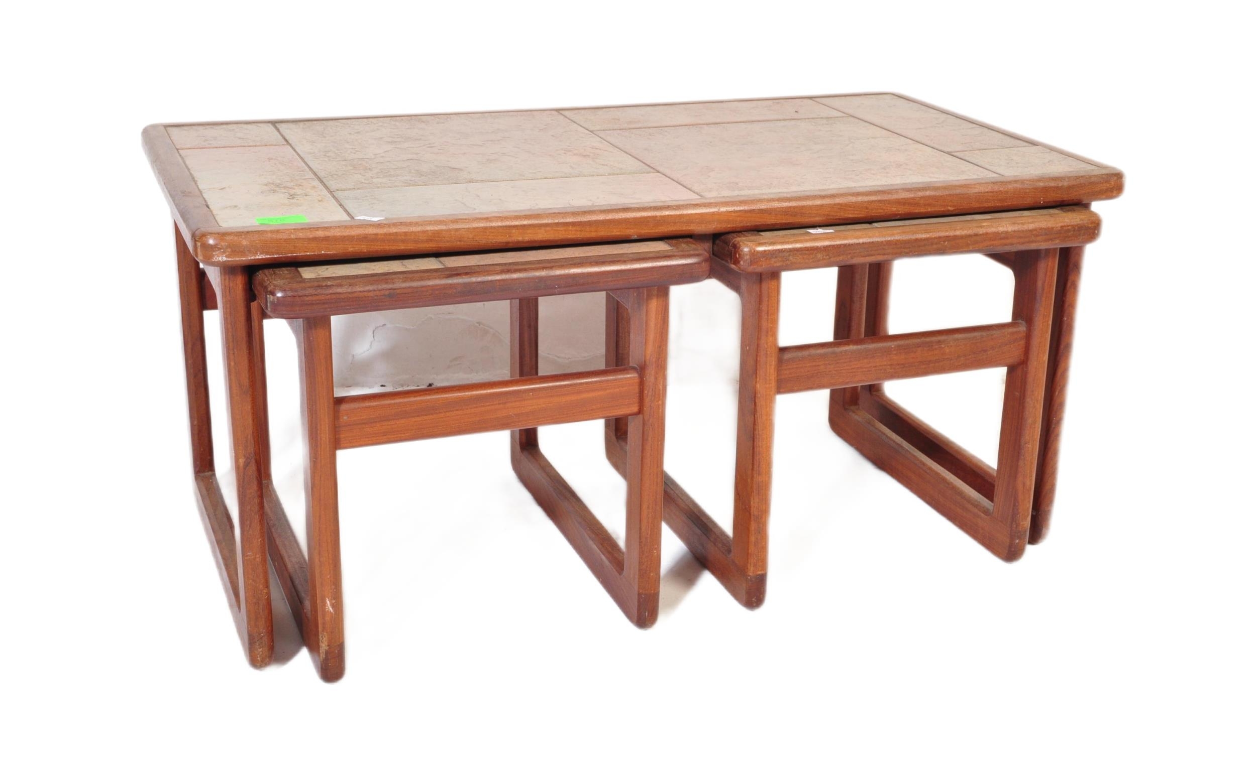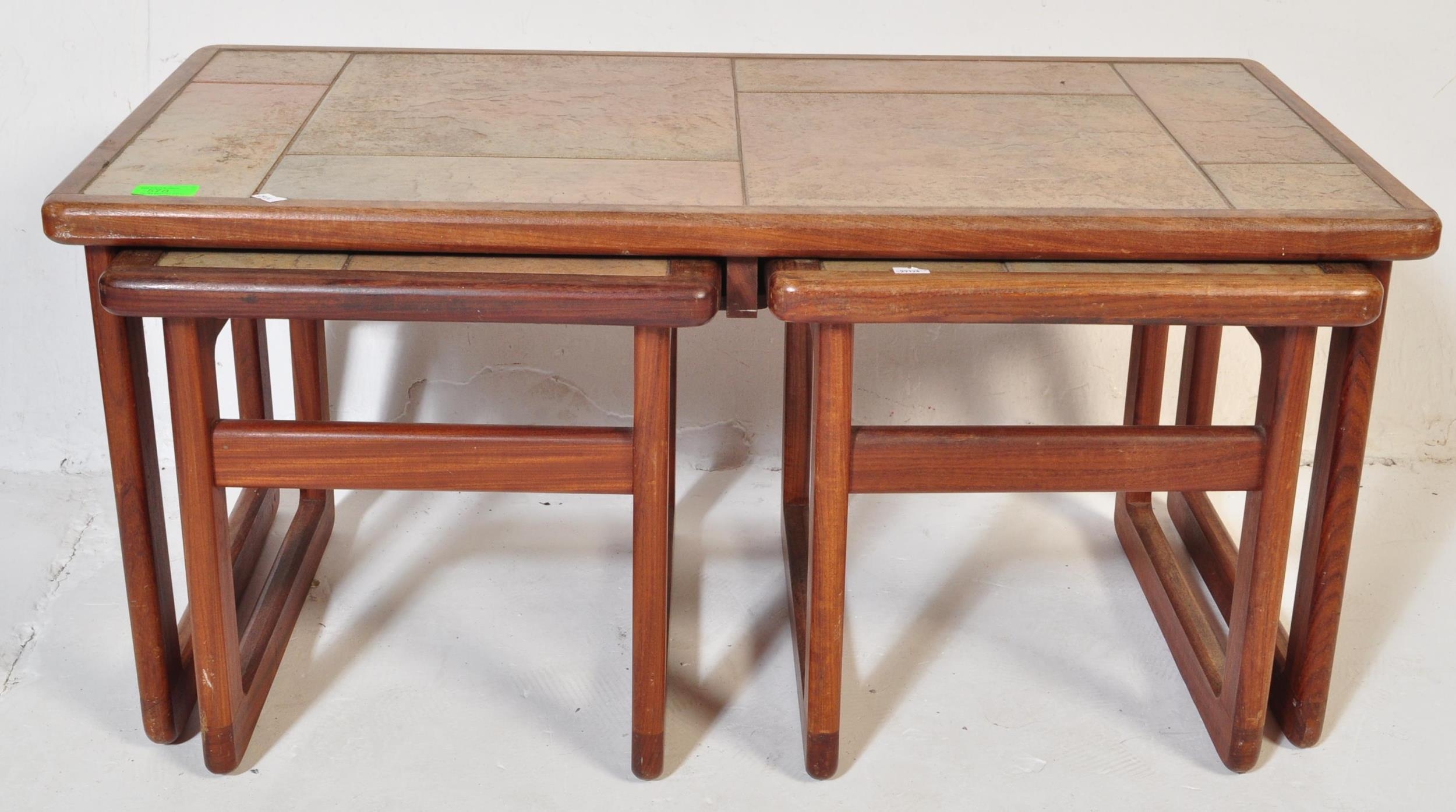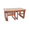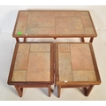 A mid 20th Century retro vintage tile top nest of tables. Of rectangular form with two other tile top tables with quadrille style legs united by a stretcher. Measures approx. Measures approx; 40cm x 85cm x 45cm.