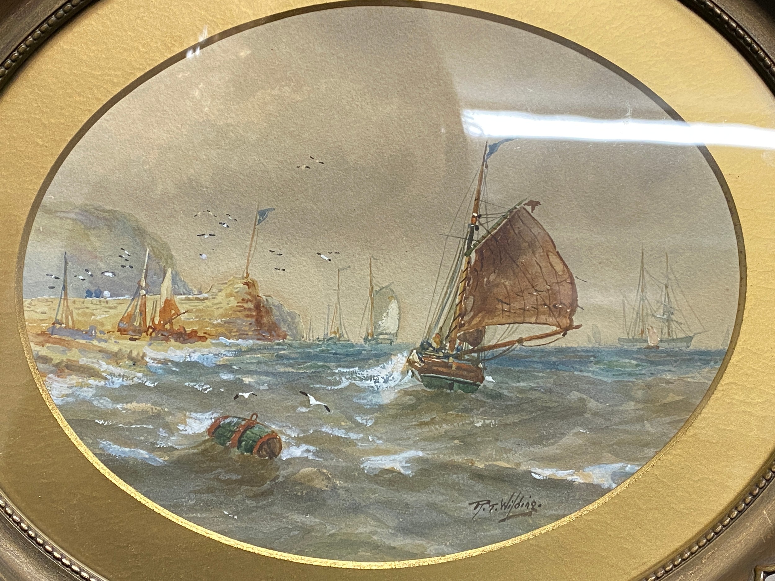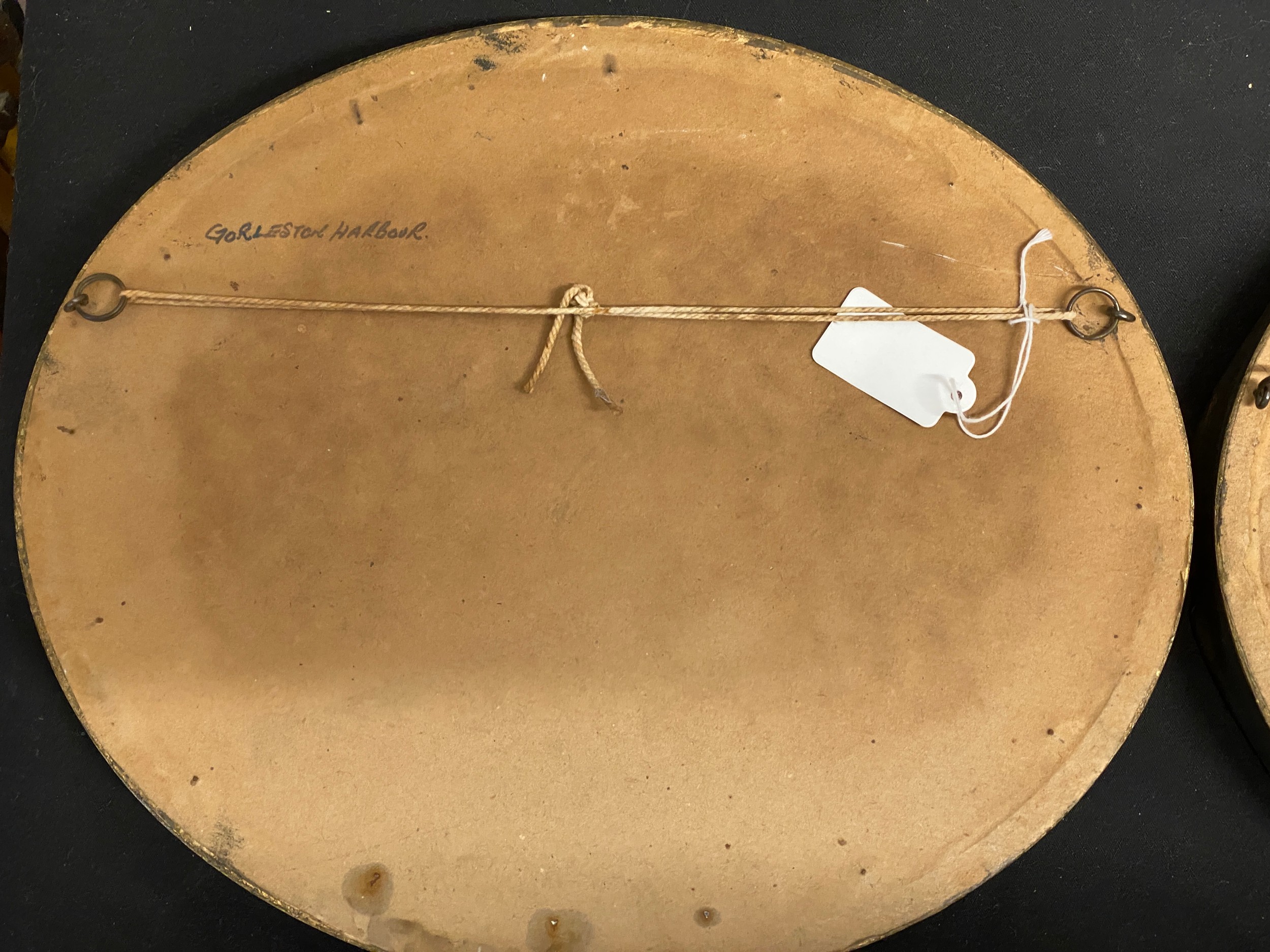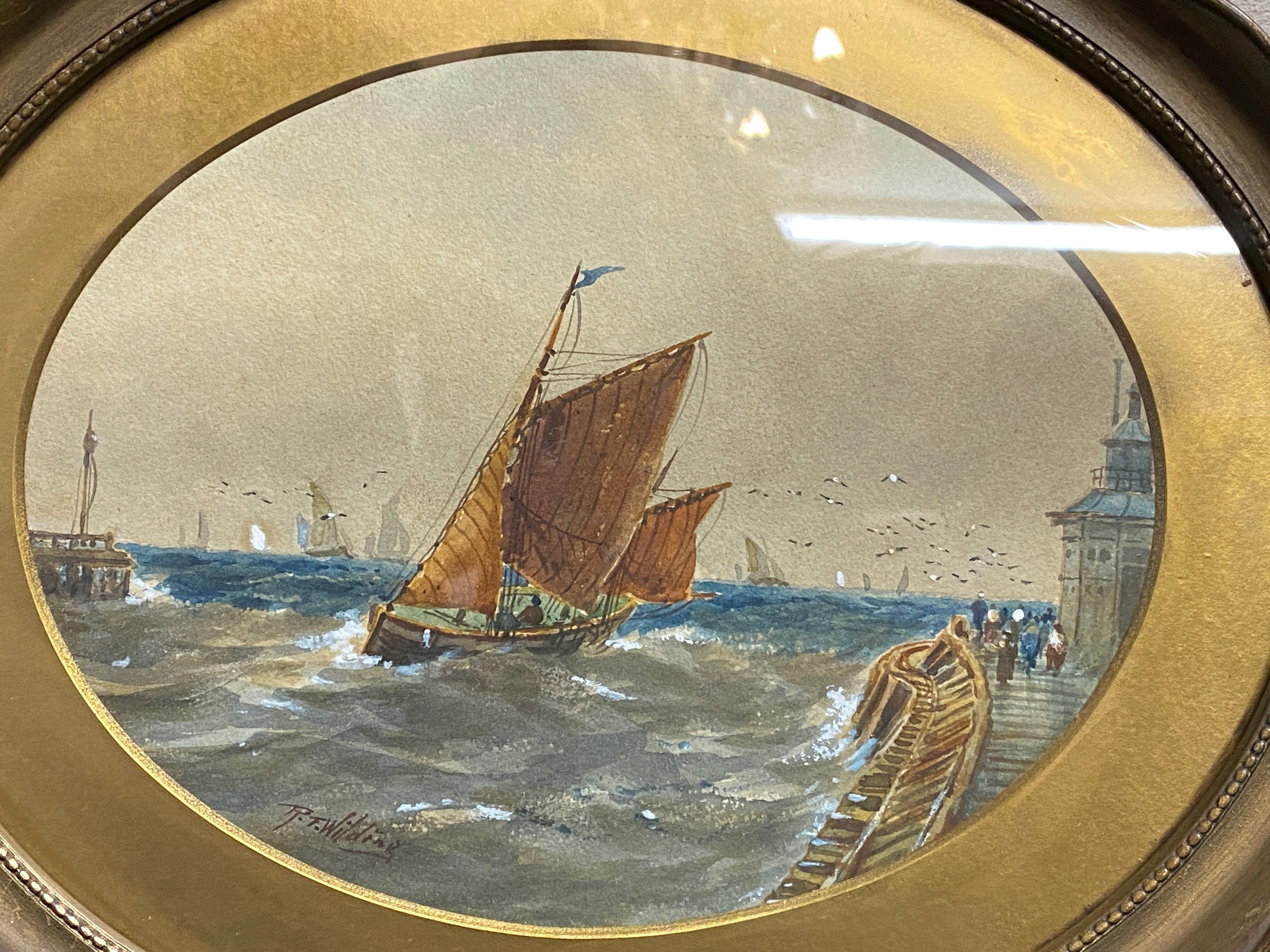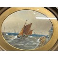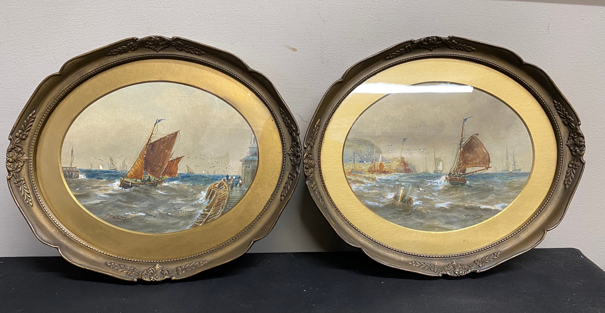 R T Wilding a pair of oval framed watercolours of coastal scenes Clovelly, Devon and Gorleston Harbour. Painting size 23cms w x 17.5cms h.