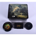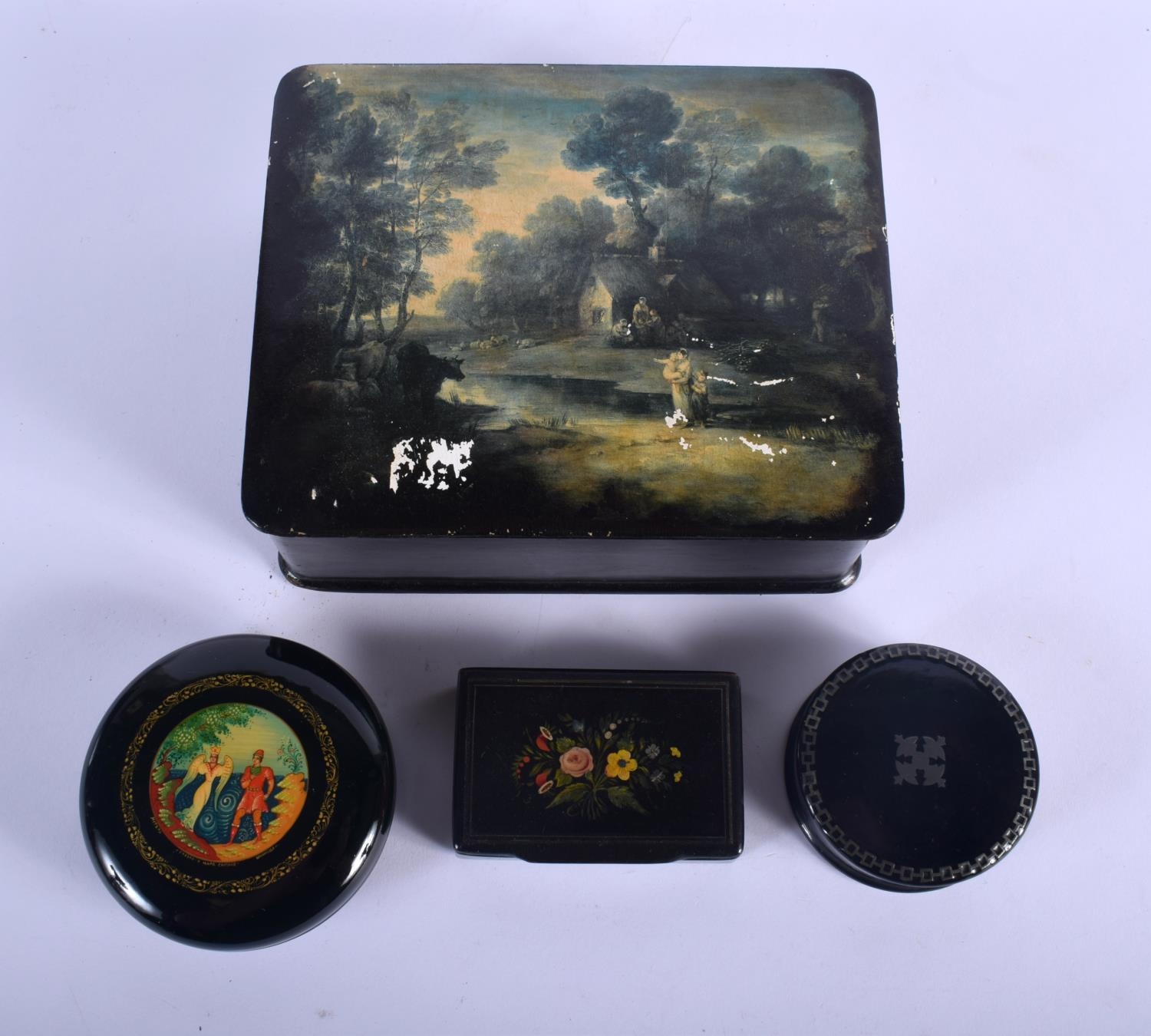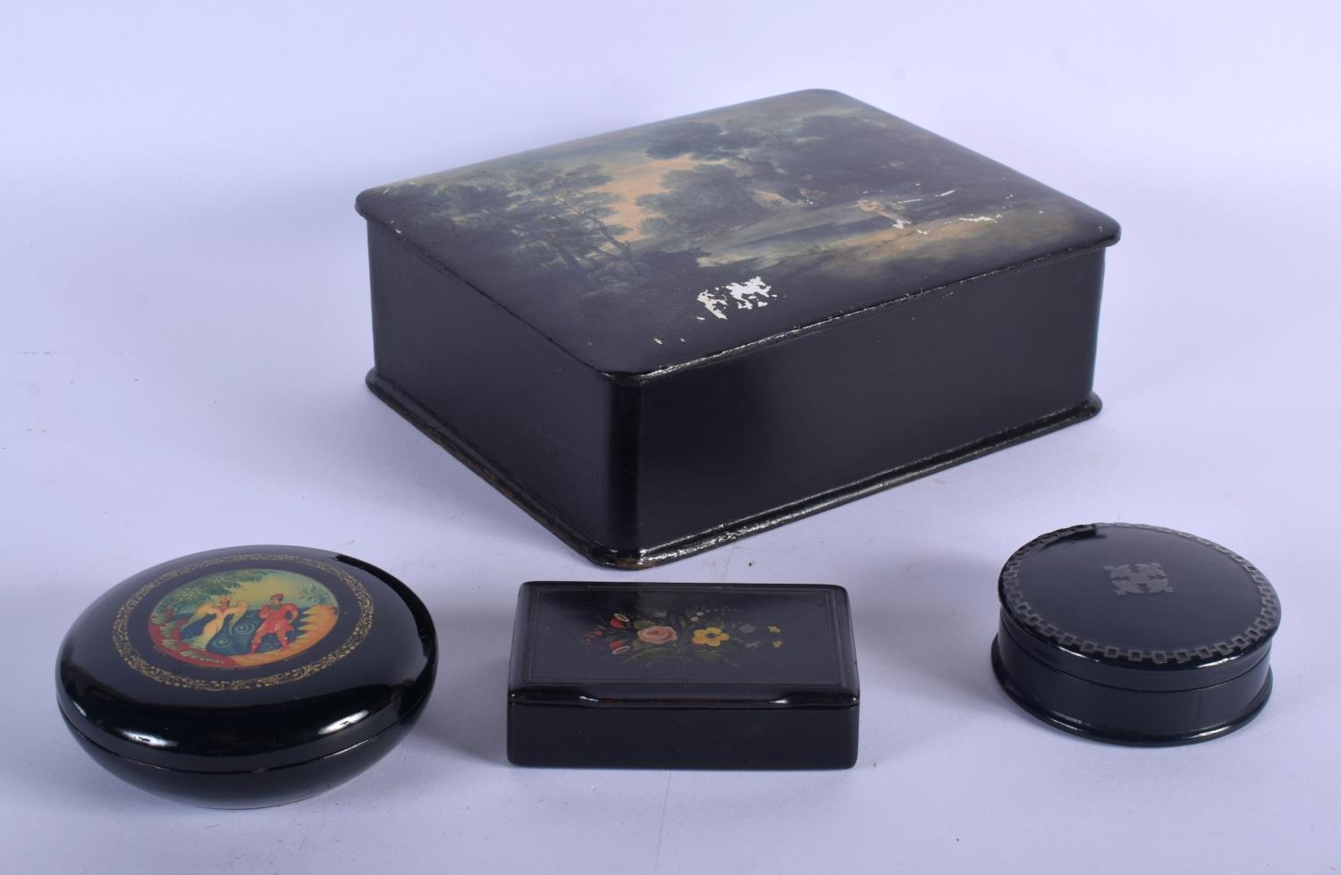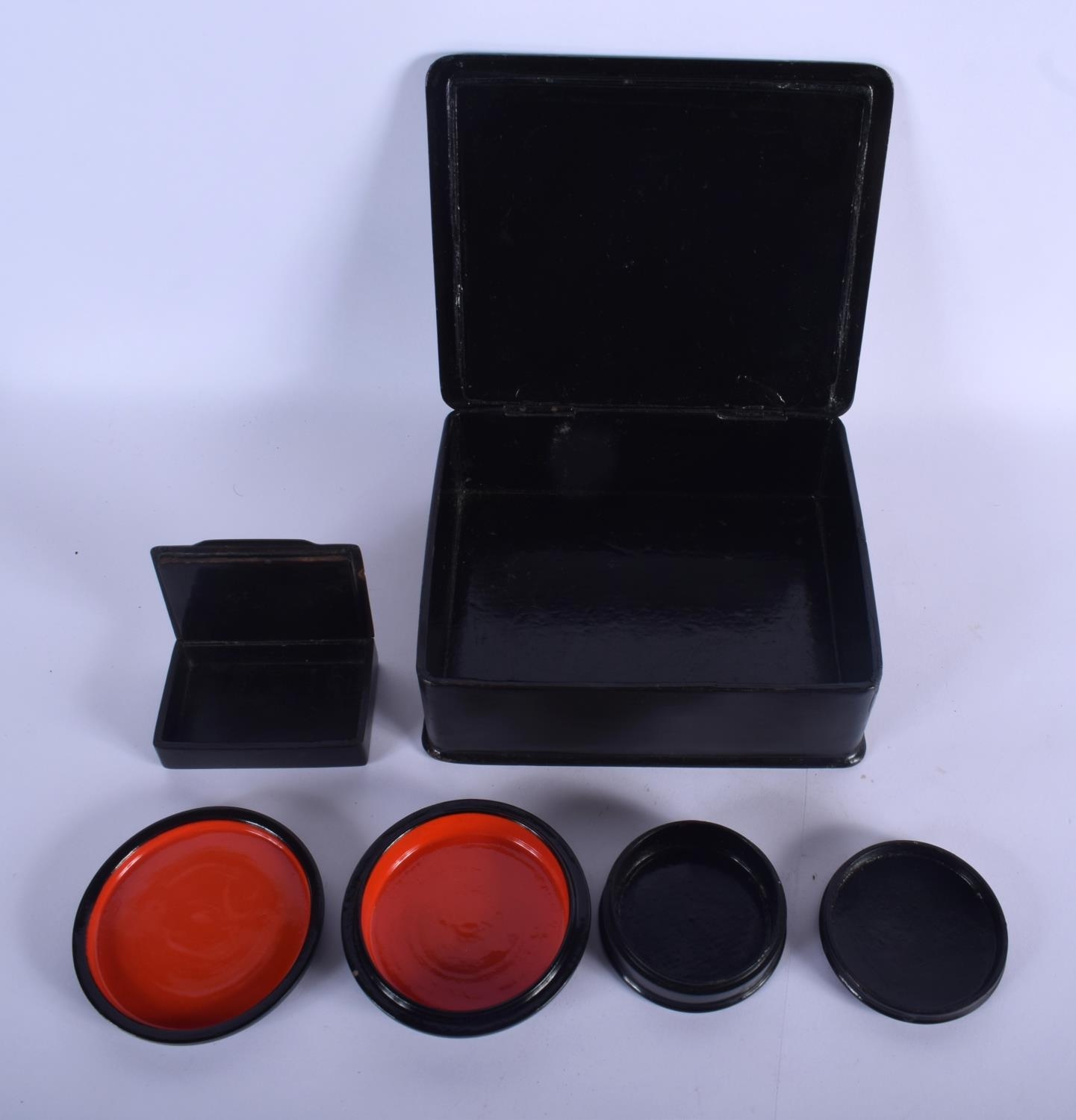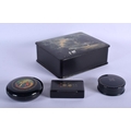 FOUR ANTIQUE BLACK LACQUER BOXES in various forms and sizes. Largest 18 cm x 15 cm. (4)