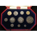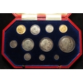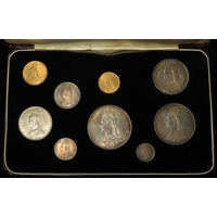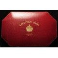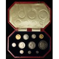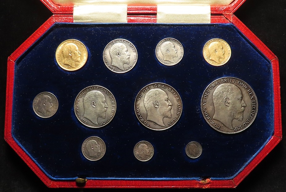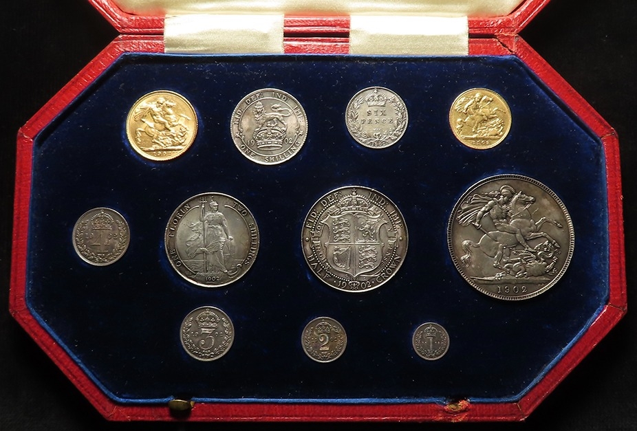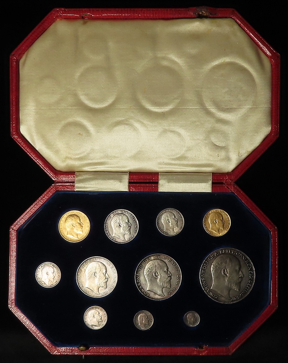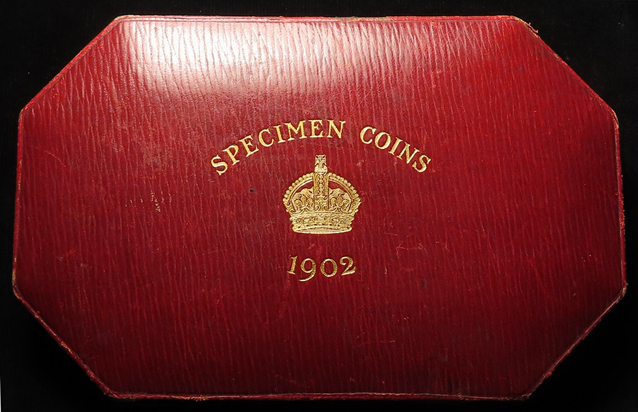 Specimen Set 1902 (11-coins) note this is not the matte proof set but a collection of mostly currency strikes housed in a proof set case: Gold: Sovereign EF, Half-Sovereign GF-nVF; Silver: Crown to Sixpence all similar toned EF-UNC, and the Maundy Set which is matte proof, similar toned, aFDC. The case has one broken/missing latch but otherwise good condition.