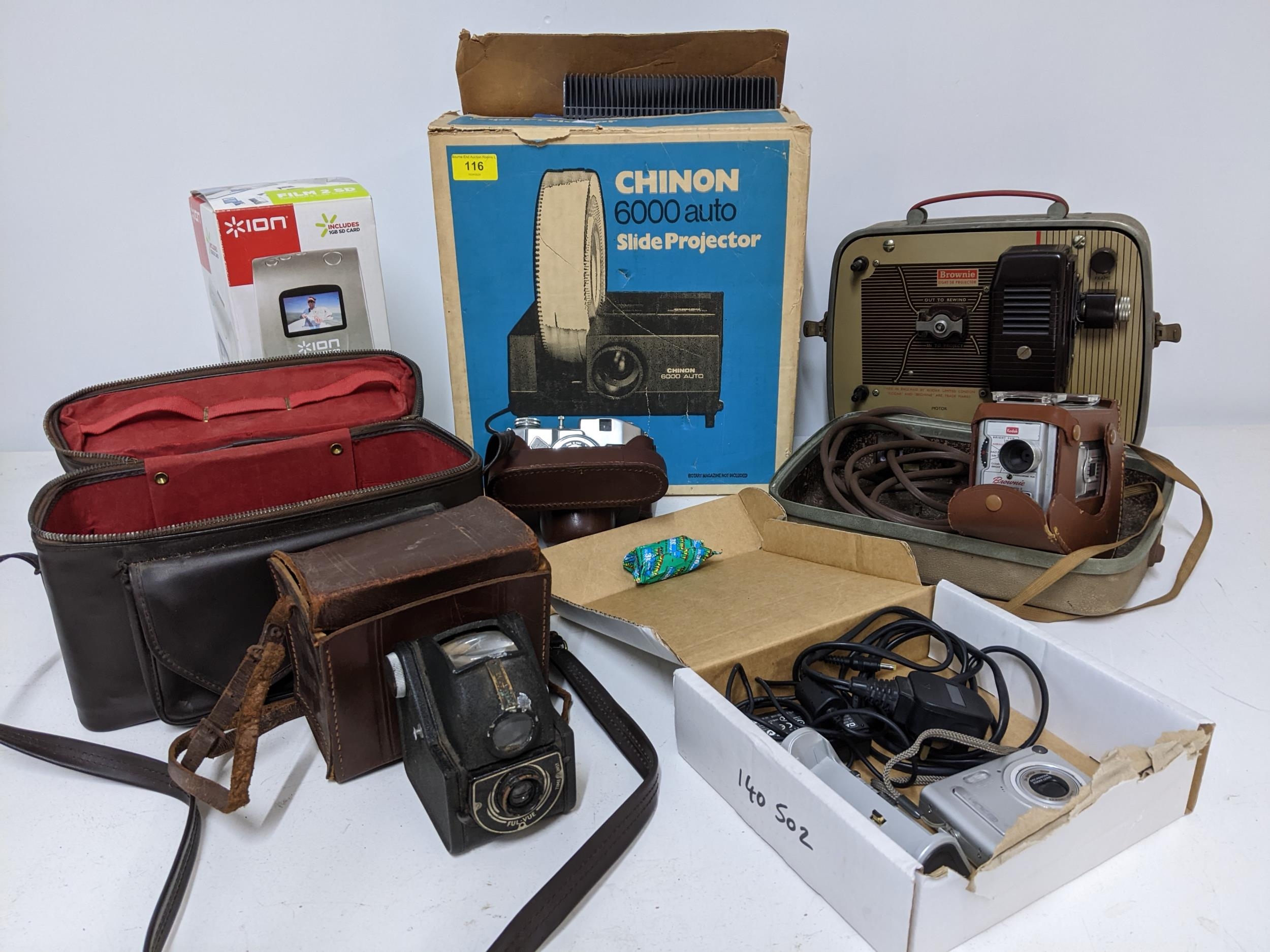 A selection of vintage film and digital cameras to include a Koroll Benamie film 120 leather cased camera, a Brownie Eight 58 projector, Kodak Brownie 8 mm movie camera II, Casio EXiliM 4.0 mega pixels digital camera and others.