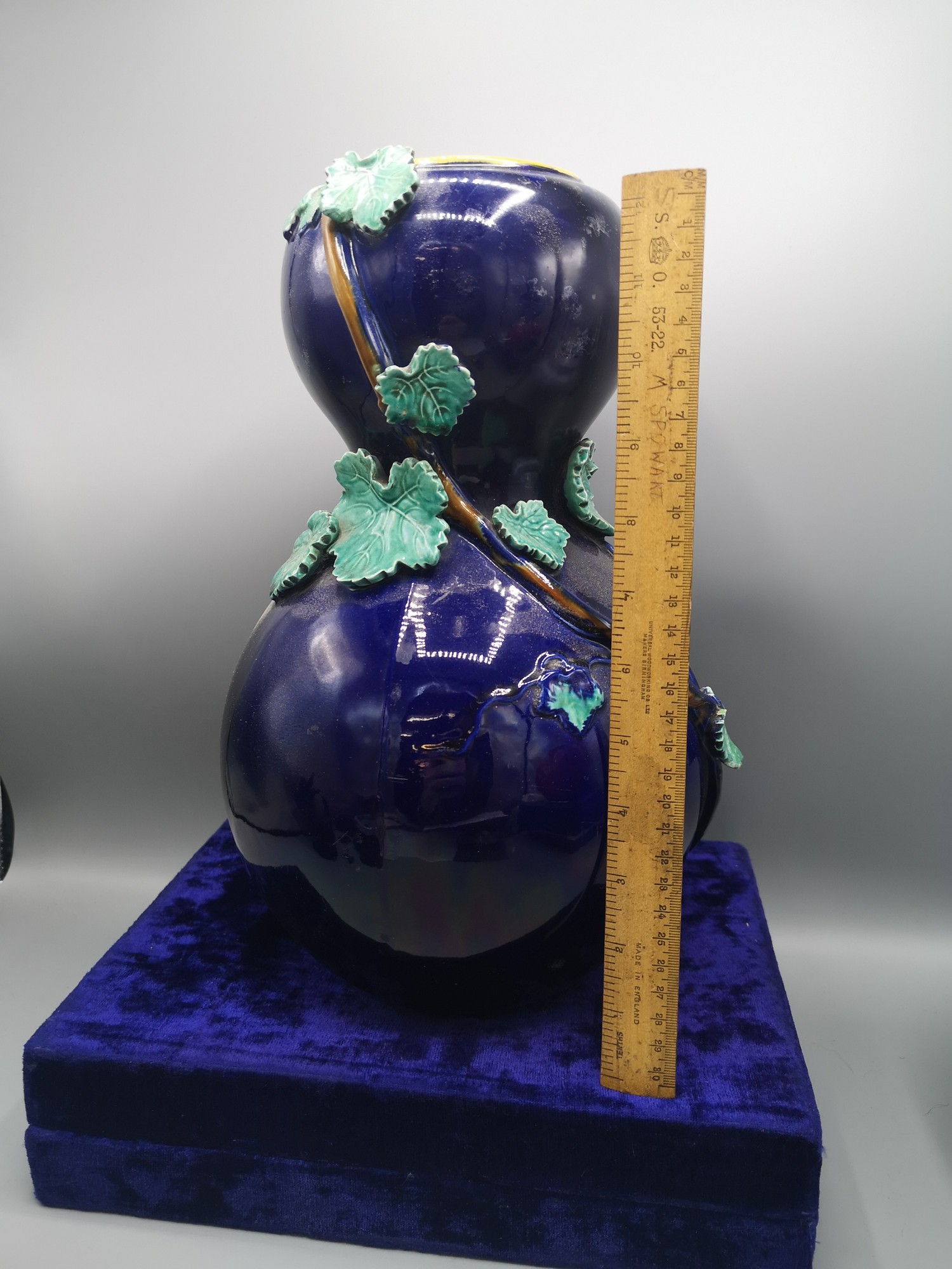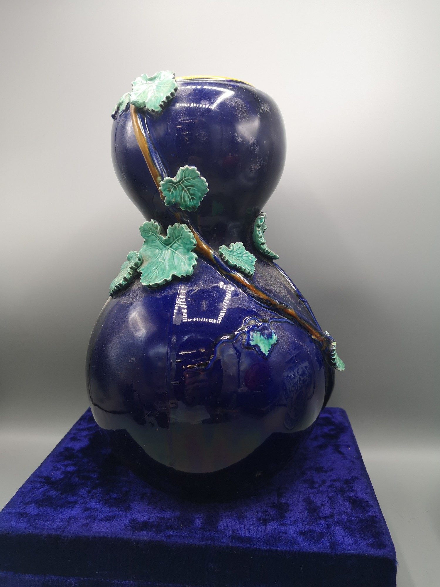1900s large french blue porcelain vase with leaf design .