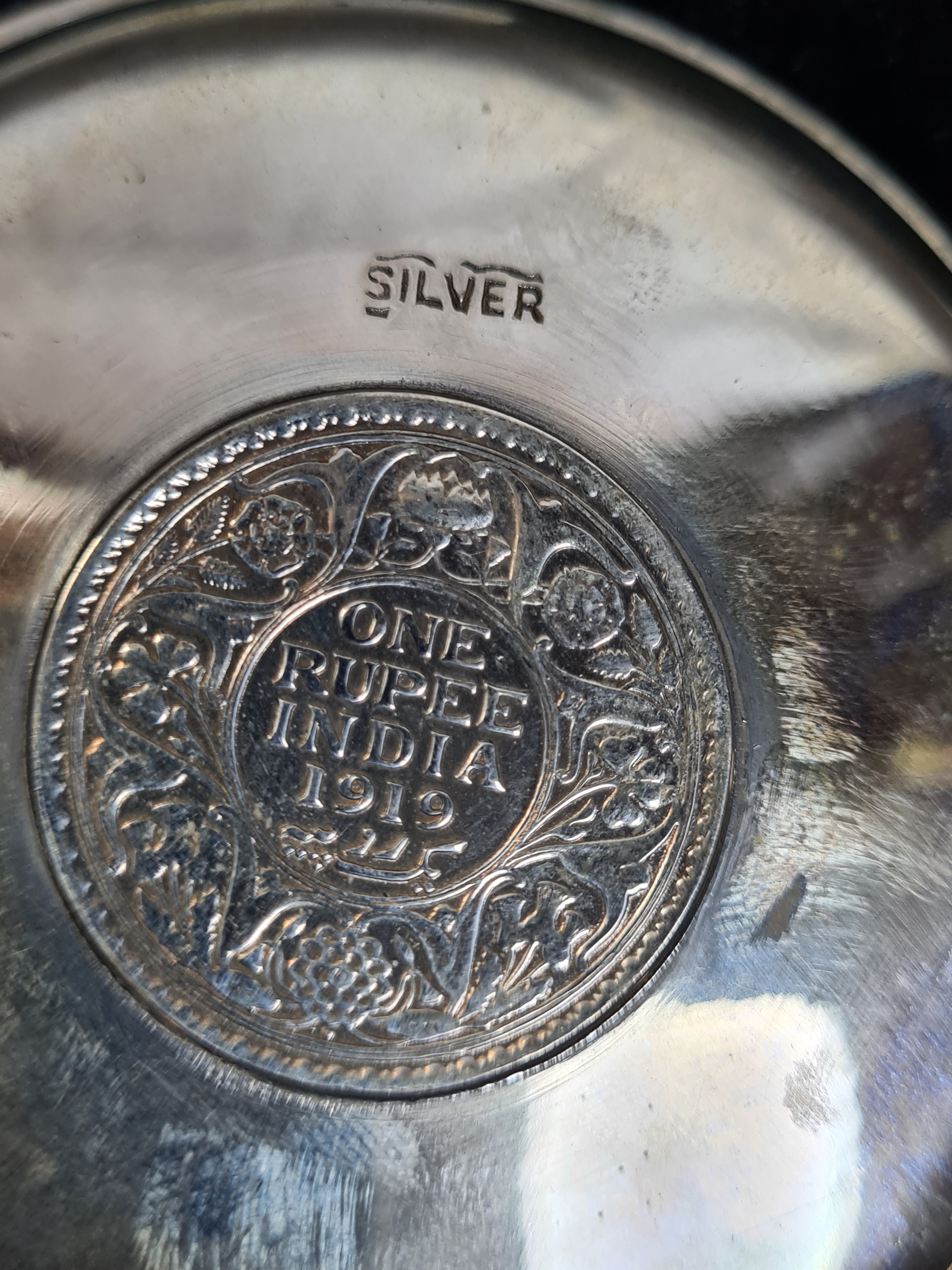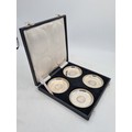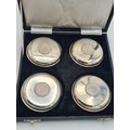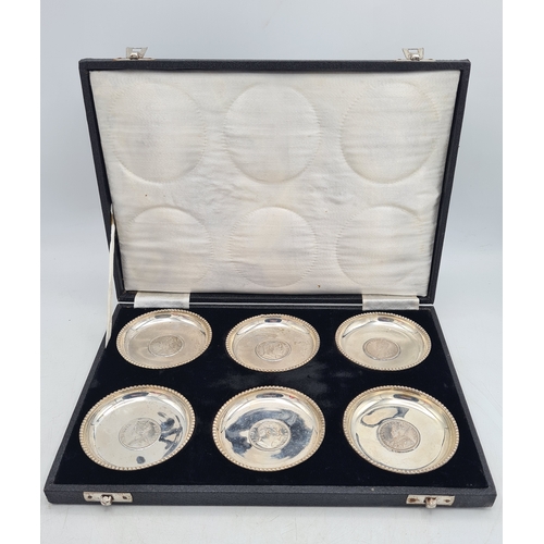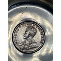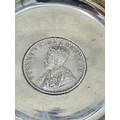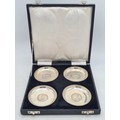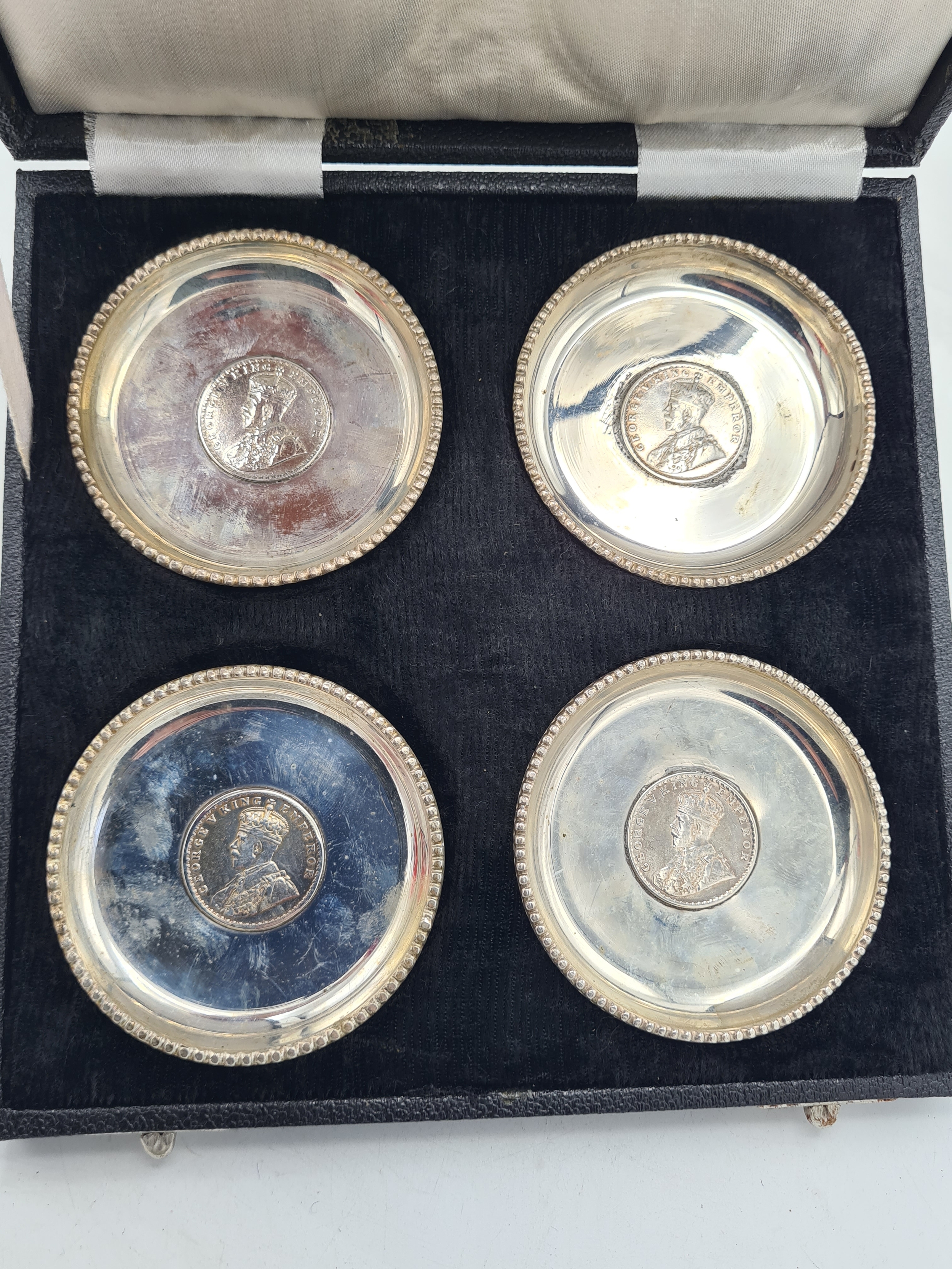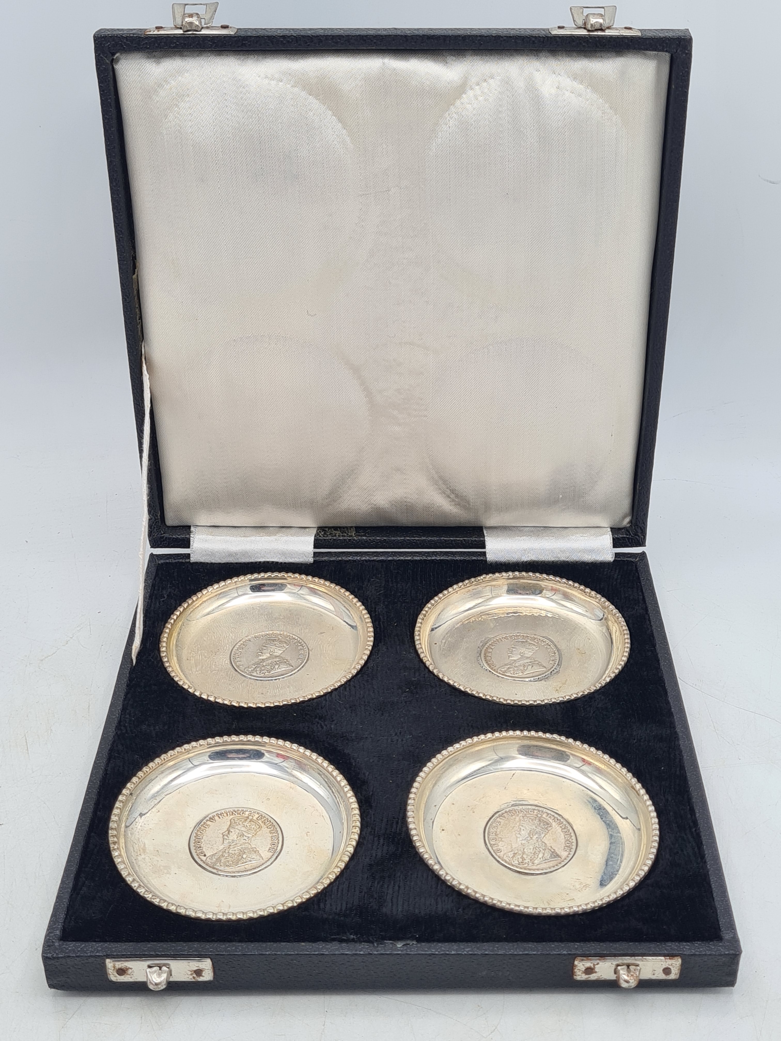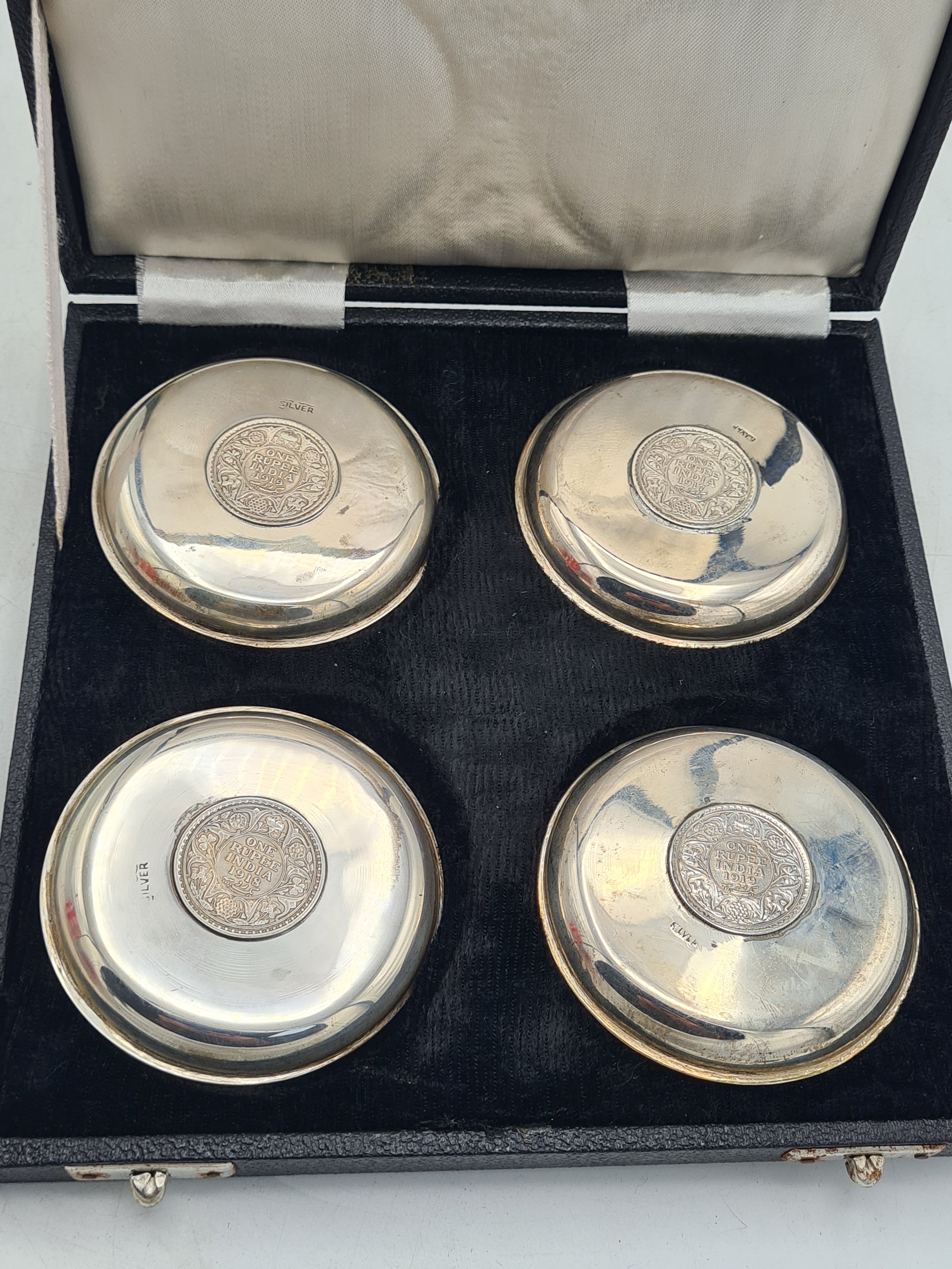 A presentation set of 4x 1 Indian Rupee Coin Silver Dishes, Each dish has an original coin in the middle measures 8cm in diameter by 1 cm high. Dishes are all marked Silver and include years 1917, 1918 & 2 x 1919. The box measures 21cm x 21cm x2.5cm and has a red embossed crown on the lid.