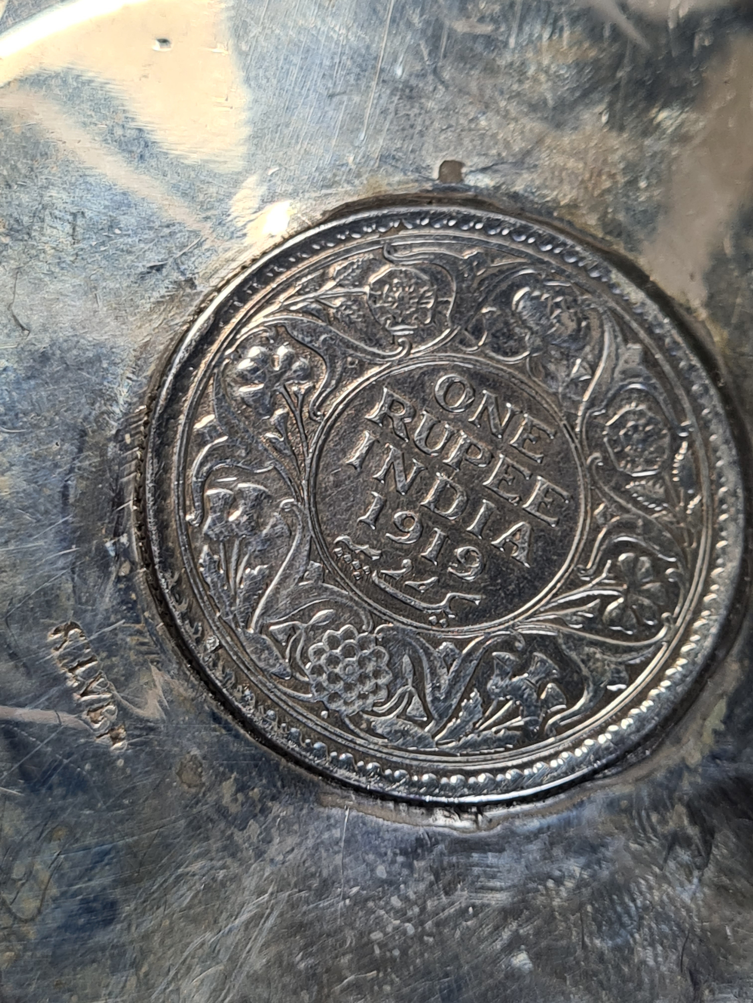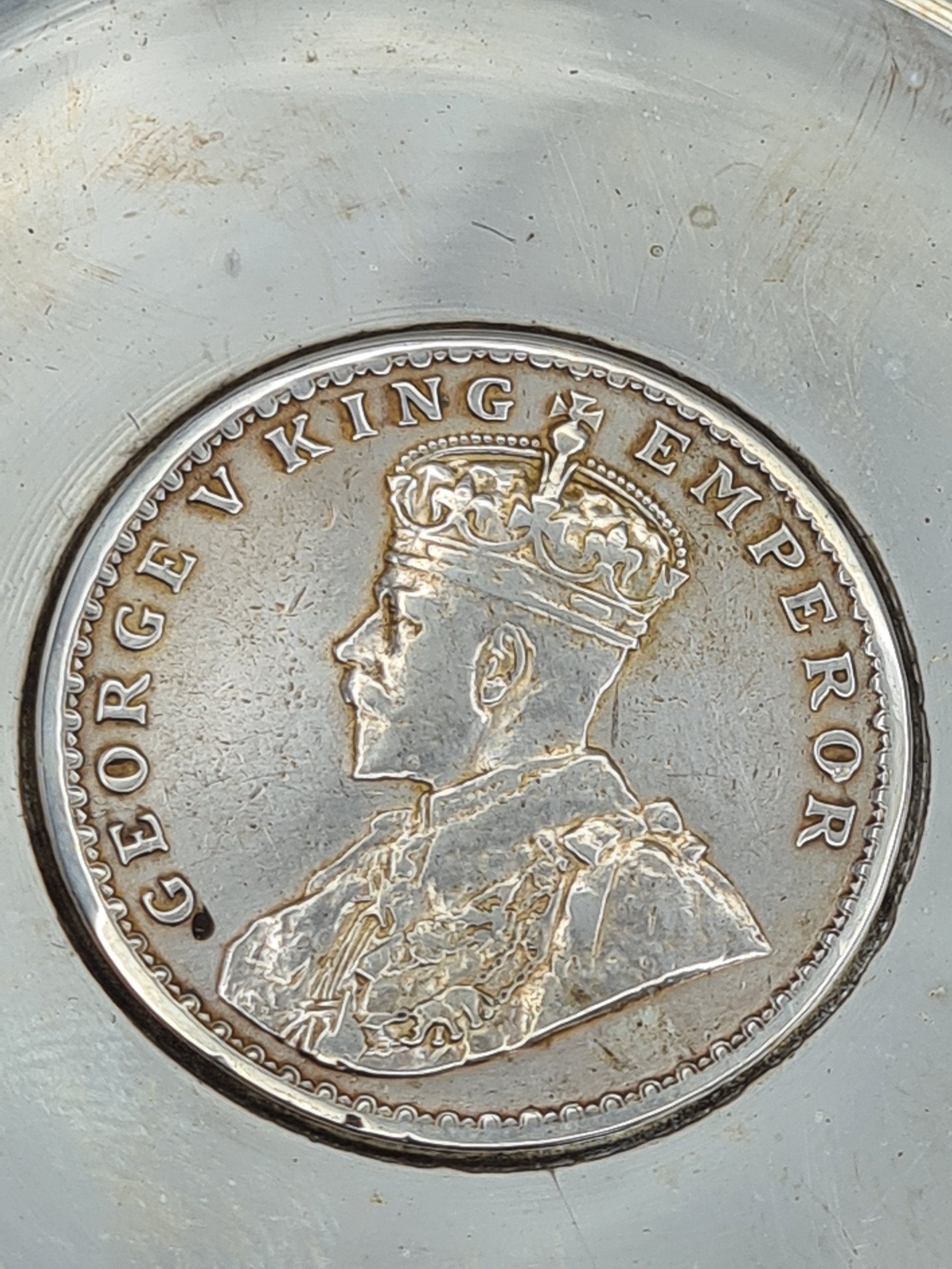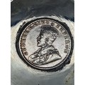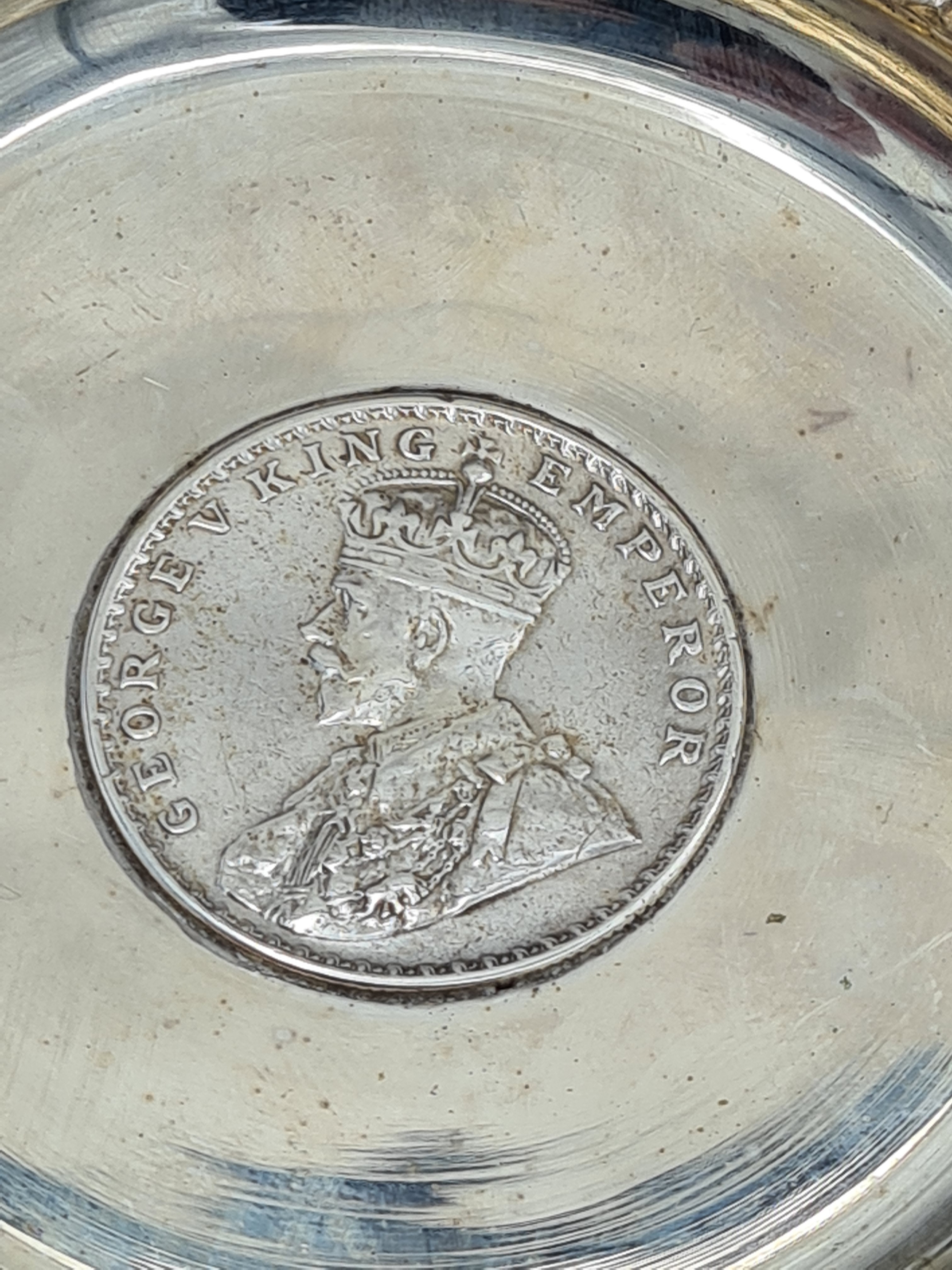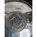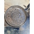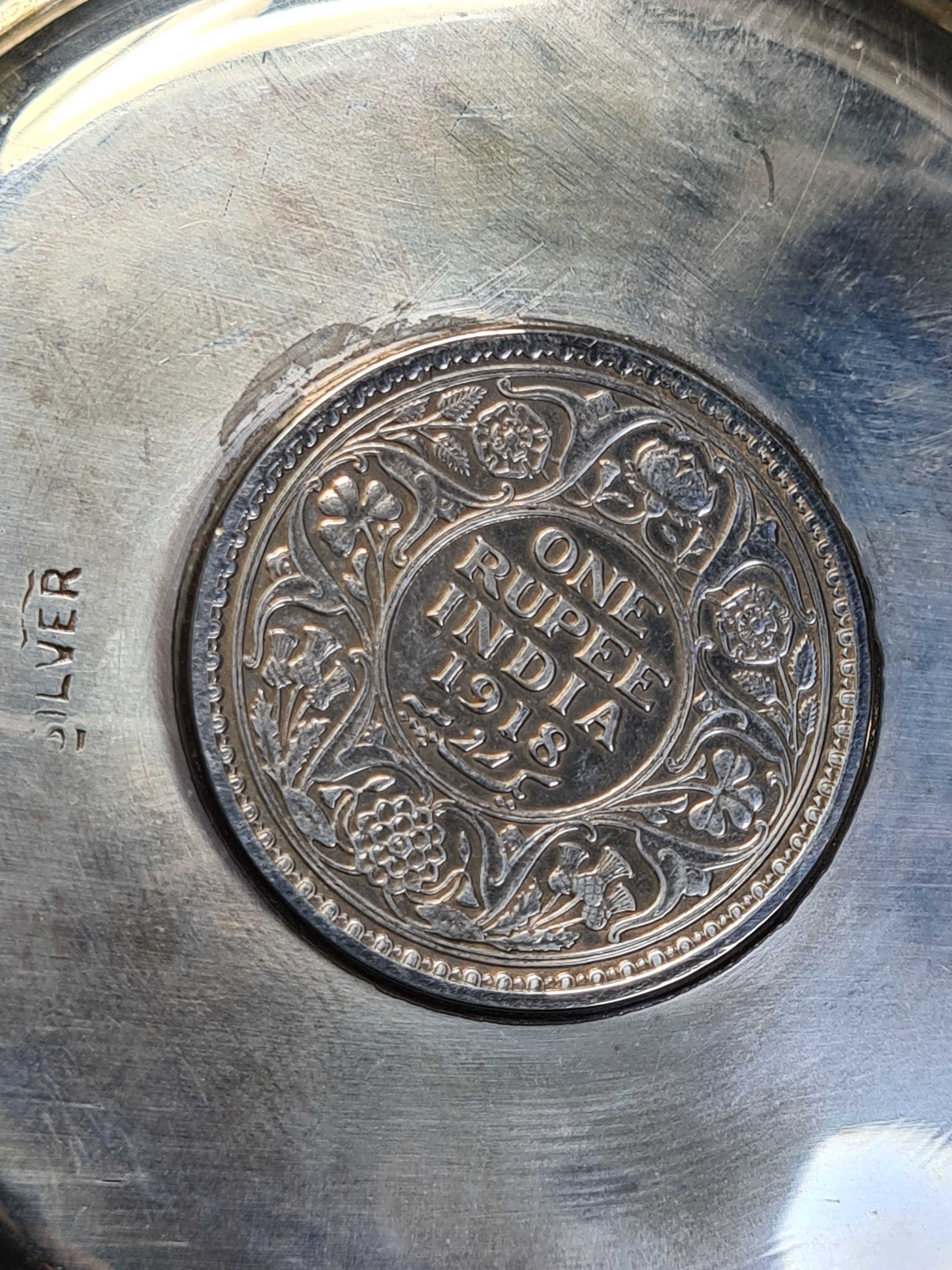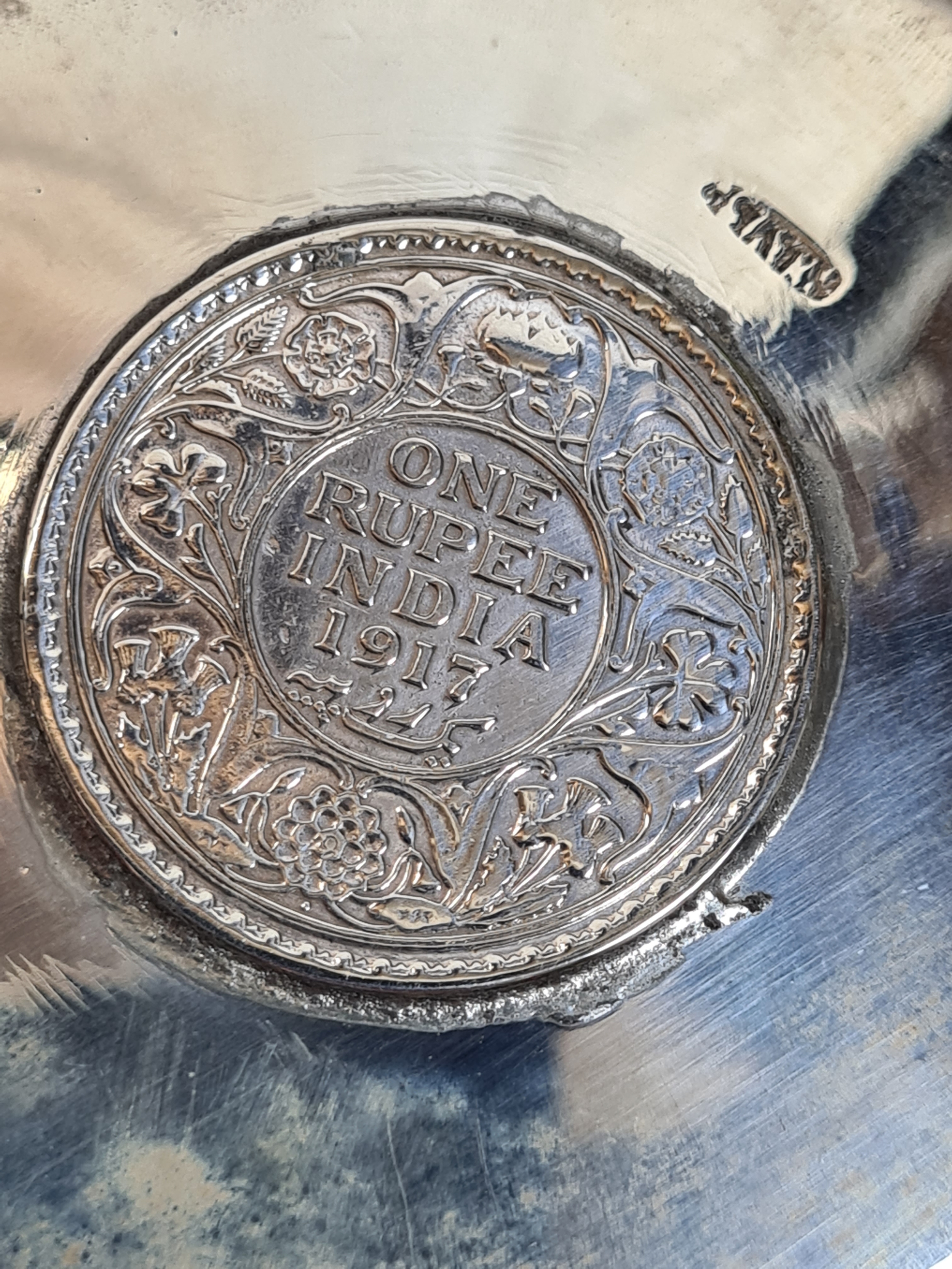 A presentation set of 4x 1 Indian Rupee Coin Silver Dishes, Each dish has an original coin in the middle measures 8cm in diameter by 1 cm high. Dishes are all marked Silver and include years 1917, 1918 & 2 x 1919. The box measures 21cm x 21cm x2.5cm and has a red embossed crown on the lid.