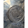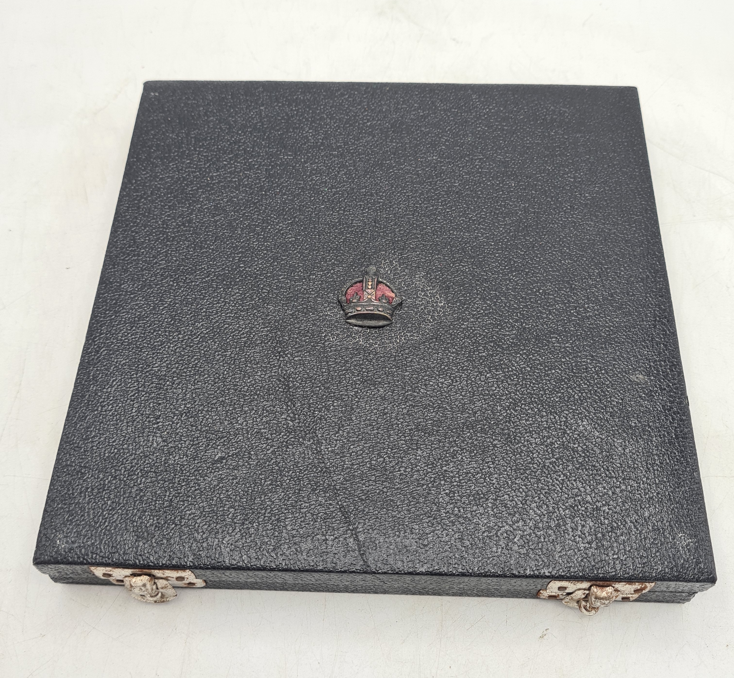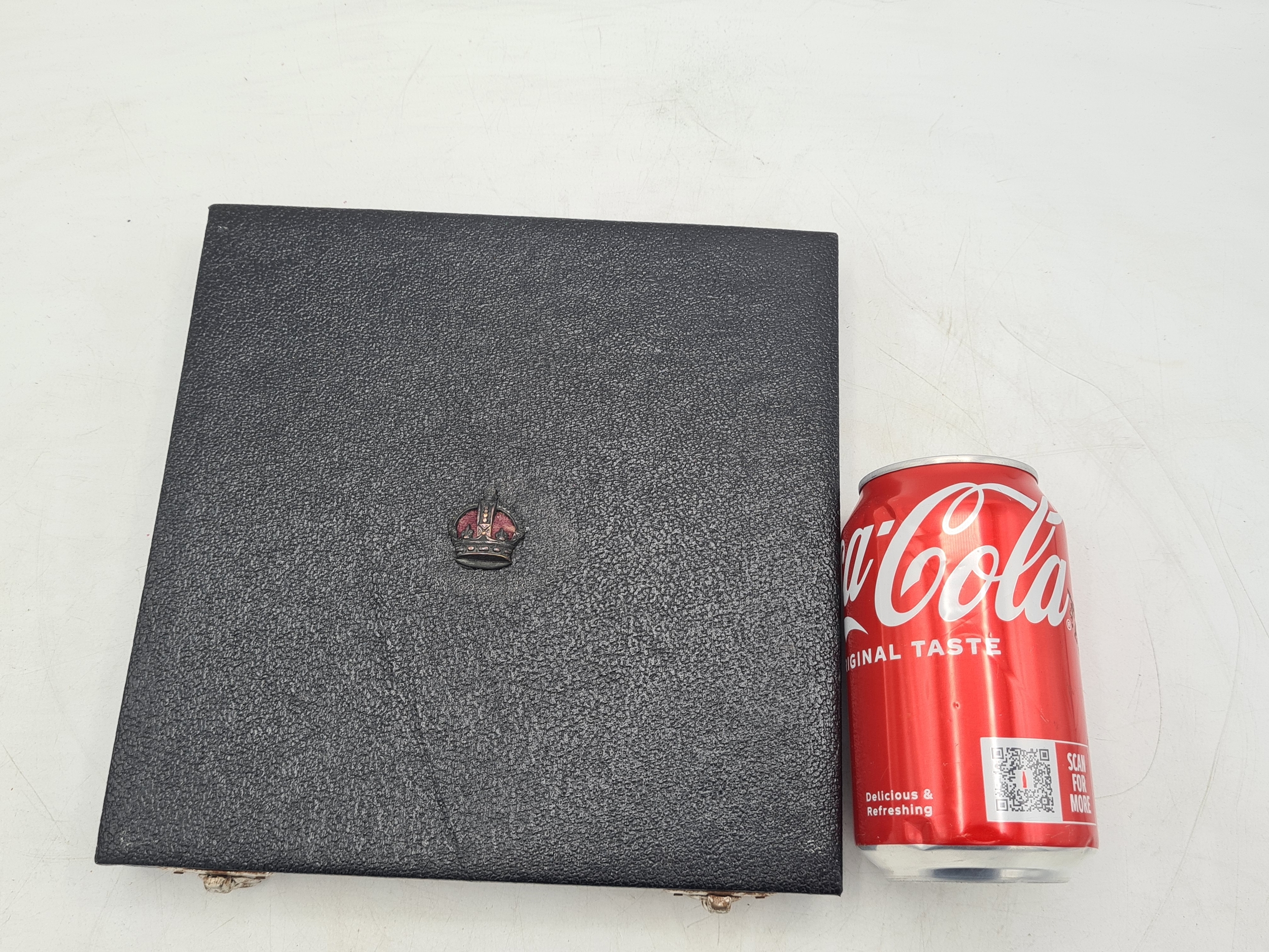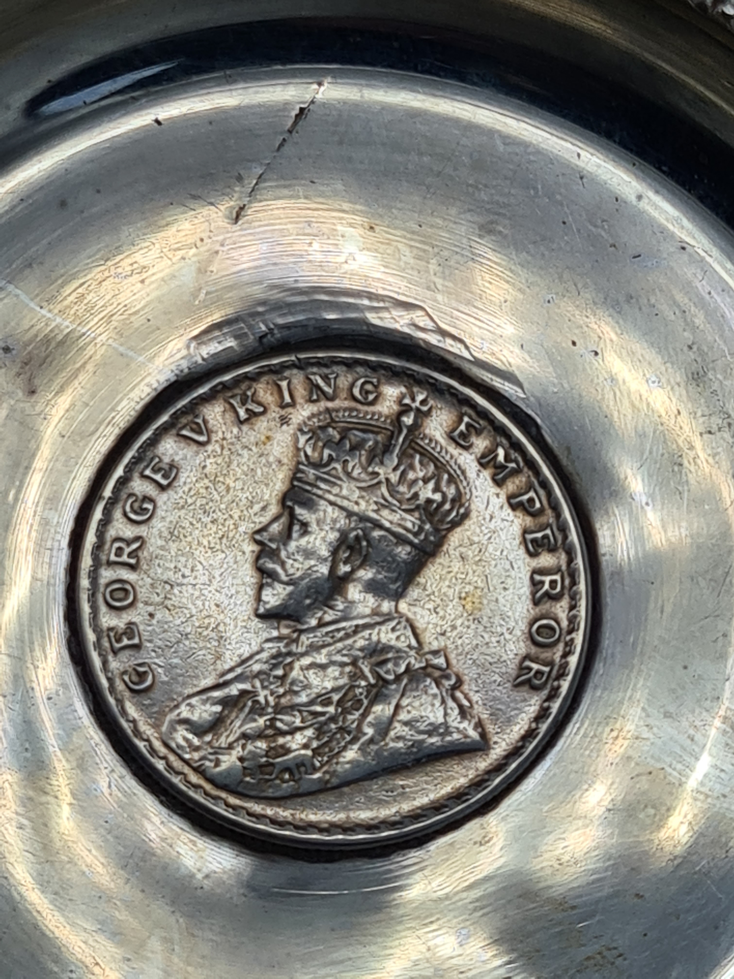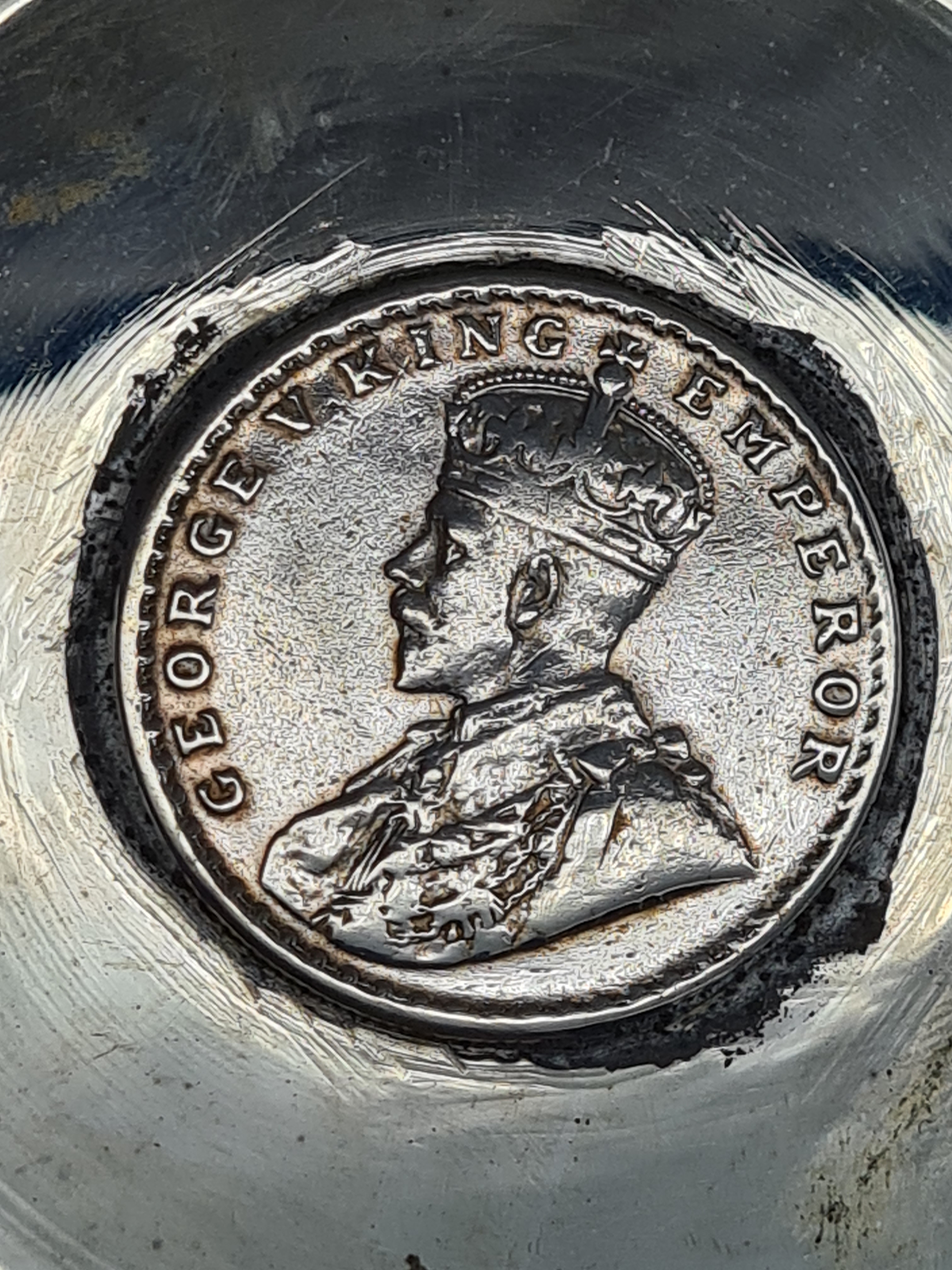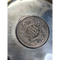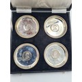 A presentation set of 4x 1 Indian Rupee Coin Silver Dishes, Each dish has an original coin in the middle measures 8cm in diameter by 1 cm high. Dishes are all marked Silver and include years 1917, 1918 & 2 x 1919. The box measures 21cm x 21cm x2.5cm and has a red embossed crown on the lid.