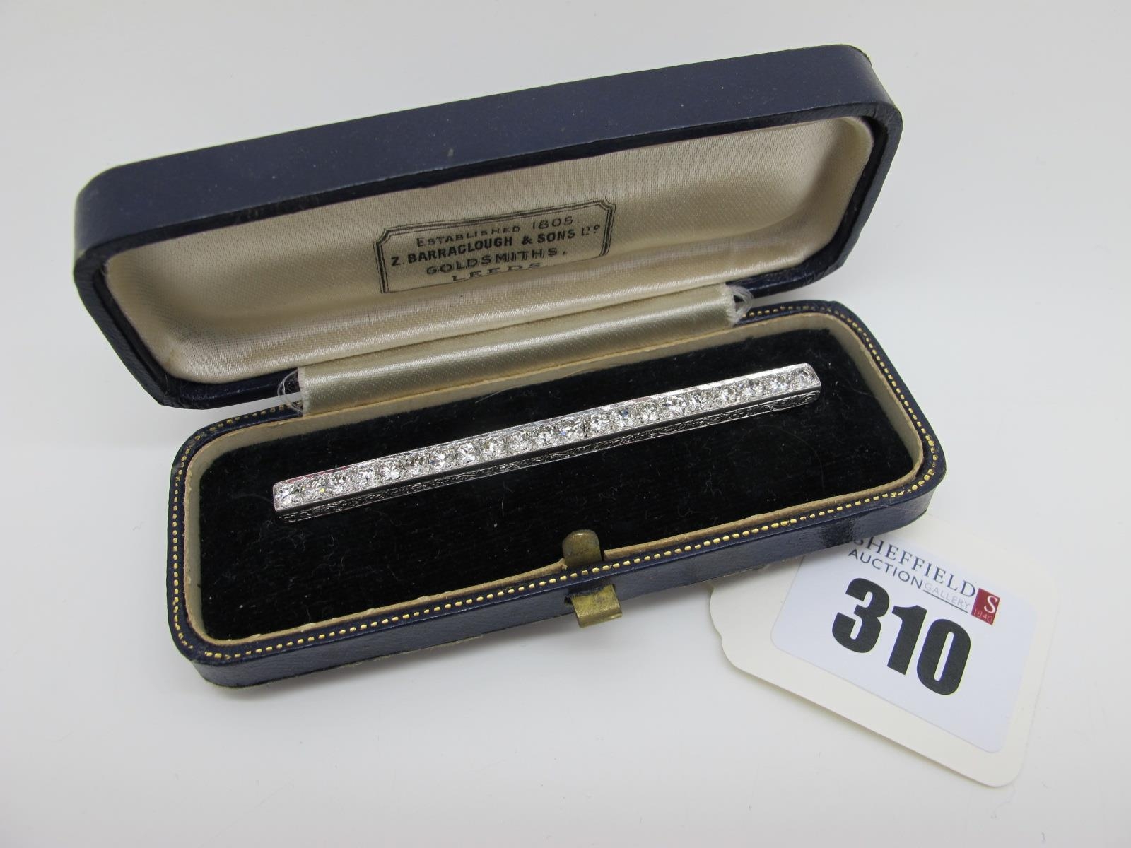 A Decorative c.Early XX Century Diamond Set Bar Brooch, of simple line design, set throughout with twenty one old cut stones, 6.9cm long, in original Z. Barraclough & Sons Ltd Goldsmiths Leeds fitted case.