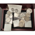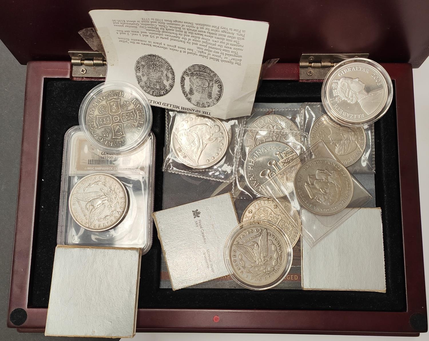 An 1880 USA silver dollar, four £5 crowns, facsimile coins etc
