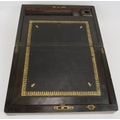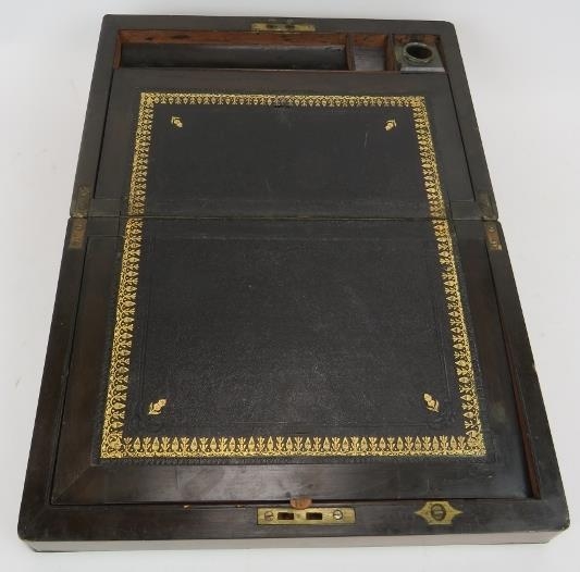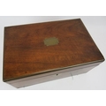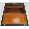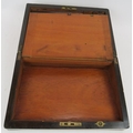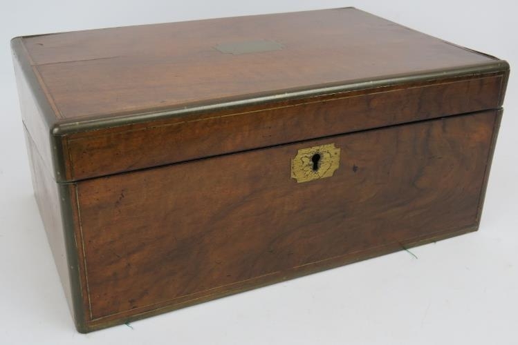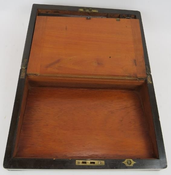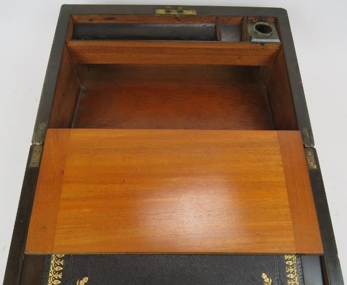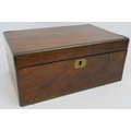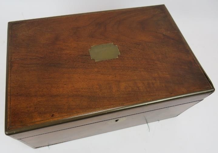 A Victorian mahogany writing slope with brass bound edges and fitted interior. 35cm x 23cm x 16cm.