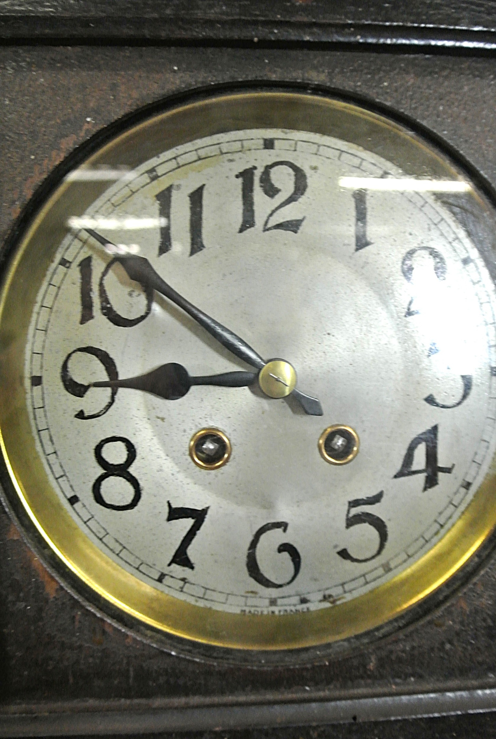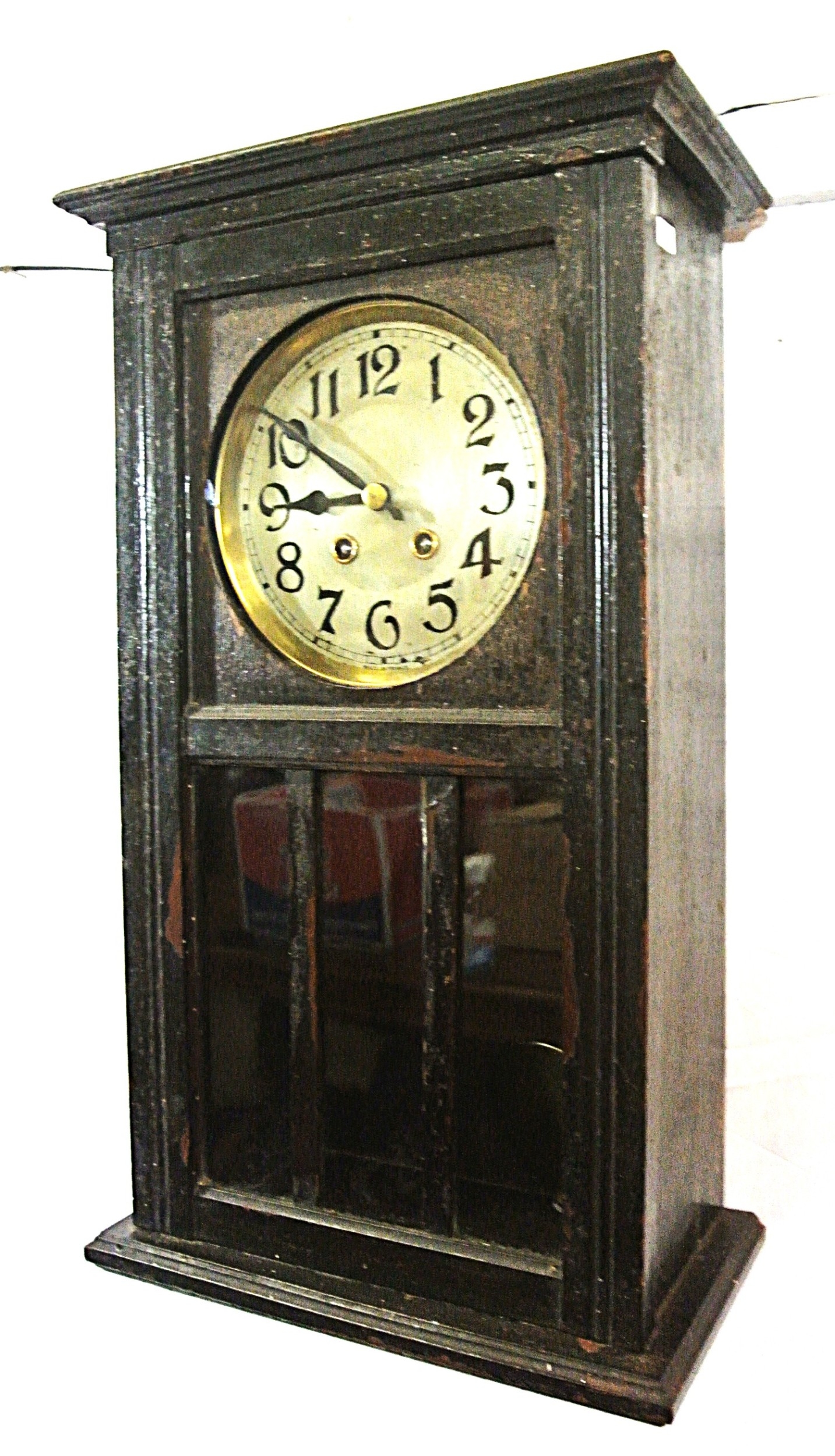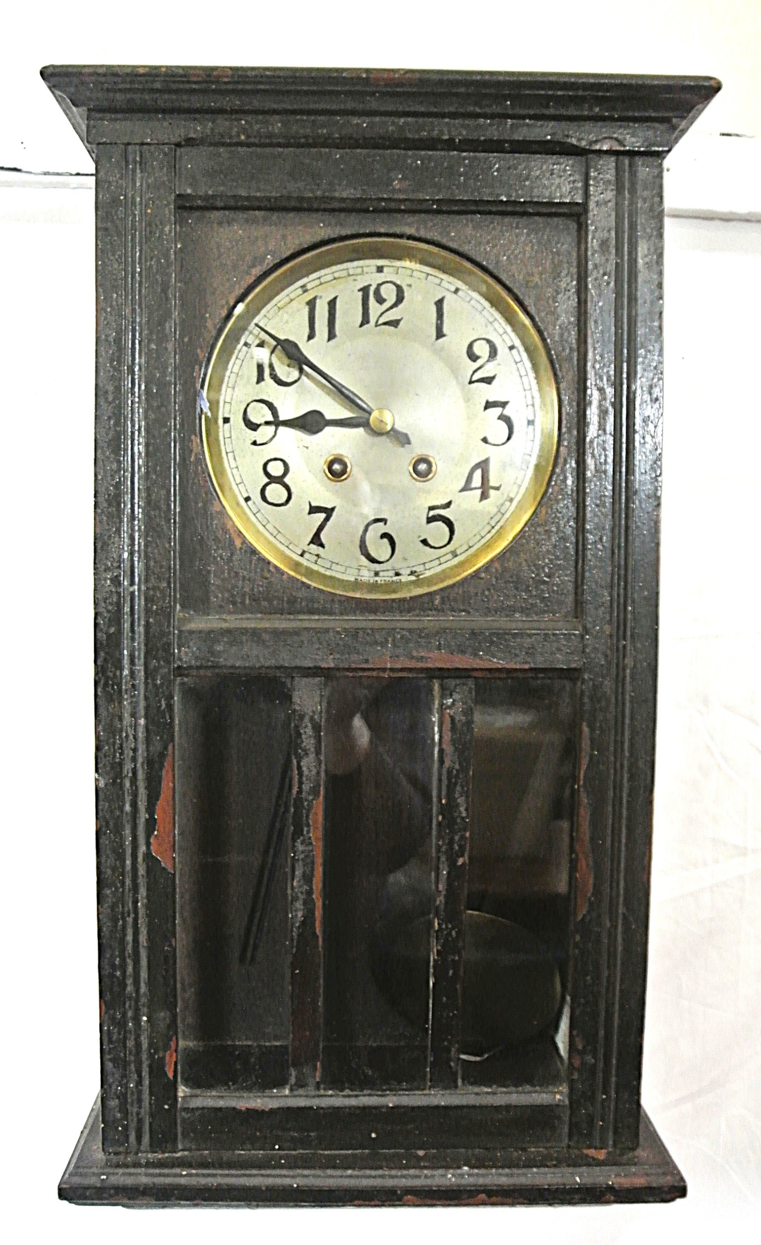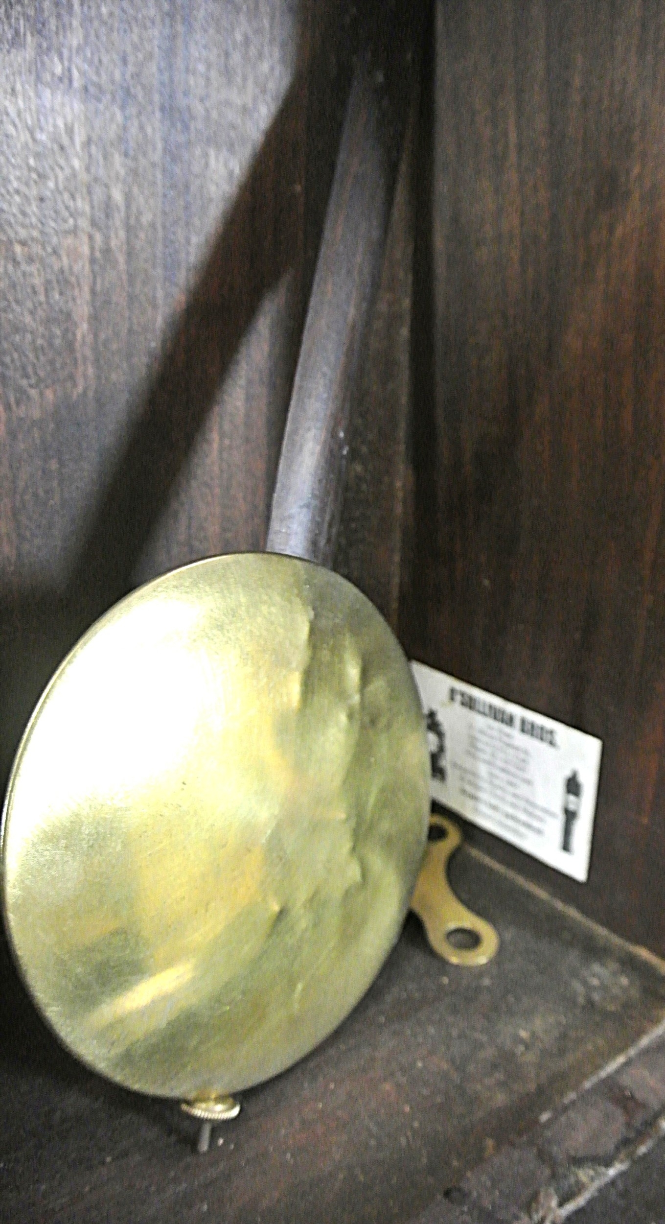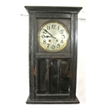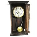 French mahogany 12 hour wall clock with brass framed dial and pendulum