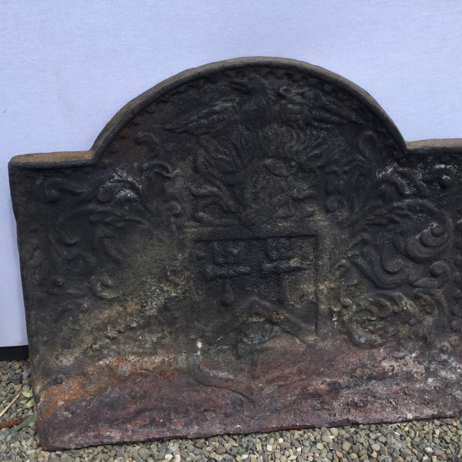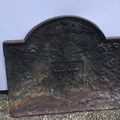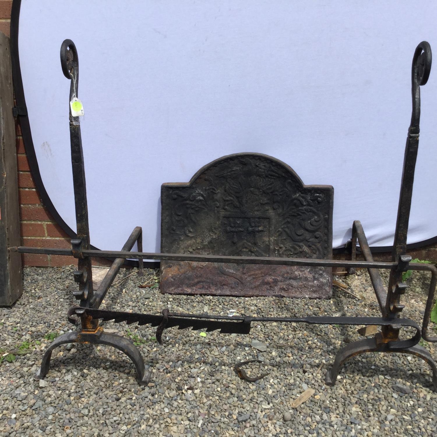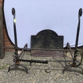 PAIR OF CAST IRON FIRE DOGS, FIRE BACK SPIT AND SWAY