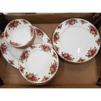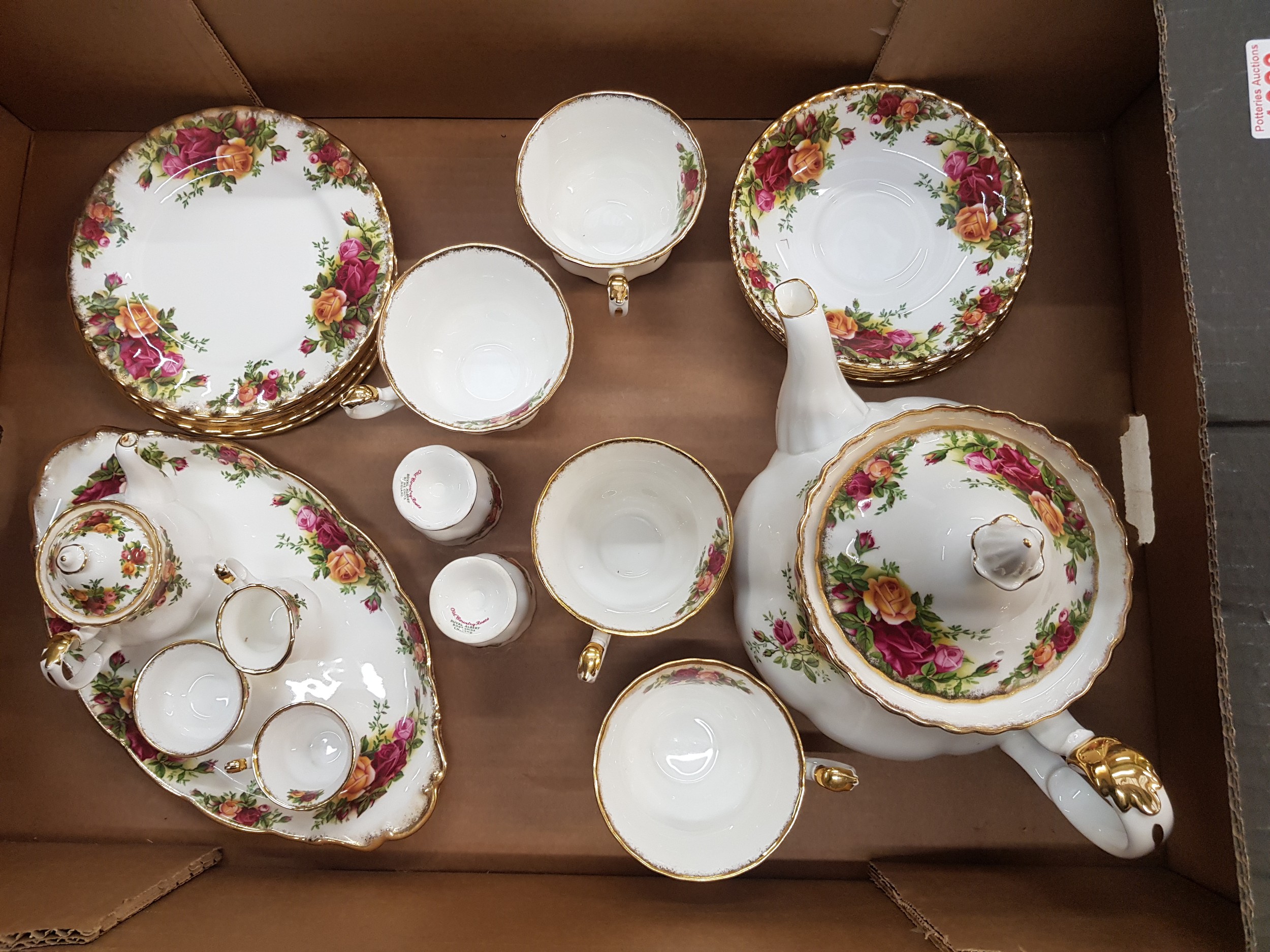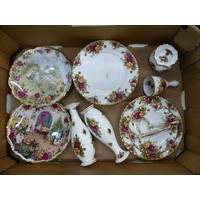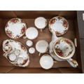Royal Albert tea and dinnerware in the Old Country Roses pattern, to include a large teapot, 4 tea cups, 5 saucers, 6 side plates, 2 egg cups and some miniature tea set items (1 tray).