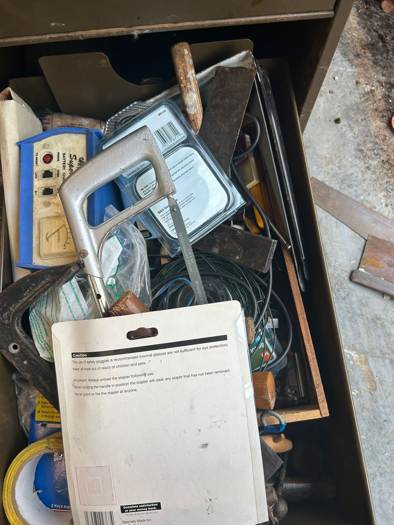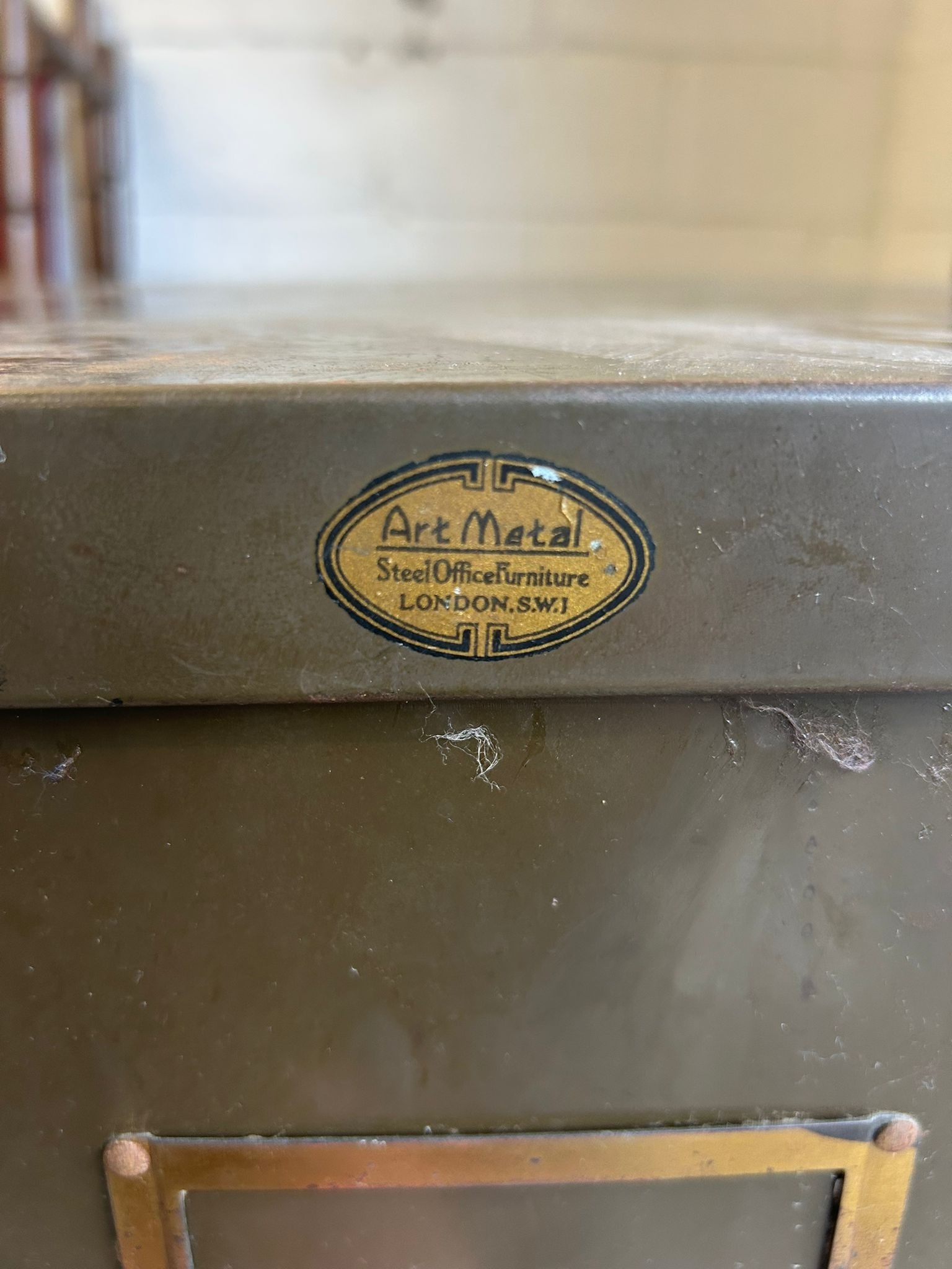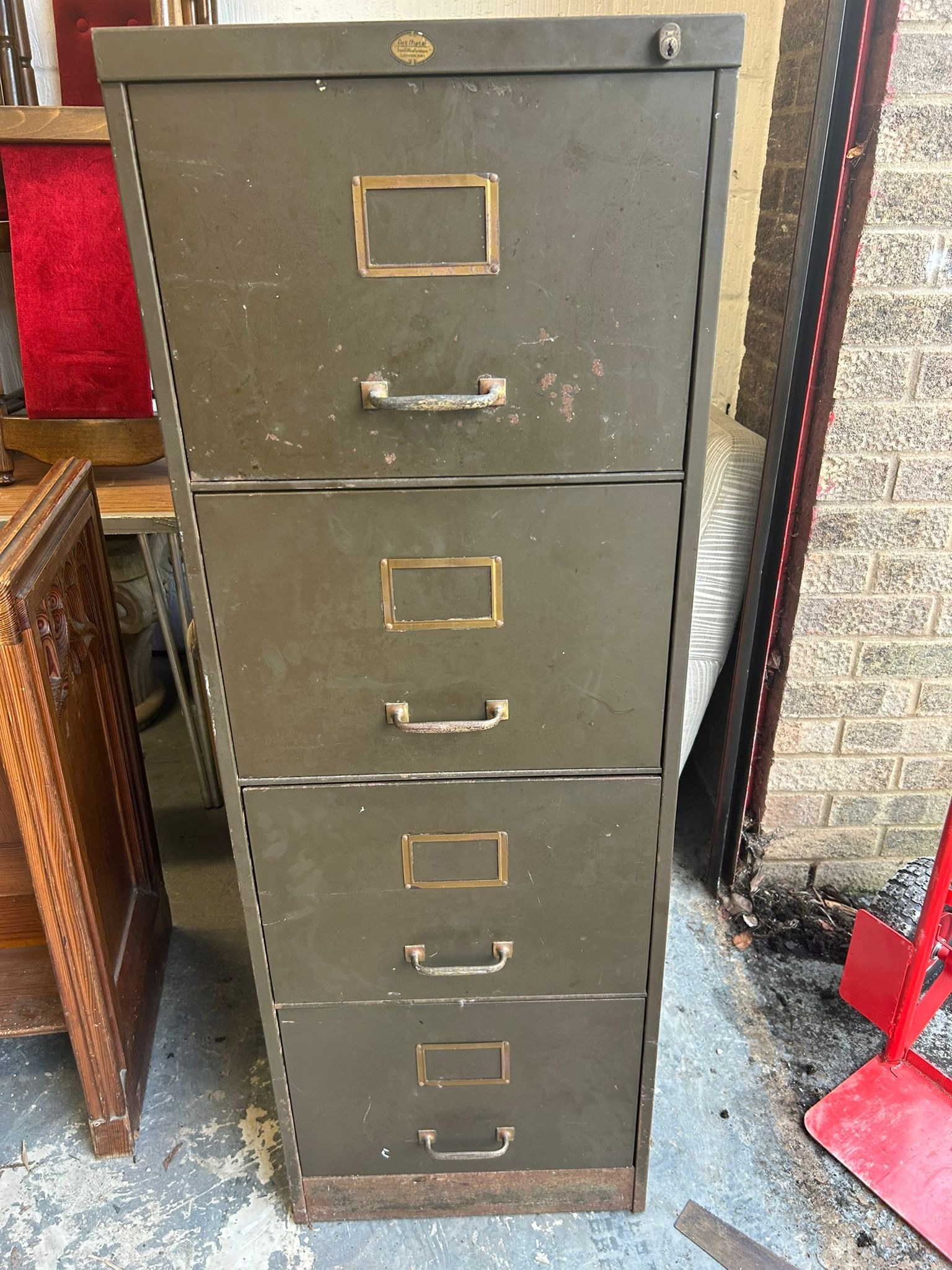 Vintage Art Metal Steel Four-Drawer Filing Cabinet, London S.W.1 full of tools etc