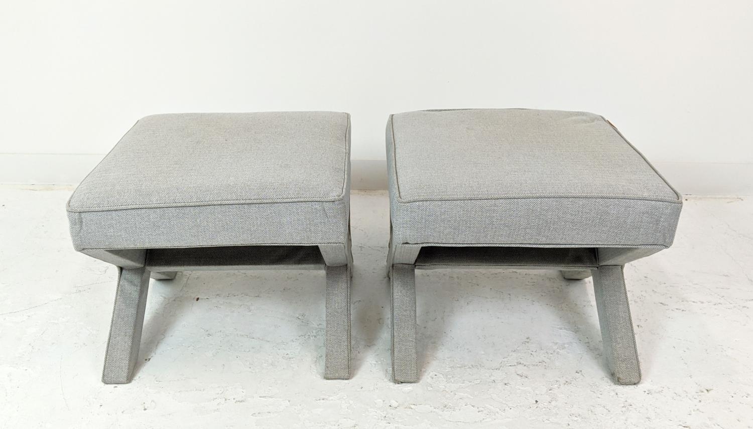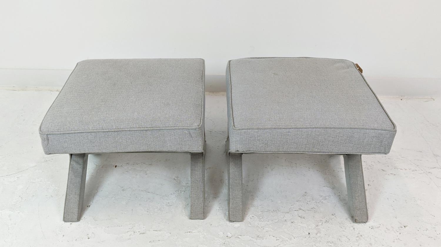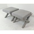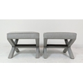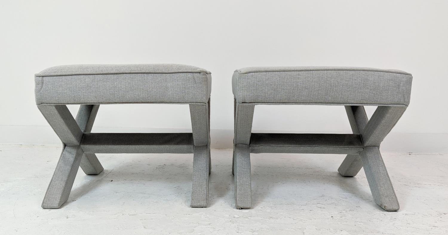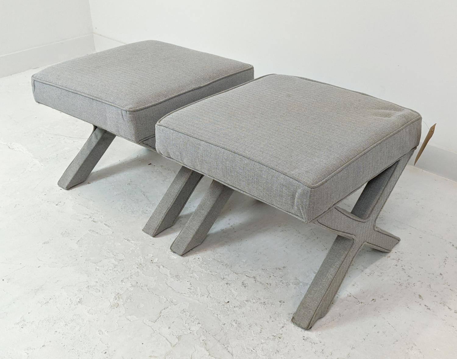 EICHHOLTZ FOOTSTOOLS, a pair, light grey upholstery on x-frame supports, 56cm W x 56cm D x 47cm H. (2)