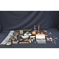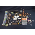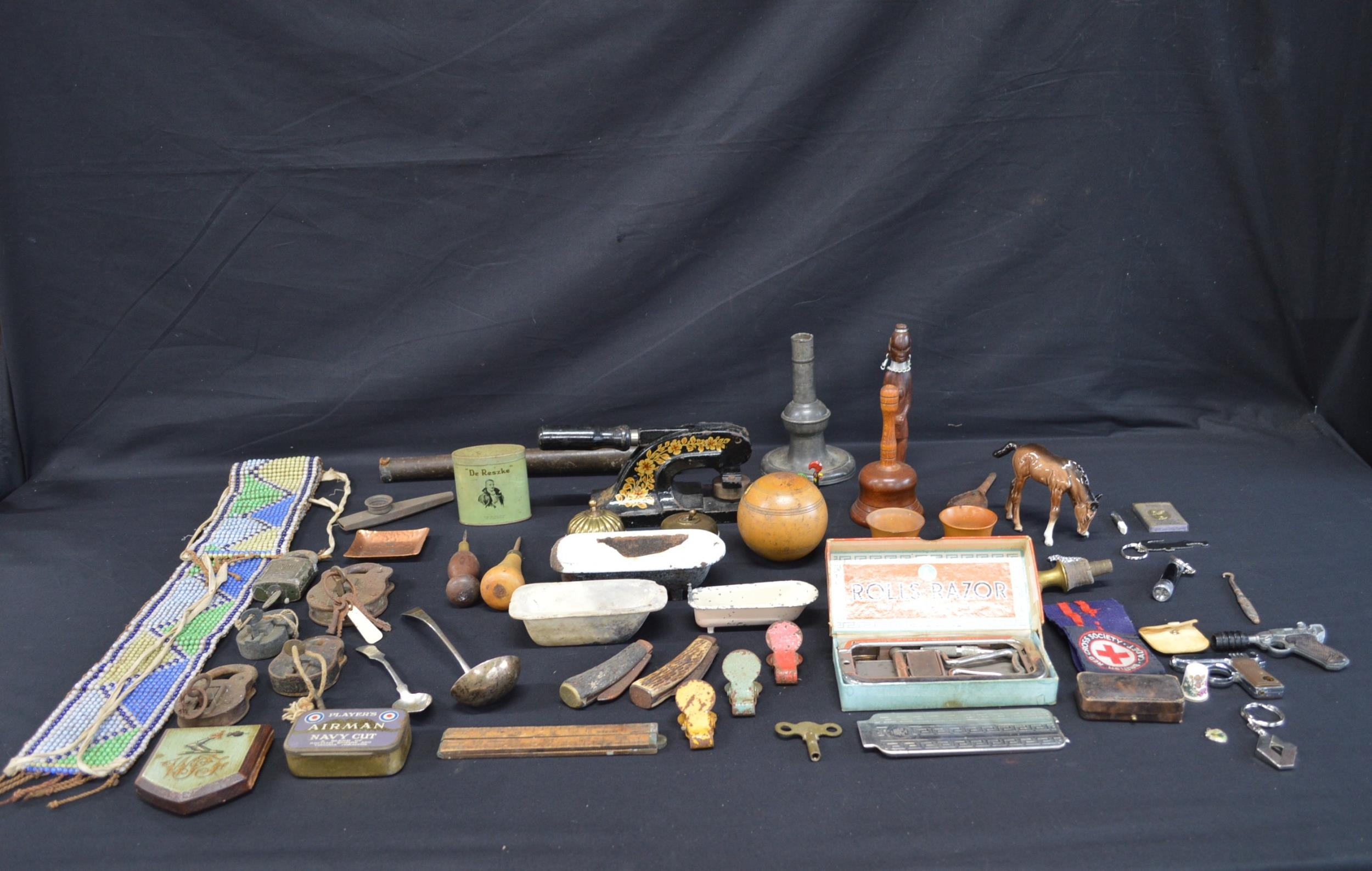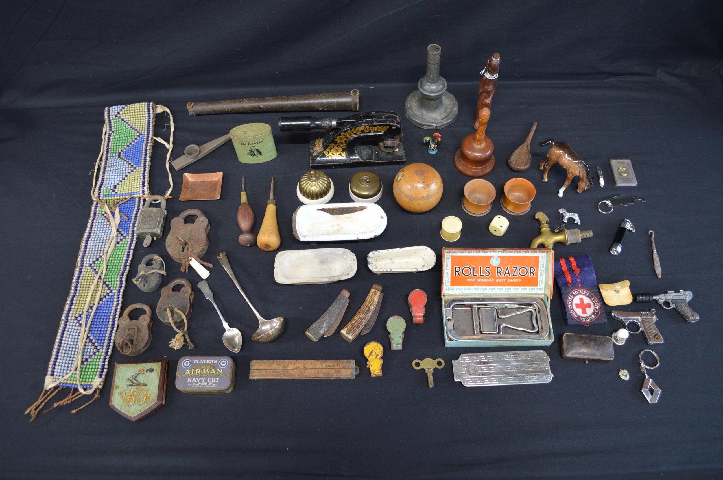 Collection of sundry items to include: glass beadwork belt, padlocks & keys, desk stamp and Rolls razor etc